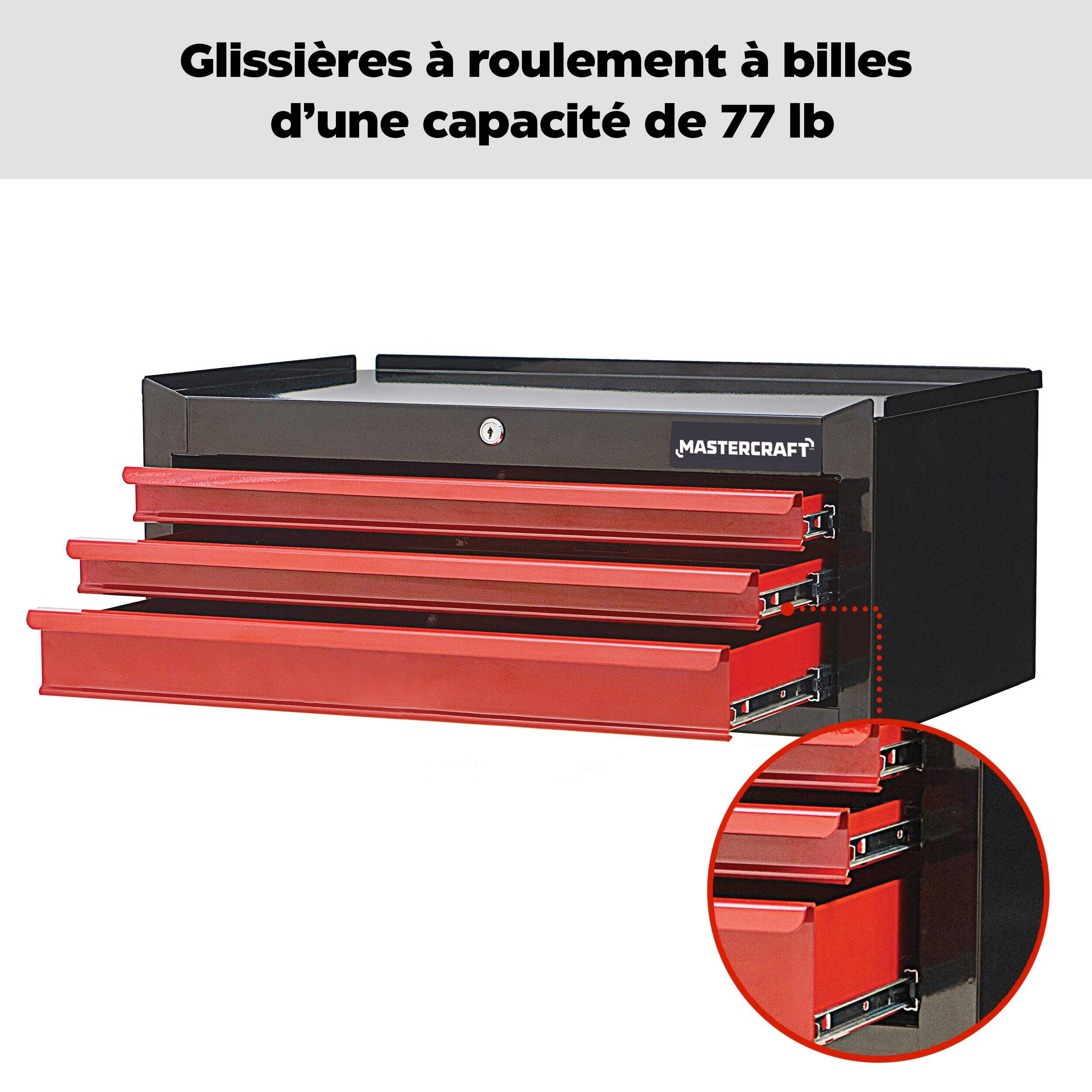Le coffre à outils intermédiaire de 26 po à 3 tiroirs noir et rouge Mastercraft est conçu pour répondre aux besoins de votre atelier. Le coffre peut supporter une capacité totale de 400 lb. Le dessus spacieux de ce coffre à outils peut servir d'espace de travail et peut être facilement empilé avec d'autres unités de rangement Mastercraft pour plus de fonctionnalité. Offert dans une élégante combinaison de couleur noir et rouge, il est un parfait mélange de forme et de fonctionnalité.