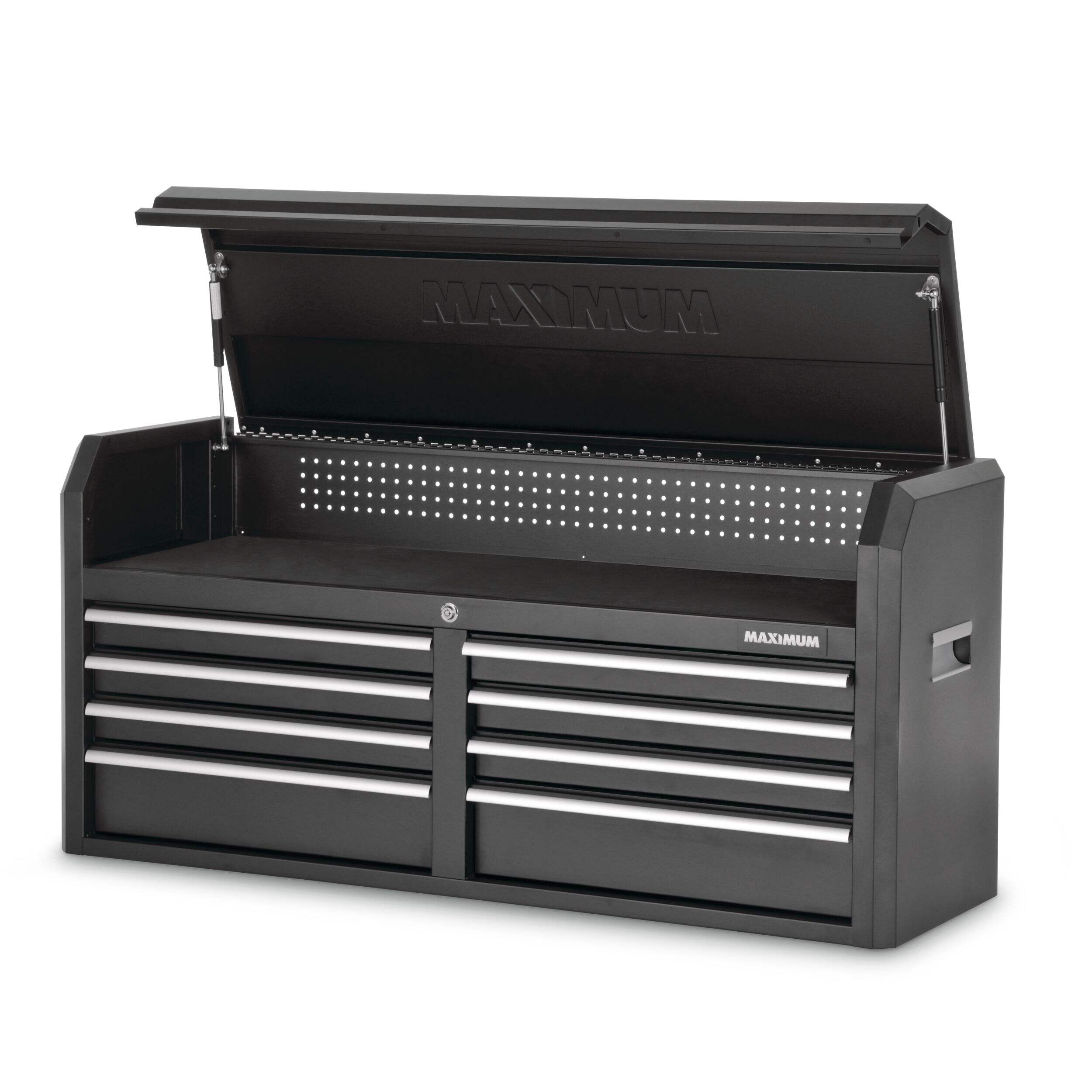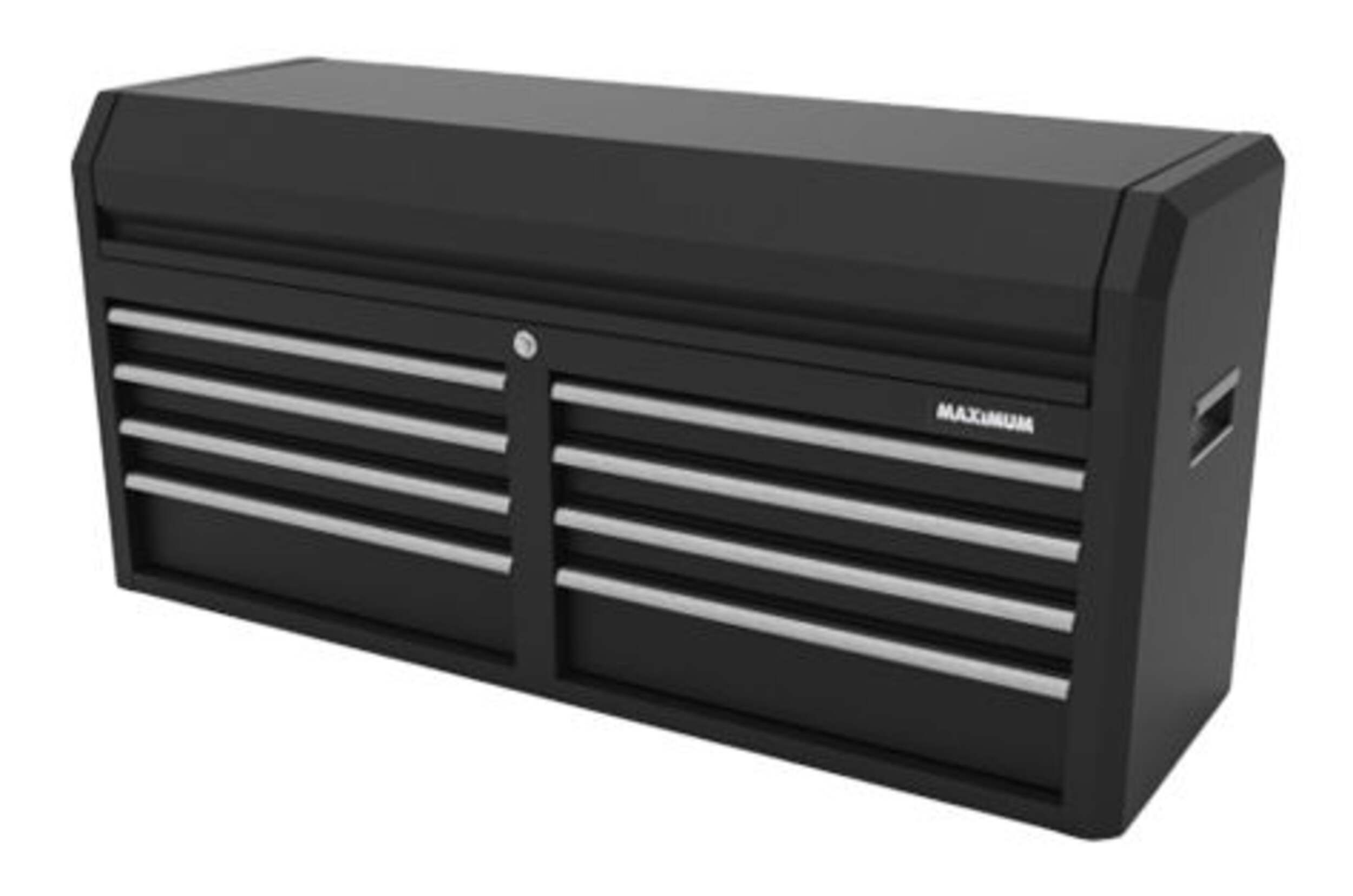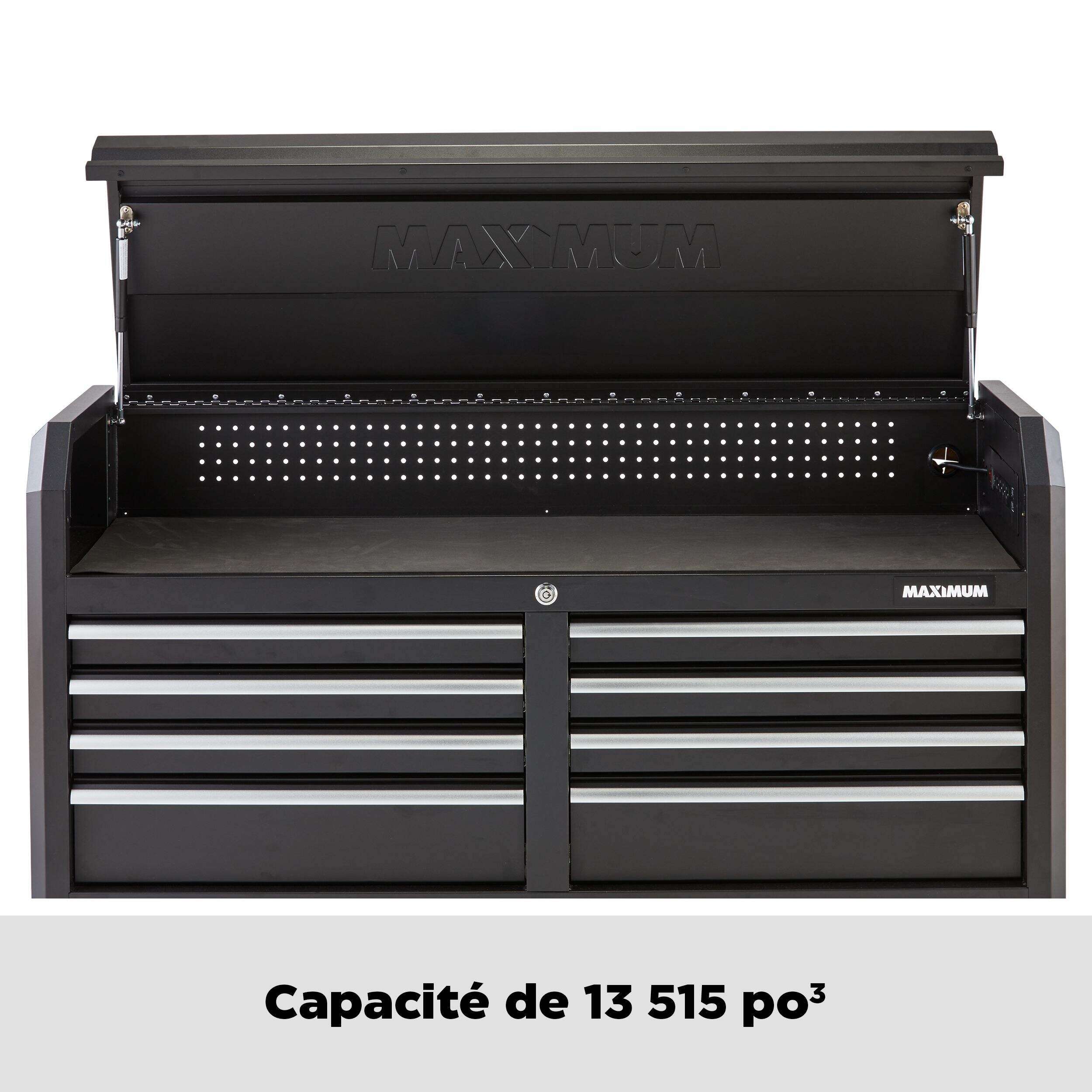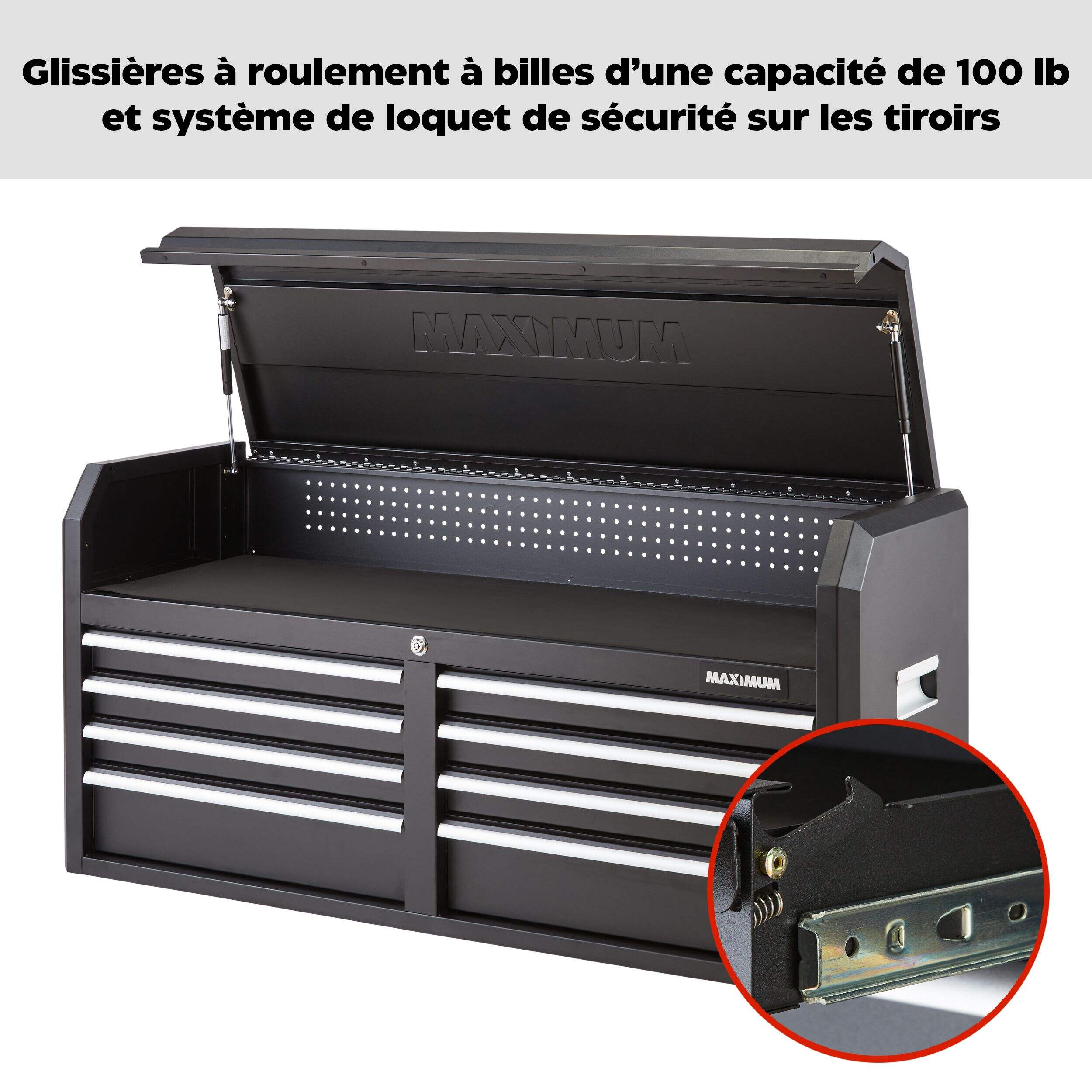 Le coffre à outils à 8 tiroirs MAXIMUM de 56 po est doté d'un système de loquet sécuritaire qui permet de soulever et de retirer le coffre pour protéger son contenu et garder ses tiroirs bien verrouillés. Les glissières de tiroir à roulement à billes de 45,3 kg (100 lb) facilitent l'ouverture et la fermeture des tiroirs de ce coffre à outils MAXIMUM. Le système de verrouillage robuste offre sécurité et protection, tandis que les doublures de tiroir intérieures protègent les tiroirs et les outils qu'ils contiennent. Le coffre à outils est également doté d'un cadre en acier thermolaqué qui ajoute de la rigidité. Une barre d'alimentation intégrée à l'intérieur de la caisse supérieure comprend 4 prises et 2 ports USB pour recharger divers outils électriques, tandis que les vérins à gaz dans le couvercle permettent d'ouvrir et de fermer facilement le coffre.