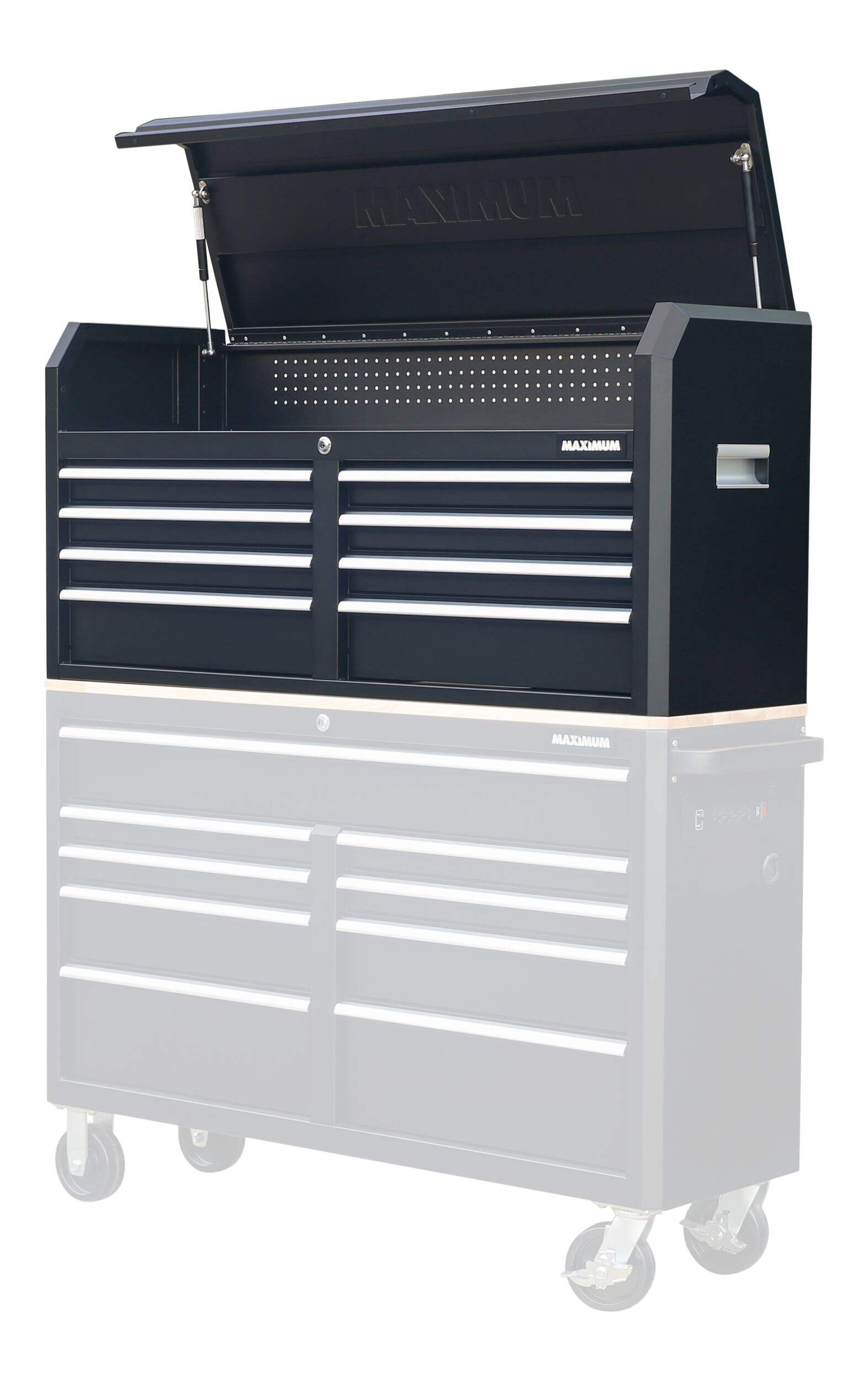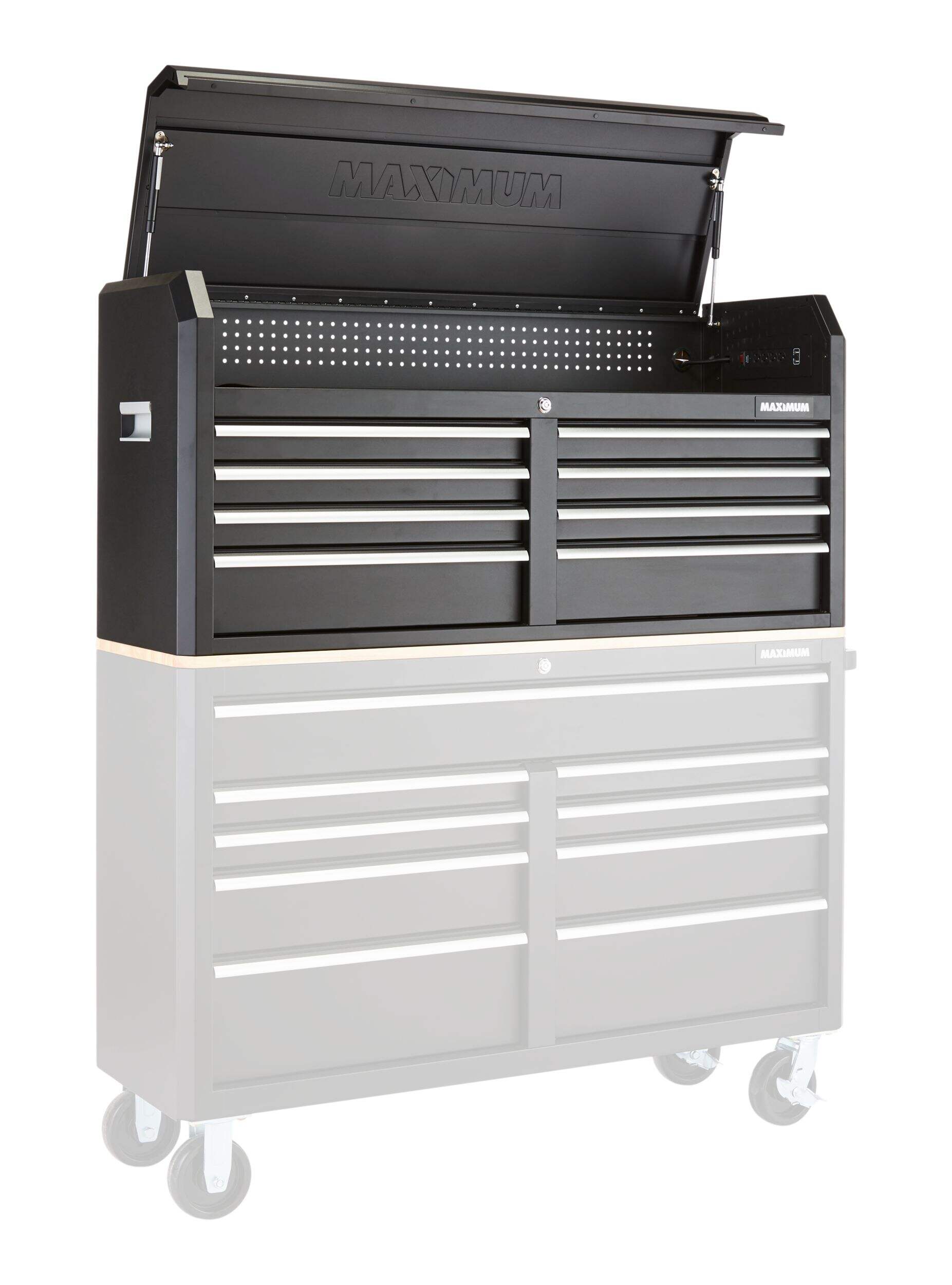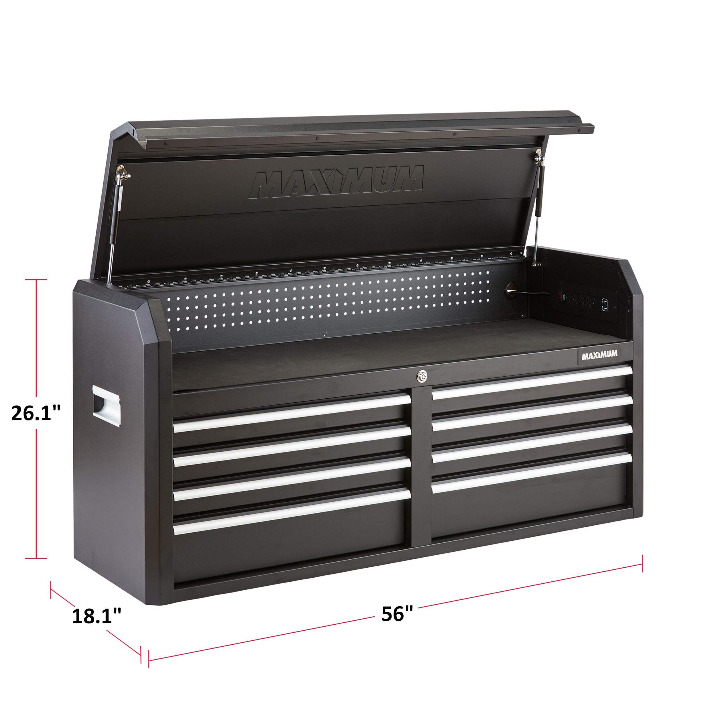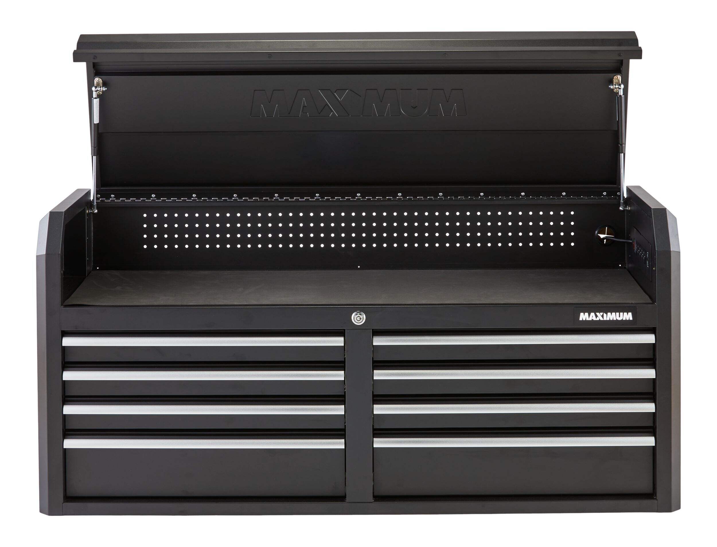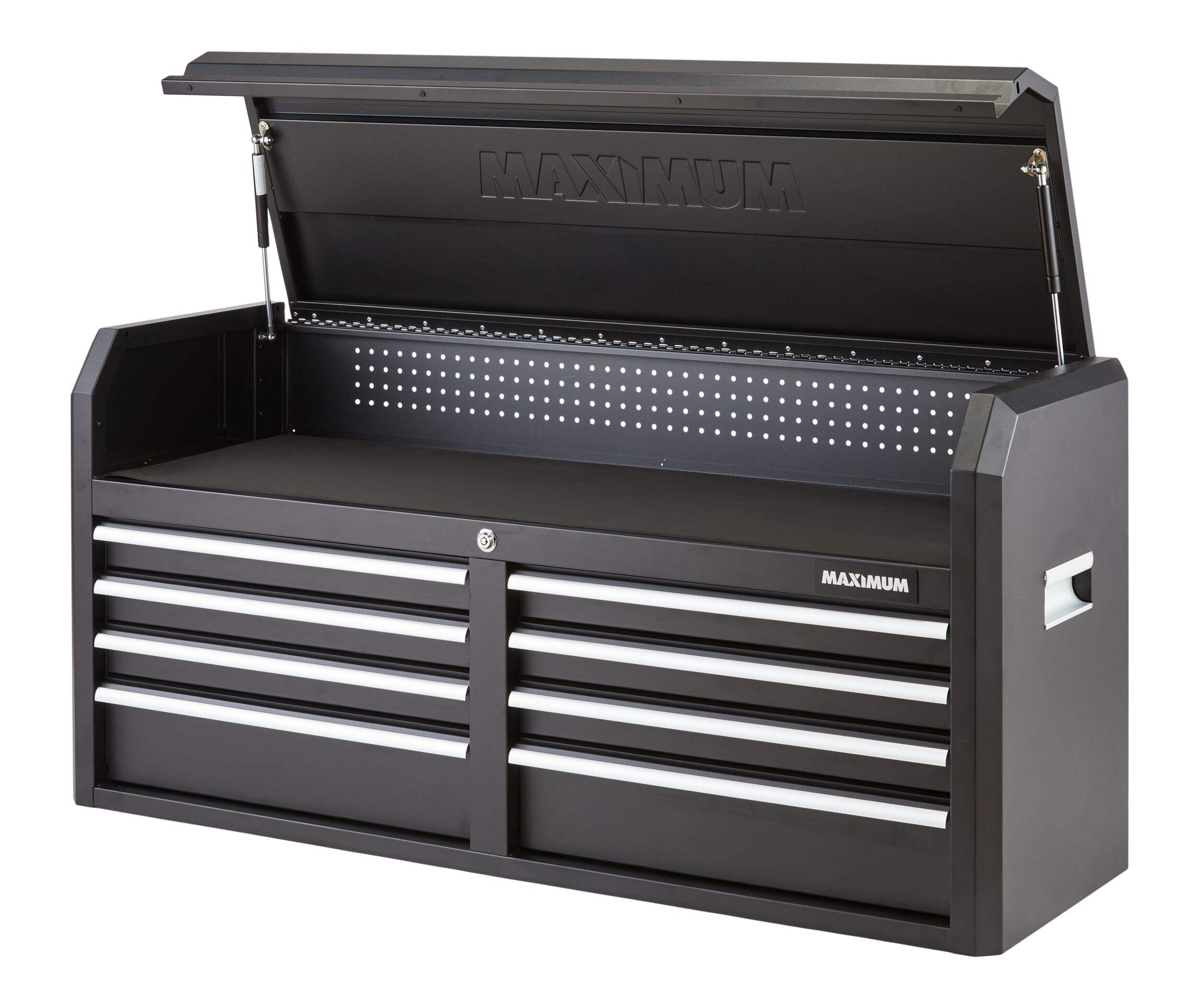 Le coffre à outils à 8 tiroirs MAXIMUM de 56 po est doté d'un système de loquet sécuritaire qui permet de soulever et de retirer le coffre pour protéger son contenu et garder ses tiroirs bien verrouillés. Les glissières de tiroir à roulement à billes de 45,3 kg (100 lb) facilitent l'ouverture et la fermeture des tiroirs de ce coffre à outils MAXIMUM. Le système de verrouillage robuste offre sécurité et protection, tandis que les doublures de tiroir intérieures protègent les tiroirs et les outils qu'ils contiennent. Le coffre à outils est également doté d'un cadre en acier thermolaqué qui ajoute de la rigidité. Une barre d'alimentation intégrée à l'intérieur de la caisse supérieure comprend 4 prises et 2 ports USB pour recharger divers outils électriques, tandis que les vérins à gaz dans le couvercle permettent d'ouvrir et de fermer facilement le coffre.