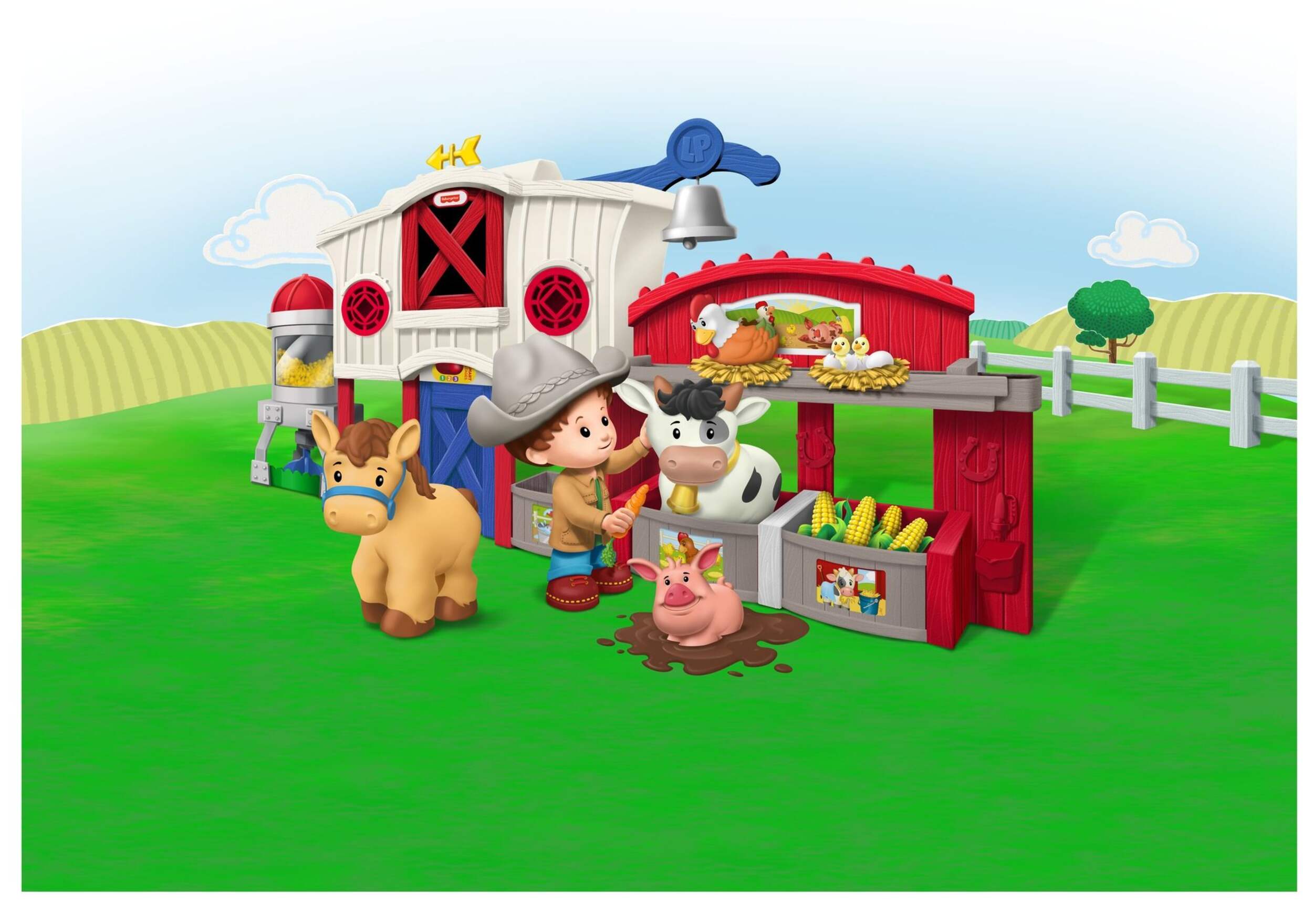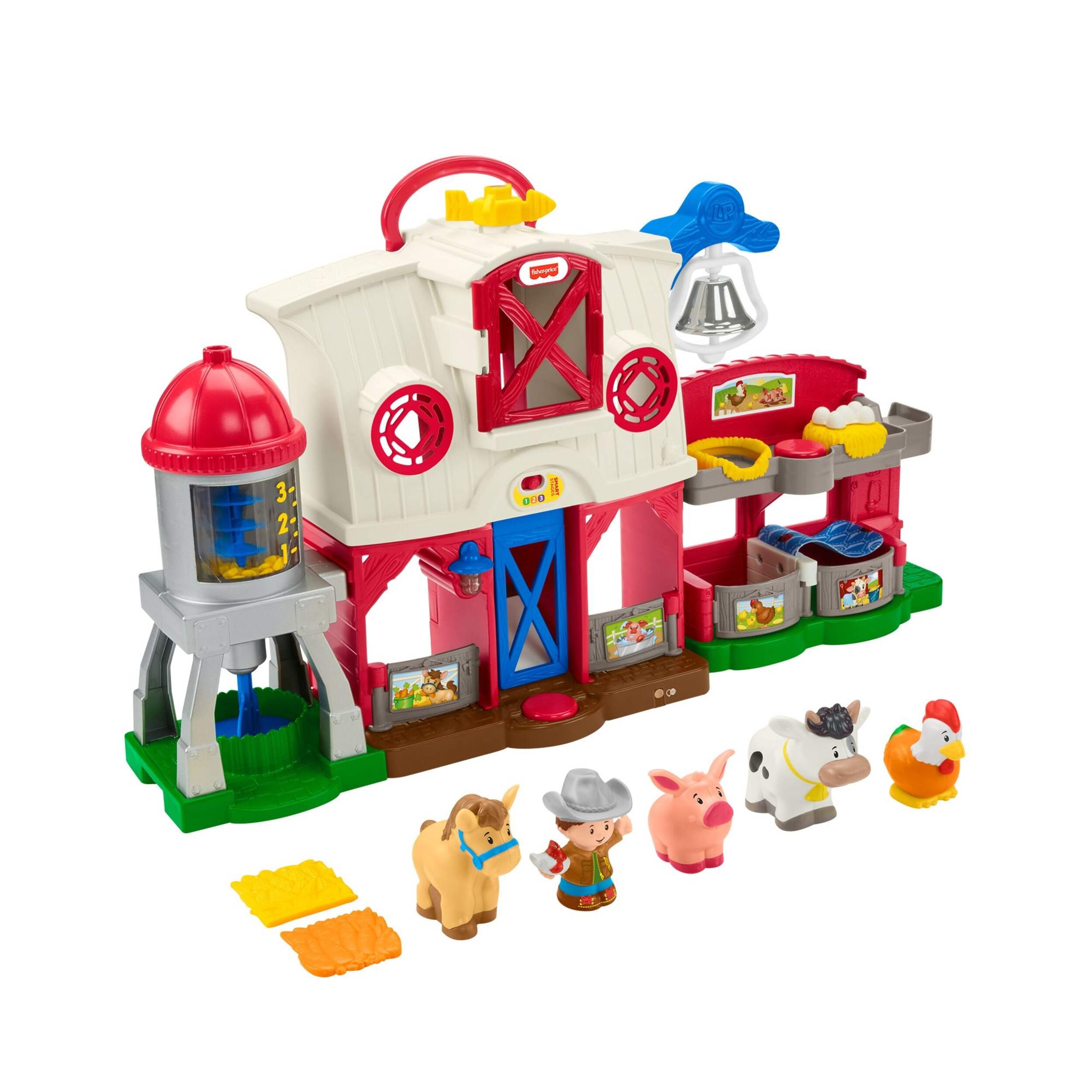 Le coffret Les animaux de la ferme Fisher-PriceMD Little PeopleMD permet aux tout-petits de s'amuser à la ferme. Ce jeu interactif comprend une figurine de fermier et des figurines d'animaux comme un cheval, une vache, un cochon et un mouton avec lesquels on peut jouer dans la grange à deux étages. Appuyez sur les boutons de découverte pour activer des chansons, des sons et des phrases qui apprennent à prendre soin des animaux.