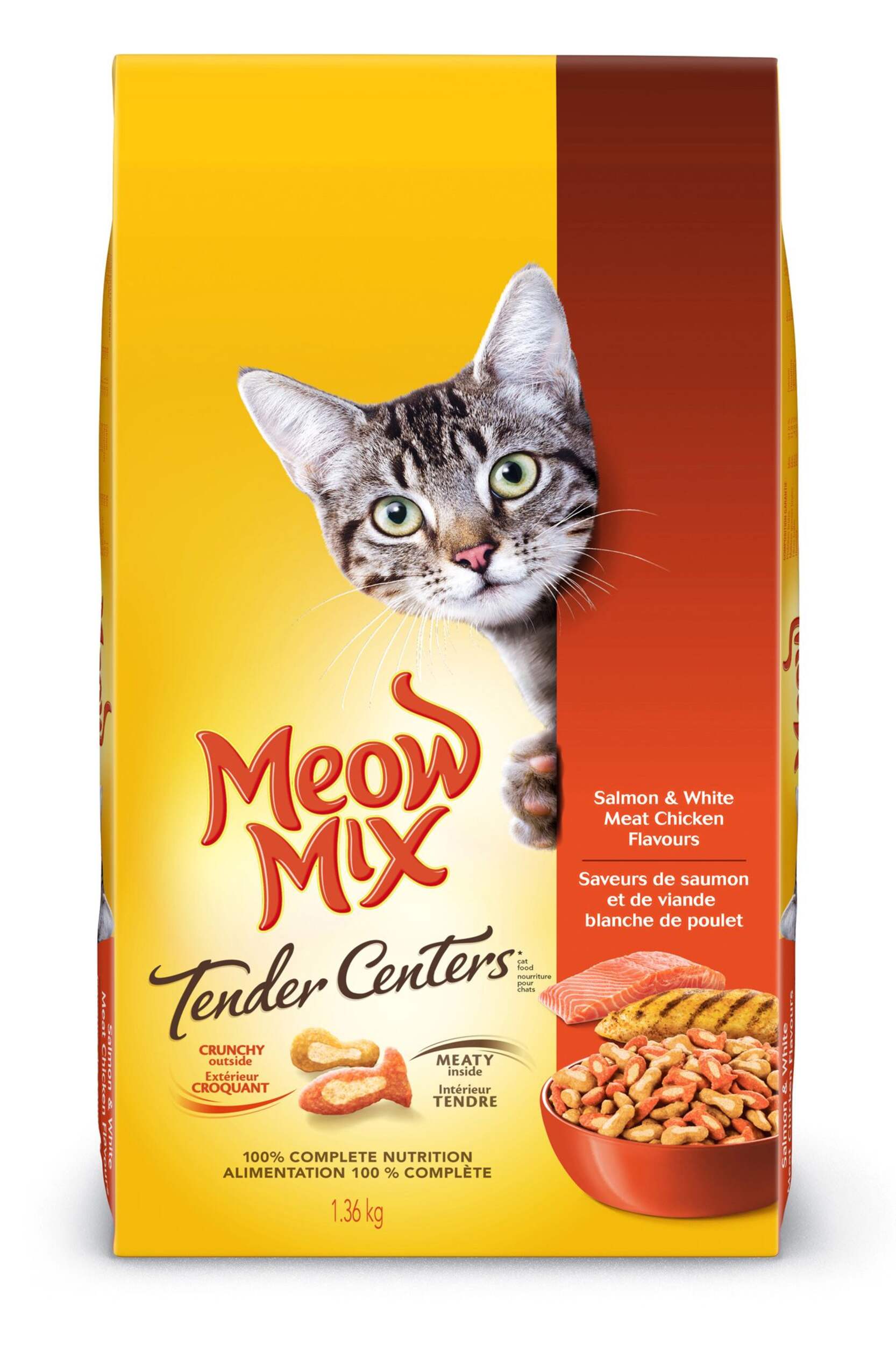Nourriture pour chats Meow Mix Tender Centers combine le goût de viande de la nourriture humide aux éléments nutritifs et à la commodité de la nourriture sèche