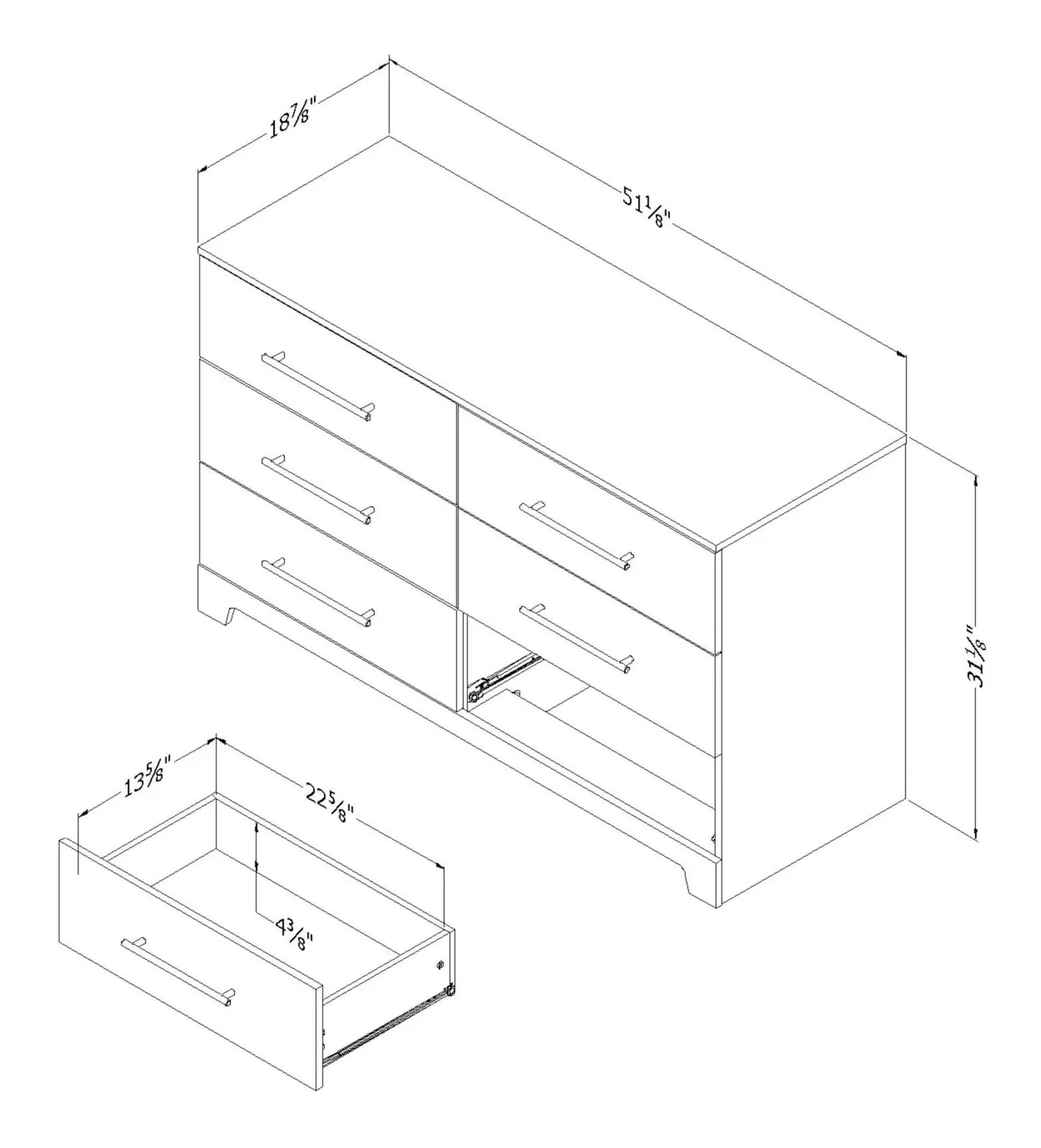 Commode double à 6 tiroirs South Shore Primo qui apporte un style raffiné au rangement de la chambre à coucher. Commode double dotée de 6 tiroirs spacieux offrant amplement d'espace pour les vêtements, la literie et les accessoires. Lignes épurées et poignées simples en métal qui donnent à la collection Primo son style moderne distinctif. Tiroirs qui s'ouvrent en douceur sur des glissières en métal et découpe de plinthe qui ajoute un intérêt visuel au style minimaliste. Matériaux de qualité comme des panneaux de particules stratifiés au fini en mélamine et des pièces en métal qui assurent la durabilité. Instructions d'assemblage et outils inclus pour une installation facile. Avec sa grande capacité de rangement et son style sophistiqué, cette commode garde les chambres bien organisées avec une élégance discrète.