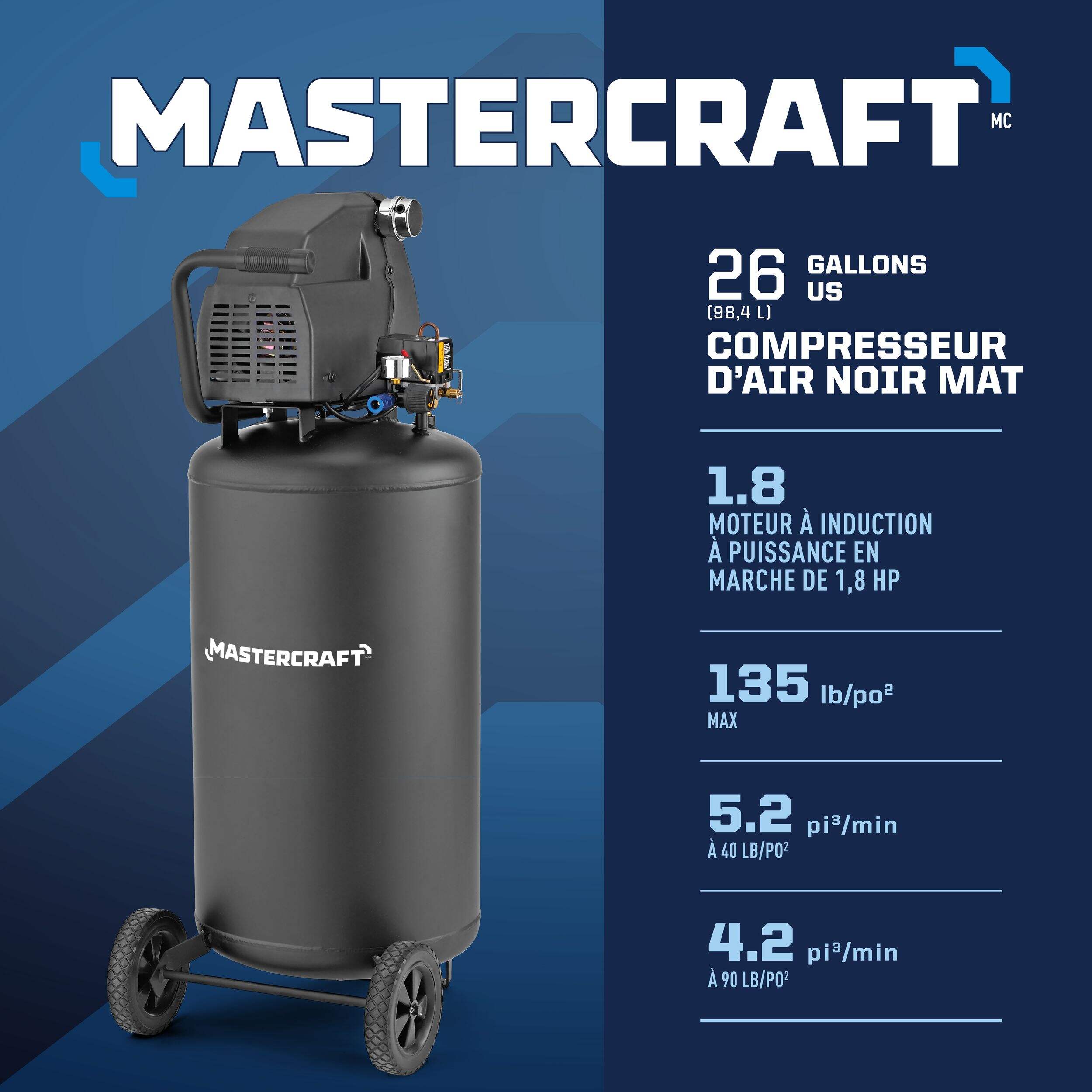 Accomplissez vos tâches de bricolage à la maison ou occupez-vous des tâches de travail facilement avec le compresseur pneumatique sans huile Mastercraft. Sa pompe sans huile et son filtre à air en métal durable réduisent l'entretien et le moteur à induction de 1,8 HP est assez puissant pour faire fonctionner vos cloueuses, clés et autres outils pneumatiques. Conçu avec des touches de qualité, ce compresseur de 26 gallons est prêt pour des années de service fiable dans votre garage, atelier ou chantier.