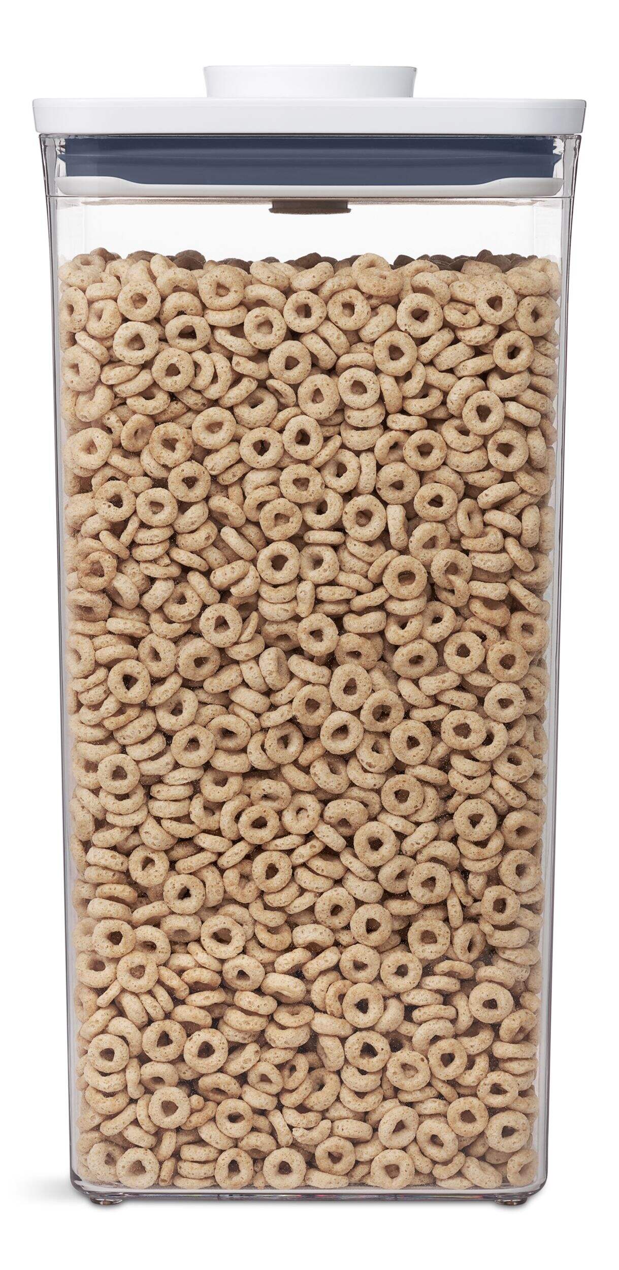 Contenants carrés haut sans BPA pour garde-manger OXO qui offrent une fermeture hermétique en appuyant sur un bouton