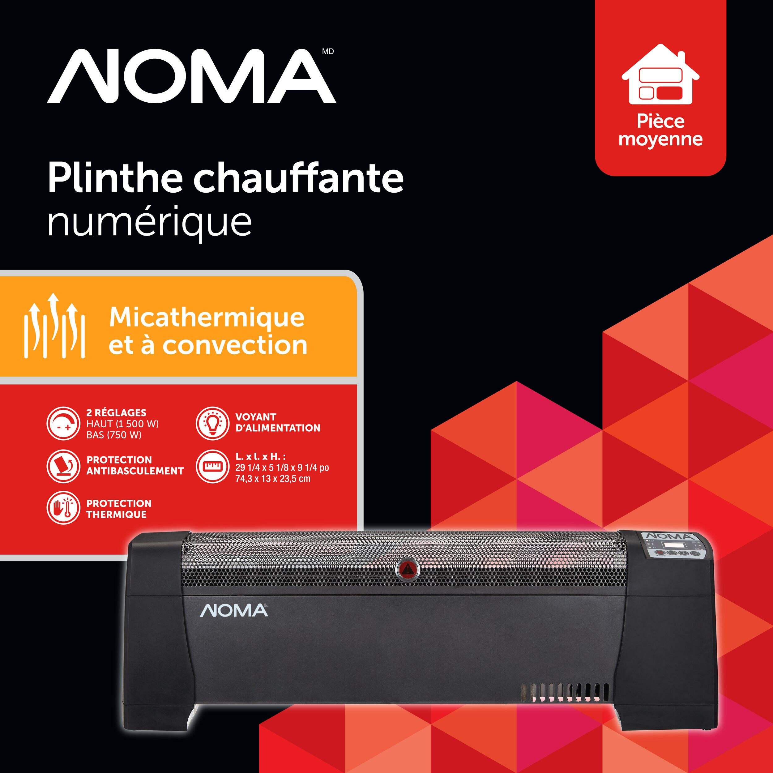 Le convecteur de plinthe numérique NOMA a une apparence élégante et épurée qui s'installe directement sur vos plinthes. Ce petit radiateur de maison fonctionne silencieusement, donc vous ne le remarquerez pas en regardant la télévision ou en profitant de moments passés avec vos proches. Le corps de l'appareil, frais au toucher, ne présente aucun danger au toucher; vous pouvez donc le déplacer d'une pièce à l'autre selon vos besoins. Il est également doté de panneaux d'extrémité anti-bosses qui lui permettent de conserver son apparence au fil du temps.
