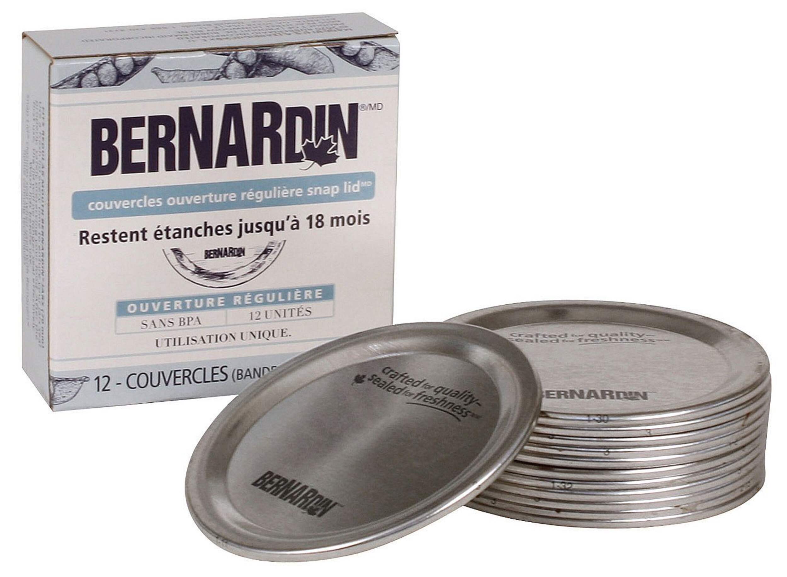 Conservez vos aliments frais avec les couvercles de bocaux Mason à ouverture standard Bernardin. Compatibles avec tous les bocaux Mason en verre à ouverture standard Bernardin, ces couvercles bocaux de mise en conserve offrent la qualité d'étanchéité éprouvée par ceux qui font conserves depuis des générations, ce qui empêche l'oxygène de pénétrer dans le pot de conserve pour que vos aliments restent préservés comme vous les avez créés. Que vous souhaitiez conserver la confiture pour de longues périodes ou conserver de la vinaigrette fraîchement préparée pour la semaine à venir, les couvercles des bocaux Mason Bernardin emprisonnent la fraîcheur pour préserver le goût de vos aliments. Couvercles de ces bocaux Mason en métal qui sont sans BPA. Pour la mise en conserve, les couvercles ne doivent être utilisés qu'une seule fois.