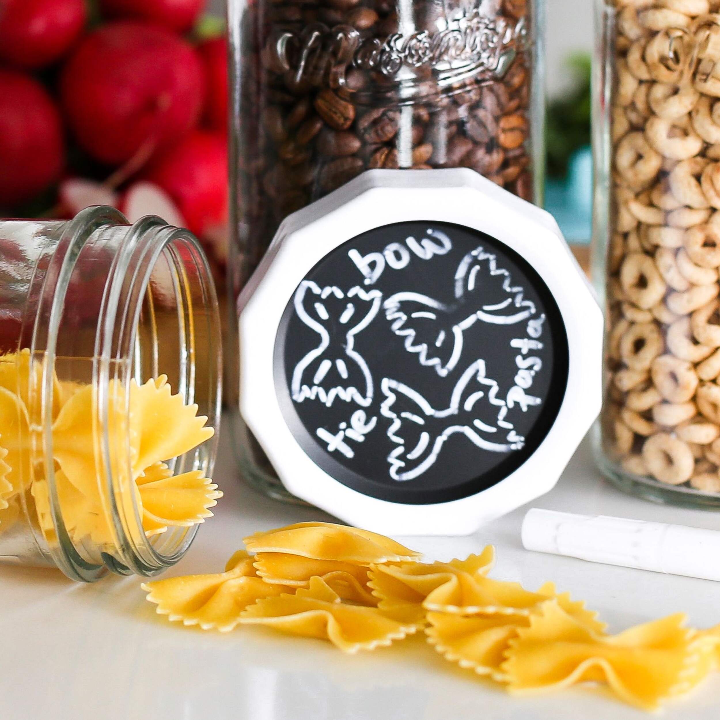 Ces craies sont parfaites pour organiser les ingrédients et les épices de votre cuisine tout en ajoutant un peu de plaisir. Le paquet de huit couvercles réutilisables se visse simplement à vos bocaux Mason sans gaspiller de couvercles de mise en conserve, les transformant en tableaux pour l’étiquetage. Utilisez-les pour étiqueter clairement les produits secs comme la farine, le sucre et le riz, ou les épices comme le paprika, l'origan et le thym. Il suffit d'essuyer avec un linge humide pour mettre à jour vos étiquettes au besoin. Elles sont faites de matériaux sans BPA, ce qui vous permet de les réutiliser de temps en temps pour un garde-manger organisé et élégant.