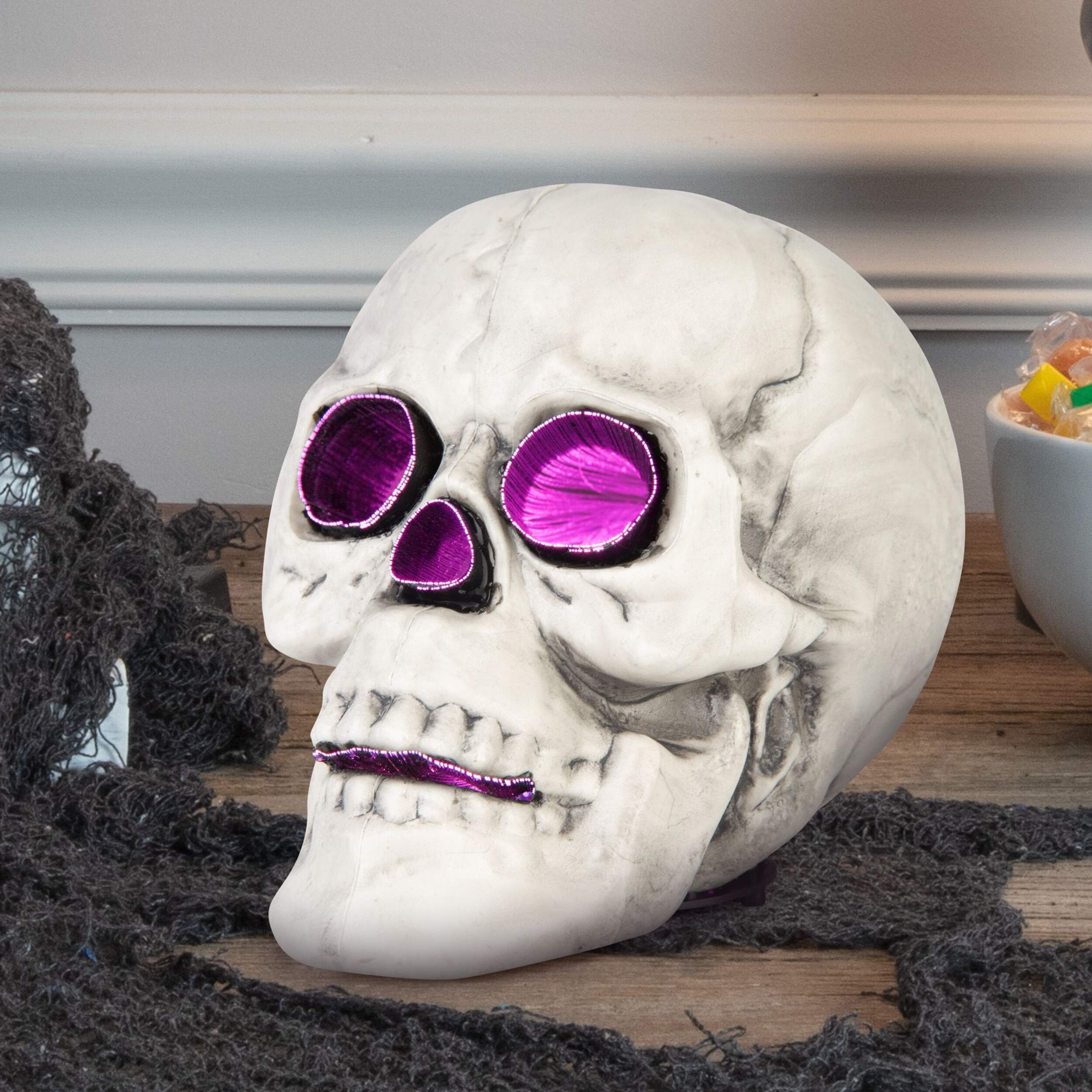 Crâne lumineux à fibre optique à DEL Gemmy qui est un crâne brossé gris