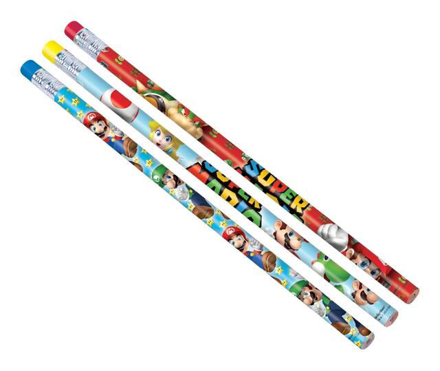 Crayons Super Mario en 3 modèles ornés des personnages de Mario, Luigi, Yoshi, Toad et Princess Peach