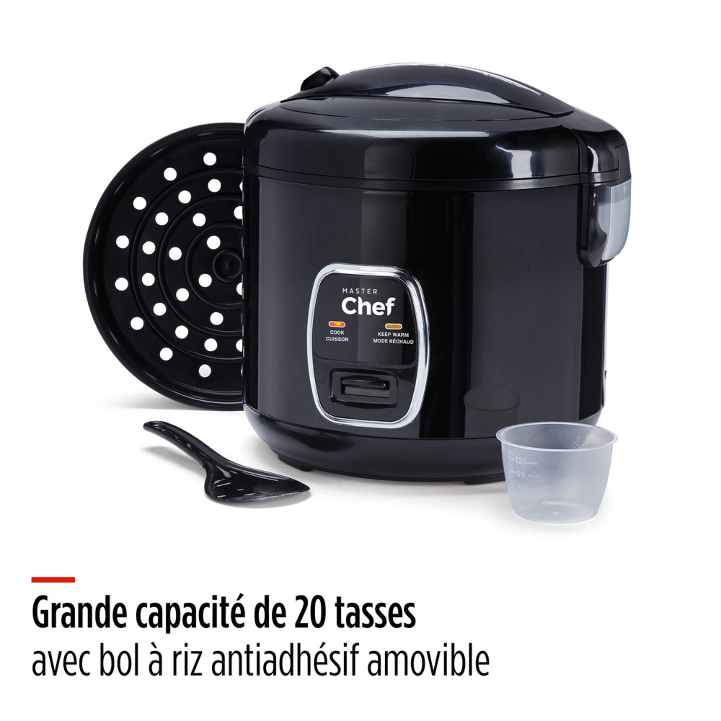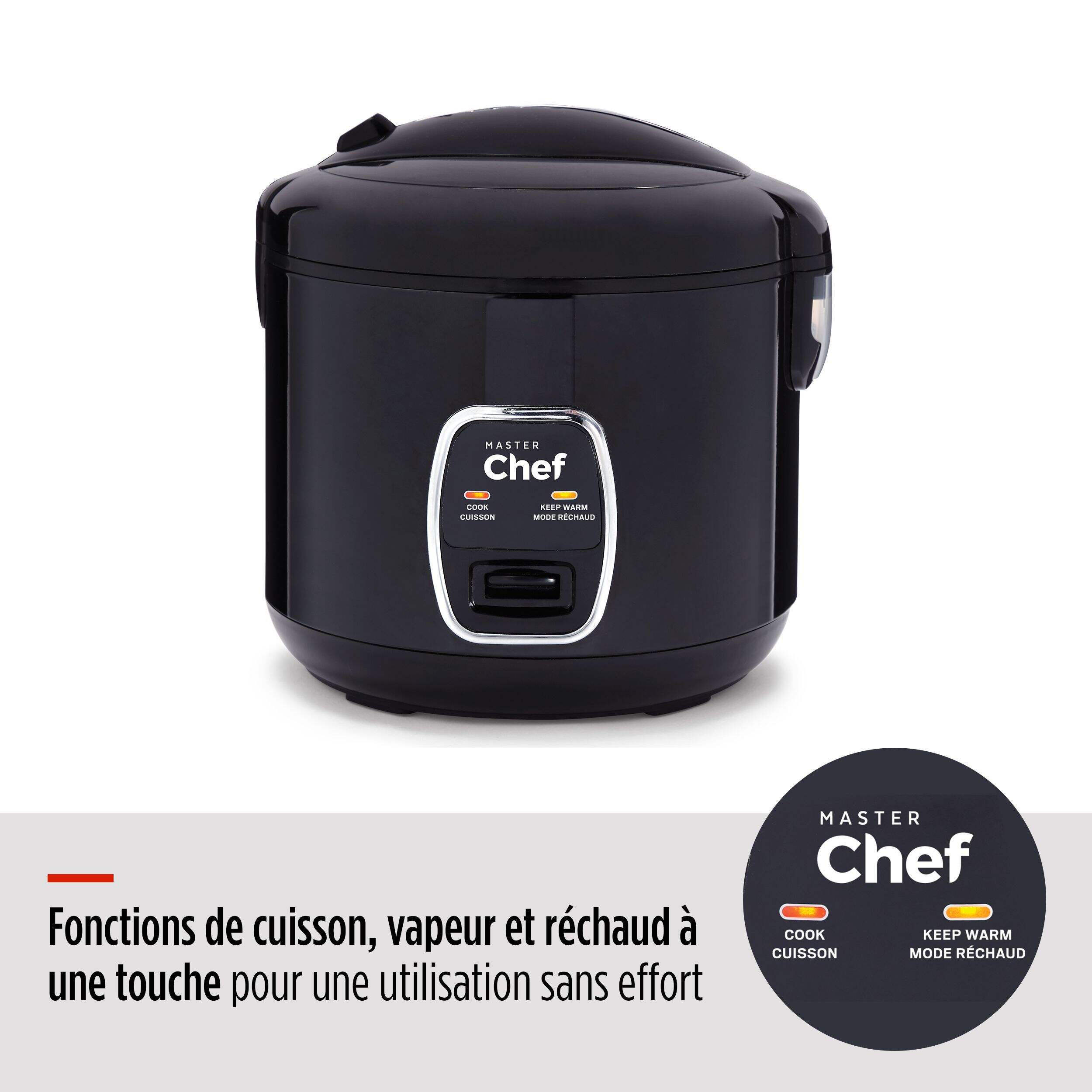 Cuiseur à riz antiadhésif à une touche MASTER Chef avec étuveuse qui vous permet de savourer facilement du riz cuit à la perfection à chaque repas. Ce grand cuiseur à riz est idéal pour les soupers de famille ou pour les réceptions. Le couvercle se verrouille et se scelle pour une cuisson sans effort, le panier de cuisson à la vapeur inclus vous permettant de cuire des légumes et d'autres aliments en même temps pour plus de commodité. Ce cuiseur à riz facile à utiliser fonctionne d'une simple pression sur un bouton et est doté d'un collecteur de débordement d'amidon pour garder votre riz doux, moelleux et délicieux.