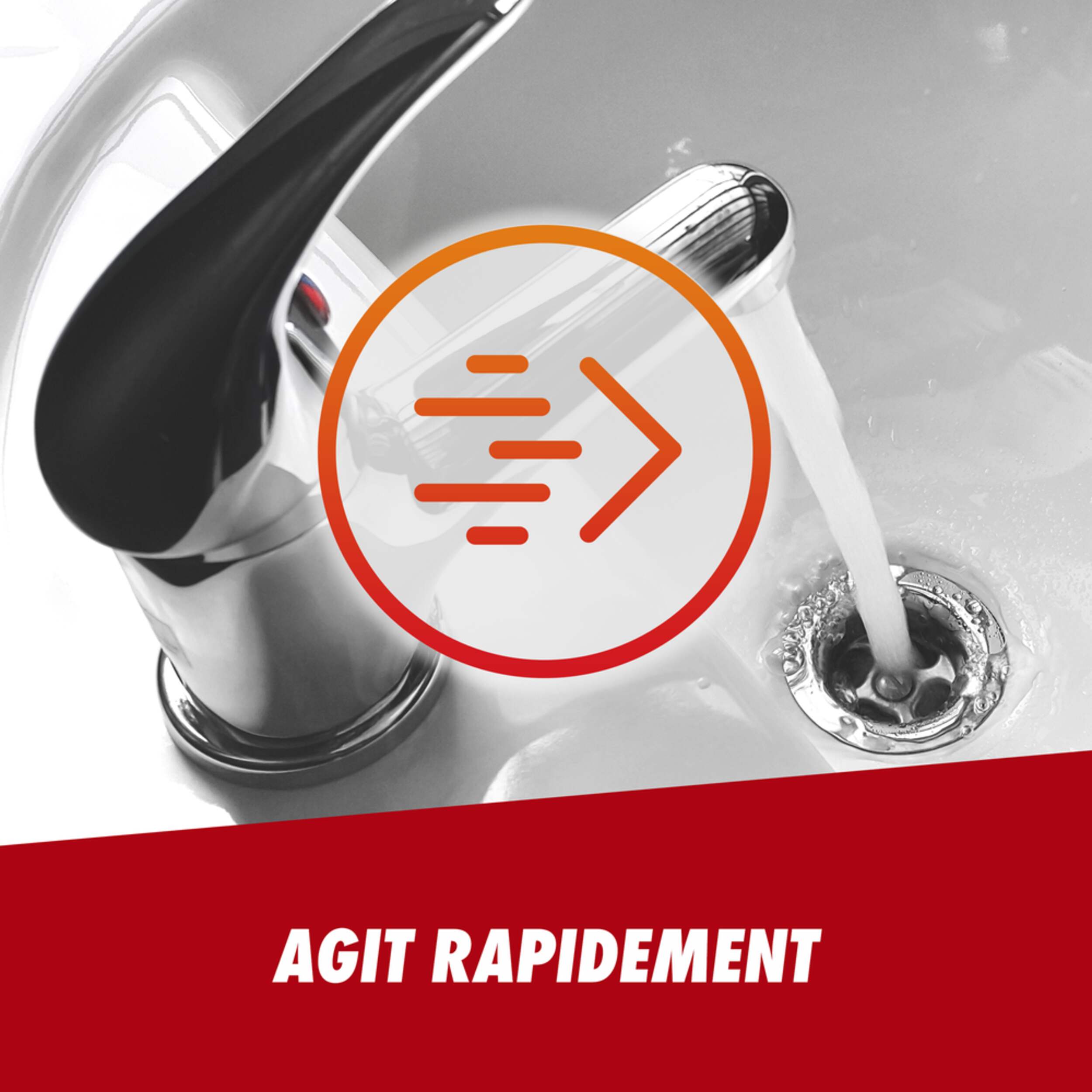 Pour les drains obstrués ou fonctionnant lentement, verser 16 oz lentement sur le drain, et pour les drains fonctionnant extrêmement lentement ou complètement obstrués, verser 32 oz