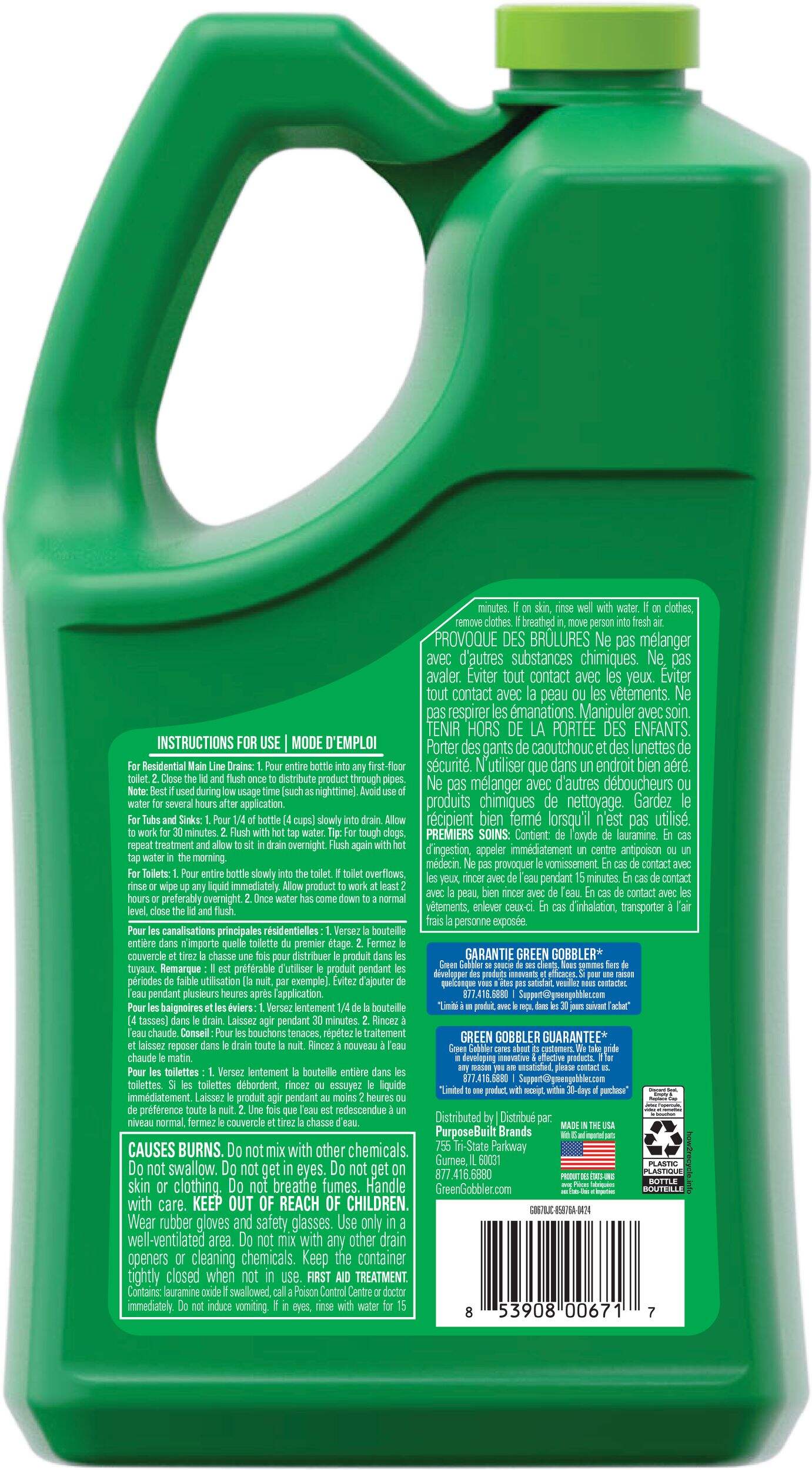 Le déboucheur de canalisations non parfumé Green Gobbler est une solution puissante de 3,8 litres conçue pour déboucher les canalisations principales. Il est sans danger pour les canalisations domestiques, la plomberie et même les fosses septiques. Le produit est formulé pour dissoudre les produits organiques et les produits en papier qui provoquent des bouchons dans la cuvette des toilettes. Sa formule plus épaisse adhère au pourtour des tuyaux, garantissant une plus longue durée d'action pour une pénétration maximale. Ce déboucheur est très efficace contre les obstructions causées par les graisses, les huiles, les peluches et les cheveux. En outre, sa formule non corrosive, non irritante pour la peau et inodore permet de l'utiliser en toute sécurité.