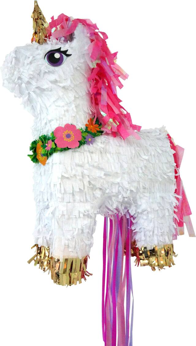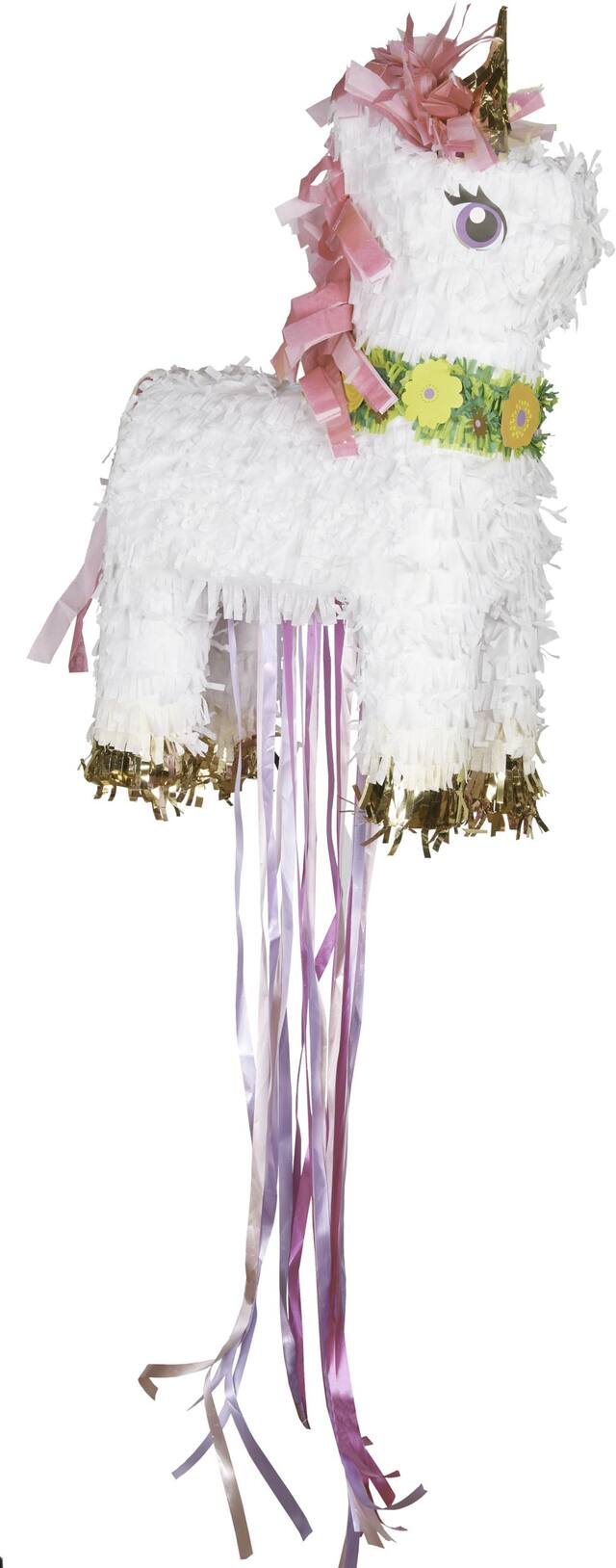 La pinata à ficelles en forme de licorne scintillante d'Amscan est conçue pour ajouter une touche magique à la fête de votre enfant. Cette pinata blanche, en forme de charmante licorne, est dotée d'une crinière et d'une queue en papier de soie rose. Elle présente des rubans roses et violets sur le bas pour que les enfants puissent tirer et libérer les prix contenus à l'intérieur. La pinata mesure 10 x 20 po et peut contenir jusqu'à 2 lb de produits de remplissage. Veuillez noter que les produits de remplissage, le bâton et le bandeau sont vendus séparément.