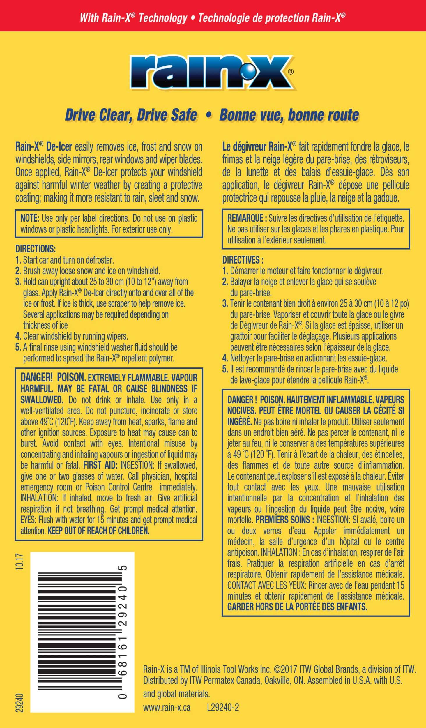 Dégivreur de pare-brise Rain-X 29240 qui vous permet d'enlever rapidement la glace de votre pare-brise et de vos essuie-glaces. Formule puissante qui fait fondre la glace, le givre et la neige légère au contact, ce qui vous permet de prendre la route plus facilement lors des matins froids d'hiver. Dégivreur qui applique aussi une couche de la technologie hydrophobe Rain-X sur le pare-brise. Technologie de pointe qui aide à prévenir l'accumulation de glace, de grésil et de neige, assurant ainsi une meilleure visibilité et des conditions de conduite plus sécuritaires.