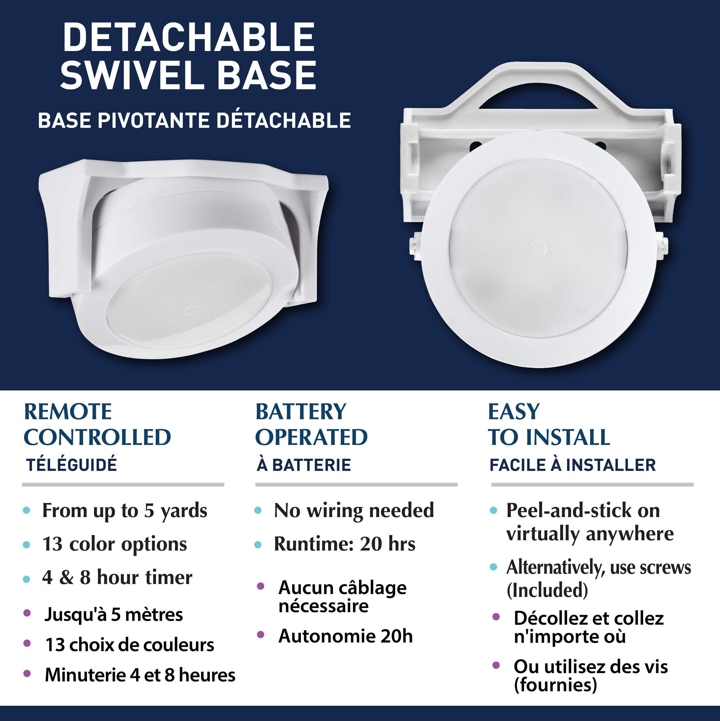 Cet ensemble polyvalent de lampes à DEL pivotantes vous permet de créer exactement l'ambiance voulue. Les bases détachables vous permettent de positionner les lumières où vous le souhaitez, tandis que la télécommande permet de faire défiler 13 couleurs différentes ou de choisir 4 préréglages. Réglez des minuteries de 4 à 8 heures et faites varier l'intensité lumineuse en fonction de votre humeur. Le ruban adhésif à décoller et à coller permet une installation sans souci, et la télécommande fonctionne jusqu'à une distance de 5 mètres. Qu'il s'agisse de mettre en valeur les armoires de cuisine, d'illuminer les étagères ou de baigner une chambre dans des teintes apaisantes, ces lampes facilitent la mise en scène.