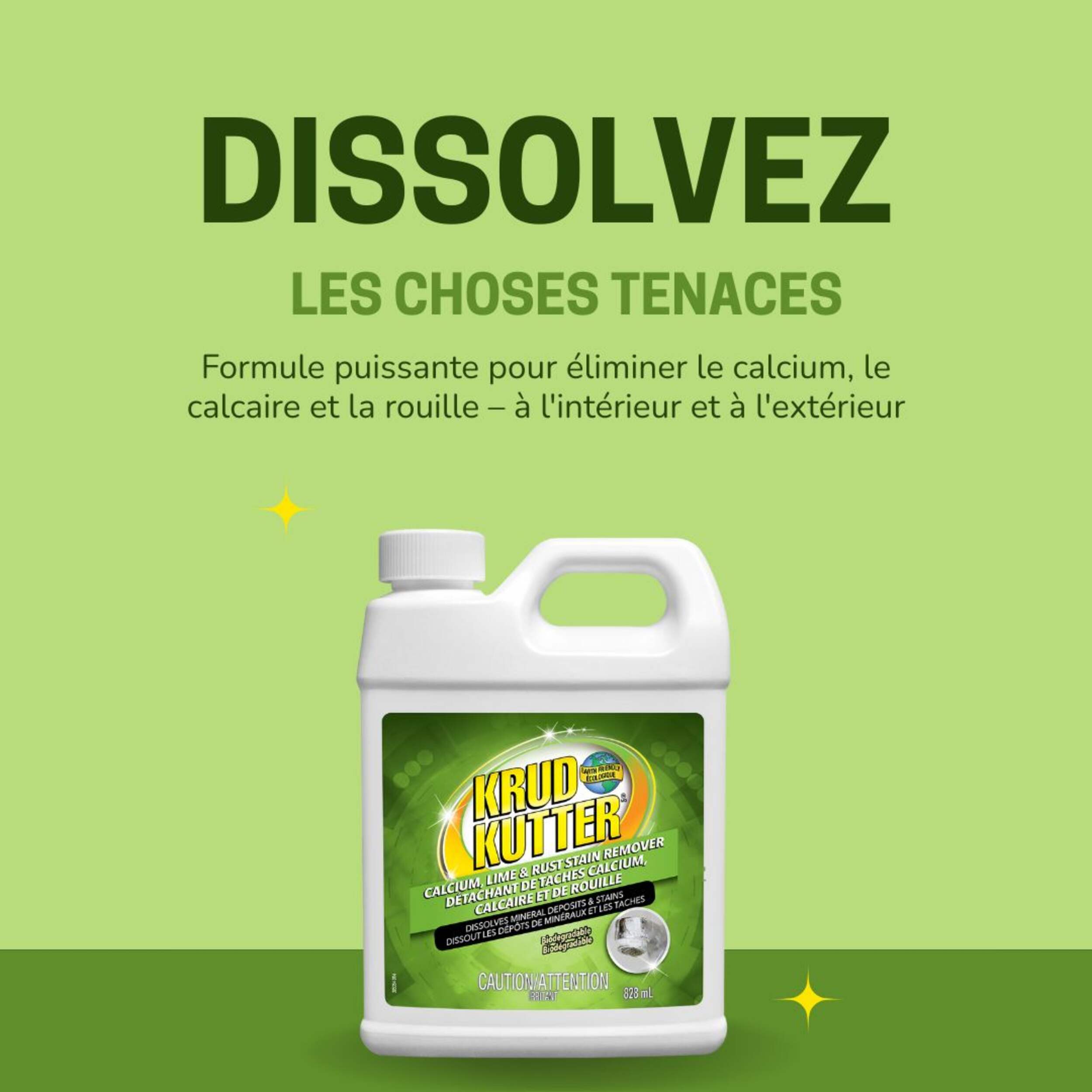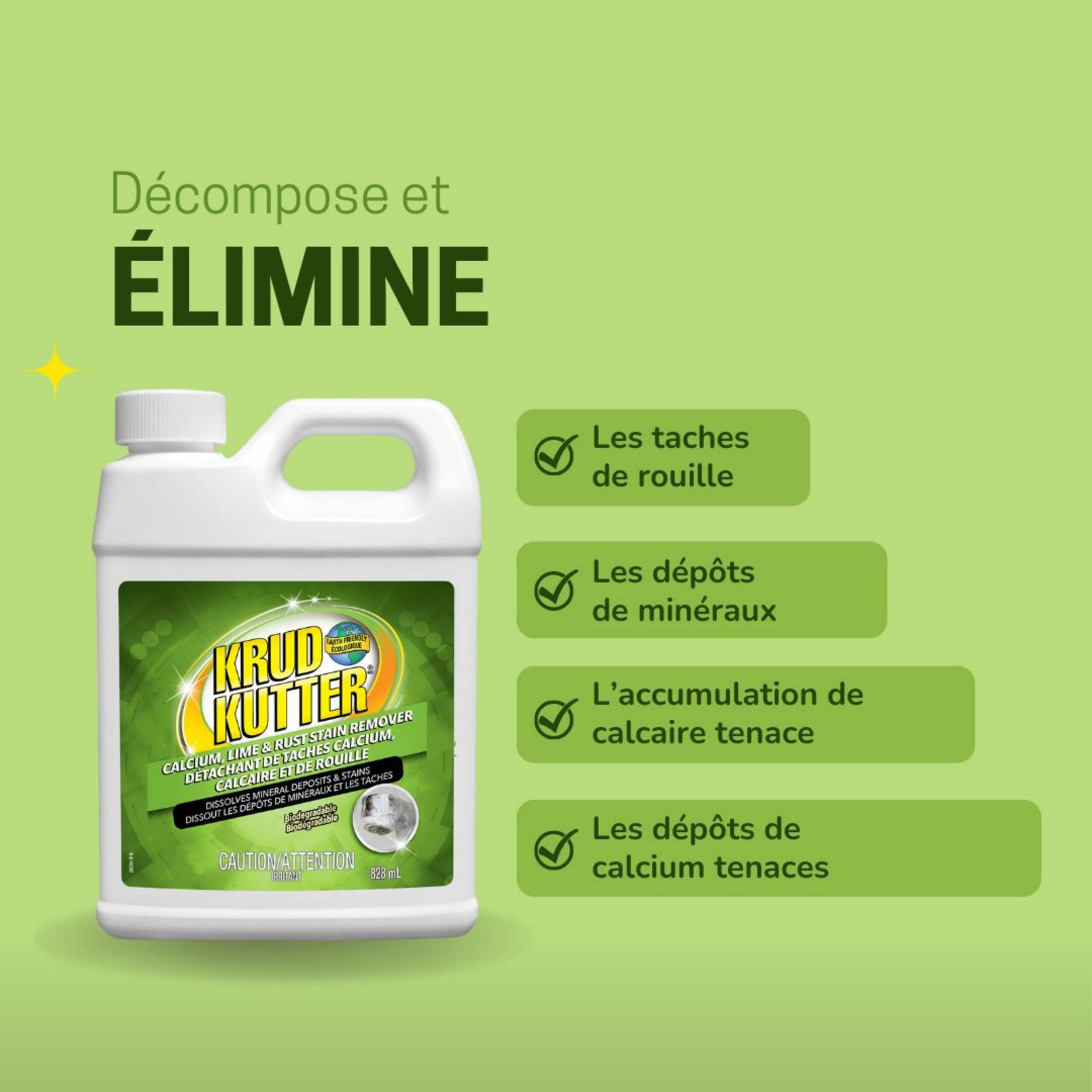 Détachant de taches calcaires et de rouille Krud Kutter dissout efficacement les dépôts de minéraux et de calcaire et les taches de rouille de la surface des douches, des lavabos, des baignoires, des cuvettes, des cafetières et des bouilloires