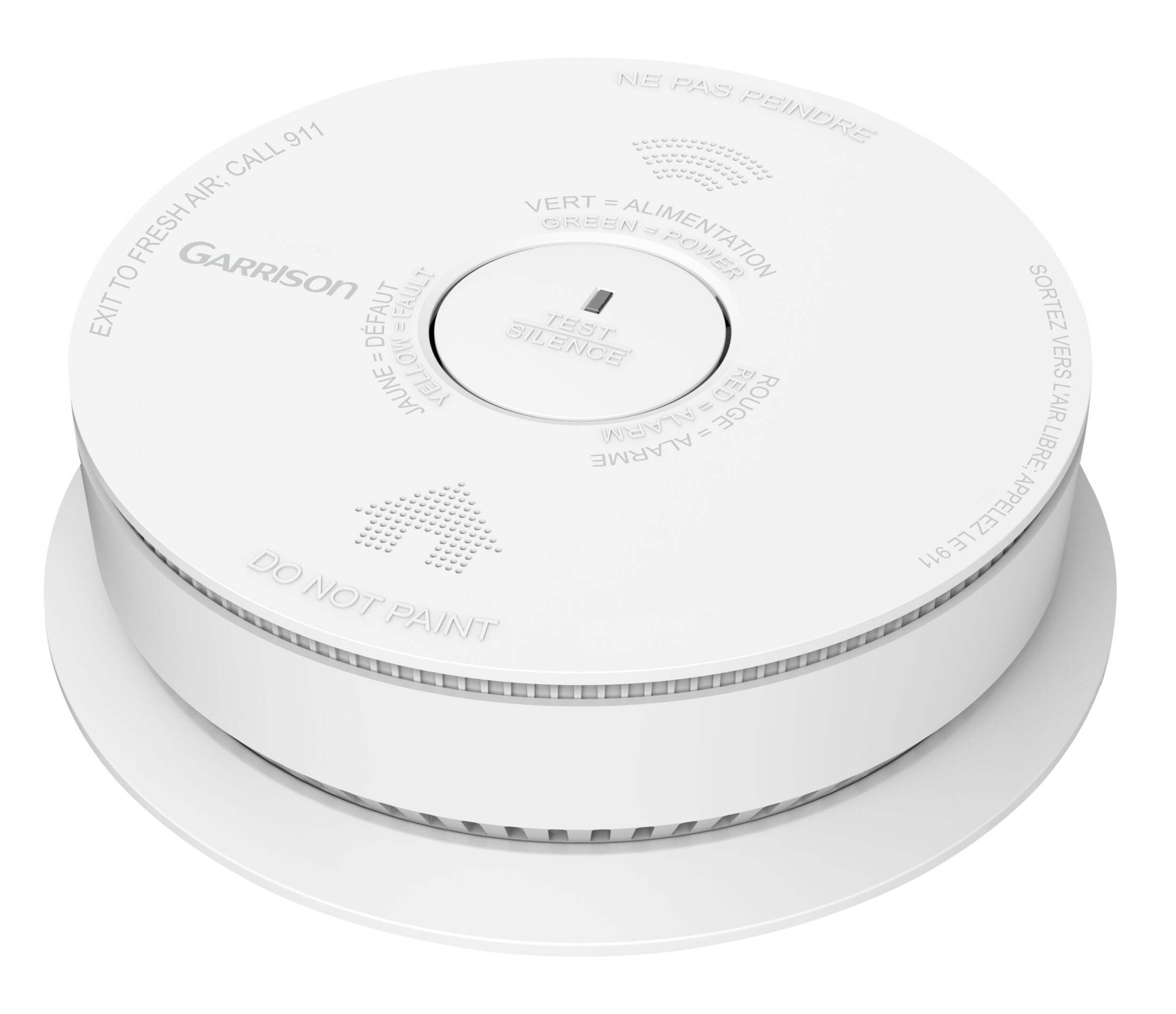 Le détecteur de fumée GarrisonMC est doté d'une version améliorée de la technologie photoélectrique, plus sensible pour détecter les feux lents et couvants, qui produisent de la fumée légère et peu de chaleur et qui peuvent brûler lentement pendant des heures avant de produire des flammes. Une alarme de 85 décibels vous annonce un incendie. De façon similaire, le capteur de monoxyde de carbone utilise une technologie électrochimique pour offrir une lecture précise du monoxyde de carbone et déclencher une alarme vocale de 85 décibels. Ce détecteur de fumée et de monoxyde de carbone a une fonction d'autotest continue assurant son bon état. Cette alarme annonce si le niveau des piles est faible, s'il y a une erreur du détecteur de fumée ou du capteur de monoxyde de carbone. Si des alarmes se déclenchent pendant la nuit, vous pouvez mettre l'appareil en silence pendant environ dix heures en appuyant sur le bouton et en remplaçant les piles. Lorsqu'une alarme retentit, quittez immédiatement le bâtiment ou, si vous êtes certain qu'il ne s'agit pas d'un vrai feu, éteignez l'appareil. La vérification mensuelle de vos appareils permet de s'assurer qu'ils sont en bon état. Ce détecteur combiné est doté d'une fonction de mémoire d'alarme que vous pouvez vérifier lorsque vous n'êtes pas à la maison. Cette unité est certifiée UL217 9e édition et UL2034 pour réduire les fausses alarmes causées par la fumée de cuisson, critère de la plus récente norme UL 217. Avec une garantie limitée de 10 ans (pas une revendication sur le rendement de la batterie) et une pile au lithium scellée d'une durée de vie de 10 ans, ce détecteur assure votre tranquillité d'esprit.
