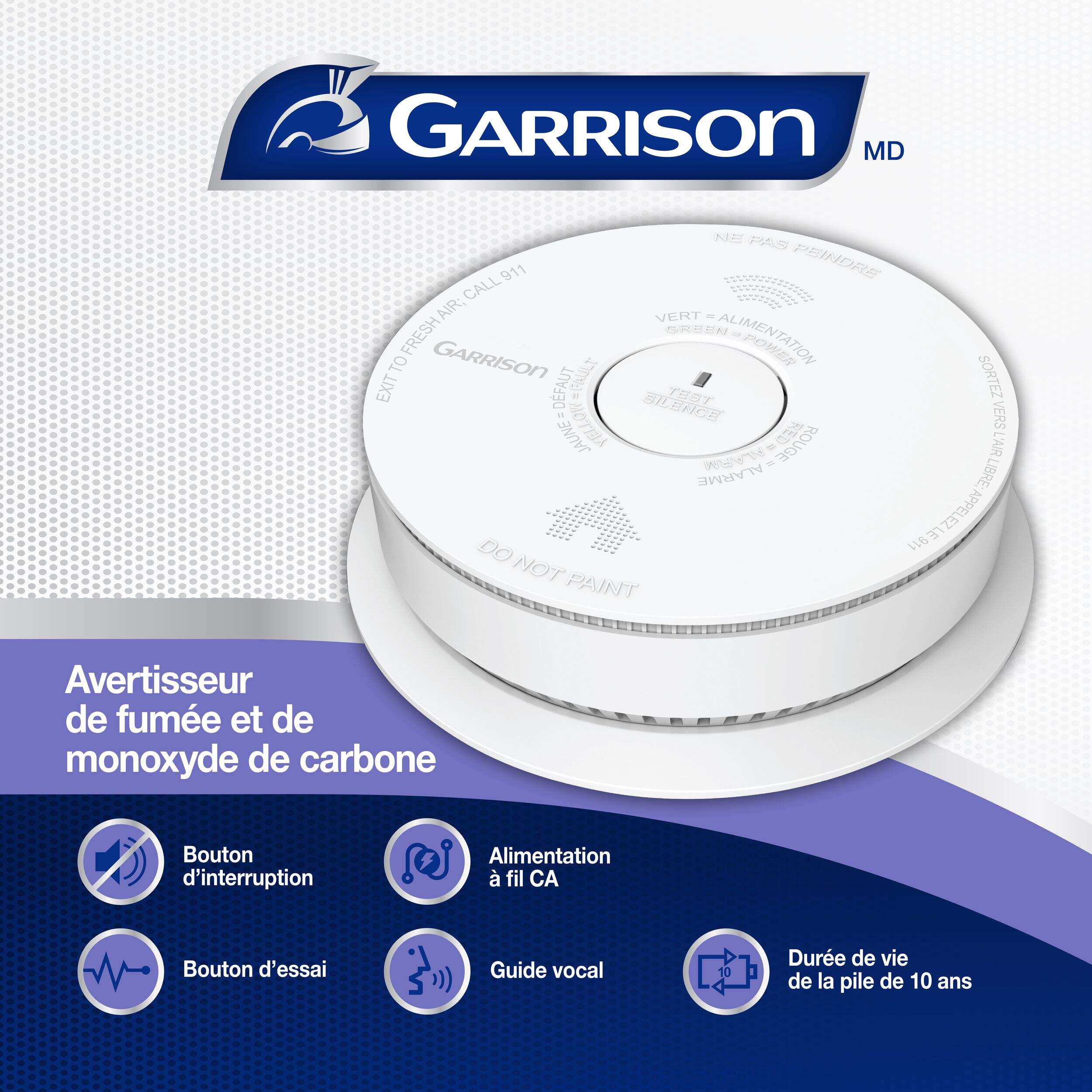 L'alarme combinée Garrison MC est alimentée par un câble CA de 120 V, avec des piles au lithium scellées en cas de panne de courant, et fournit une protection continue pendant dix ans. 18 appareils peuvent être interconnectés par câble; quand un de ces appareils émet une alarme, tous les appareils connectés sont alertés. Ce détecteur deux-en-un est doté d'un capteur optique multicritères, version améliorée de la technologie photoélectrique. Cette technologie sensible détecte les feux couvants et lents, produisant de la fumée légère et peu de chaleur, et qui peuvent brûler lentement pendant des heures avant de produire des flammes. Si un incendie est détecté, une alarme vocale de 85 décibels l'annonce. Le capteur de monoxyde de carbone utilise une technologie électrochimique pour des lectures précises, et, en cas de situation potentiellement dangereuse, il déclenche une alarme vocale de 85 décibels annonçant la présence de monoxyde de carbone. Ce détecteur de fumée et de monoxyde de carbone a une fonction d'autotest continue assurant son bon fonctionnement. Une alarme annonce si le niveau des piles est faible, s'il y a une erreur du détecteur de fumée ou du capteur de monoxyde de carbone. Si des alarmes se déclenchent pendant la nuit, vous pouvez mettre l'appareil en silence pendant environ dix heures en appuyant sur le bouton et en remplaçant les piles. Lorsque l'alarme retentit, quittez immédiatement le bâtiment ou, si vous êtes certain qu'il ne s'agit pas d'un vrai feu, éteignez l'appareil jusqu'à ce que le danger soit éliminé. Testez les appareils chaque mois. Ces détecteurs ont une mémoire pour vérifier l'état de l'alarme lorsque vous n'êtes pas à la maison. L'unité certifiée UL217 9e édition et UL2034 peut réduire les fausses alarmes causées par la fumée de cuisson, critère de la plus récente norme UL 217. Avec une garantie limitée de 10 ans (pas une revendication sur le rendement de la batterie), ce détecteur assure votre tranquillité d'esprit.