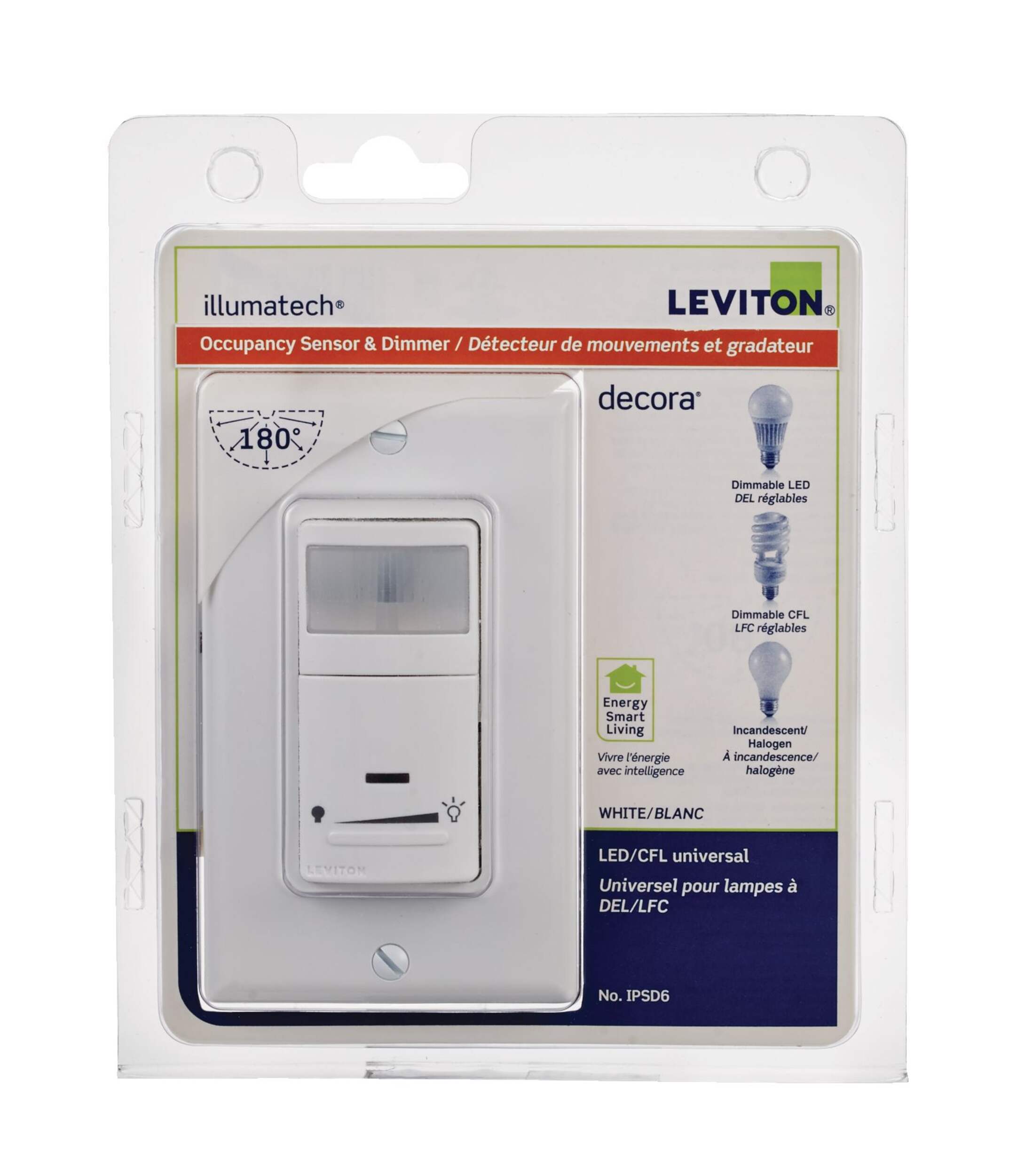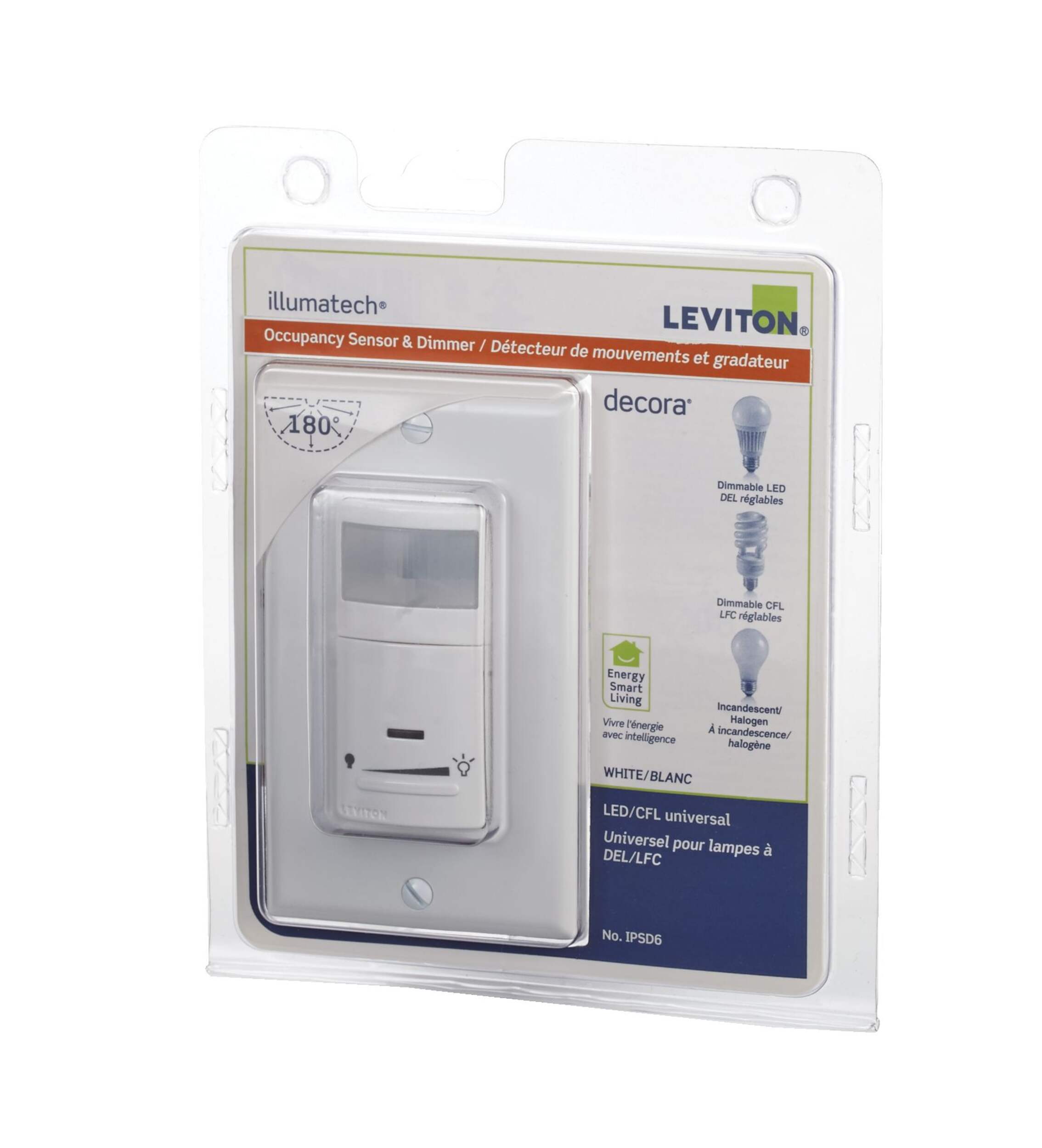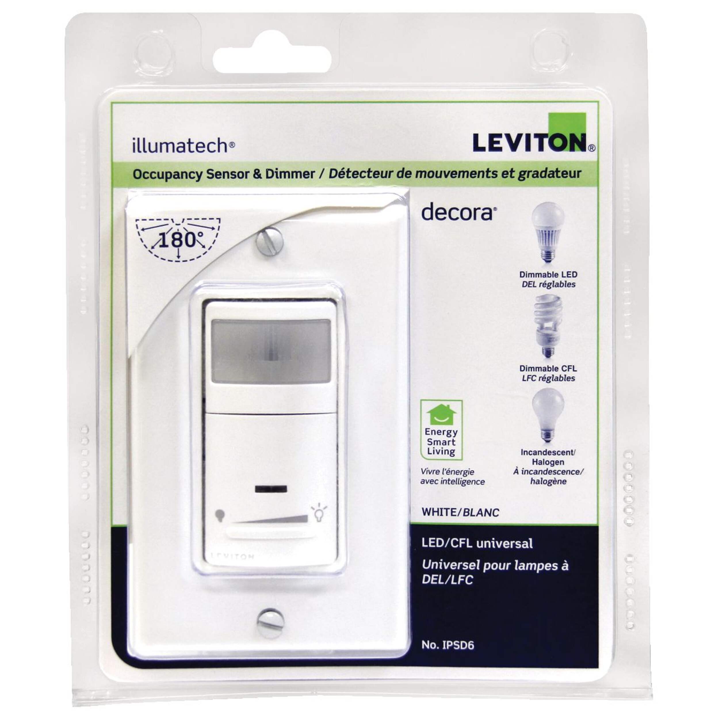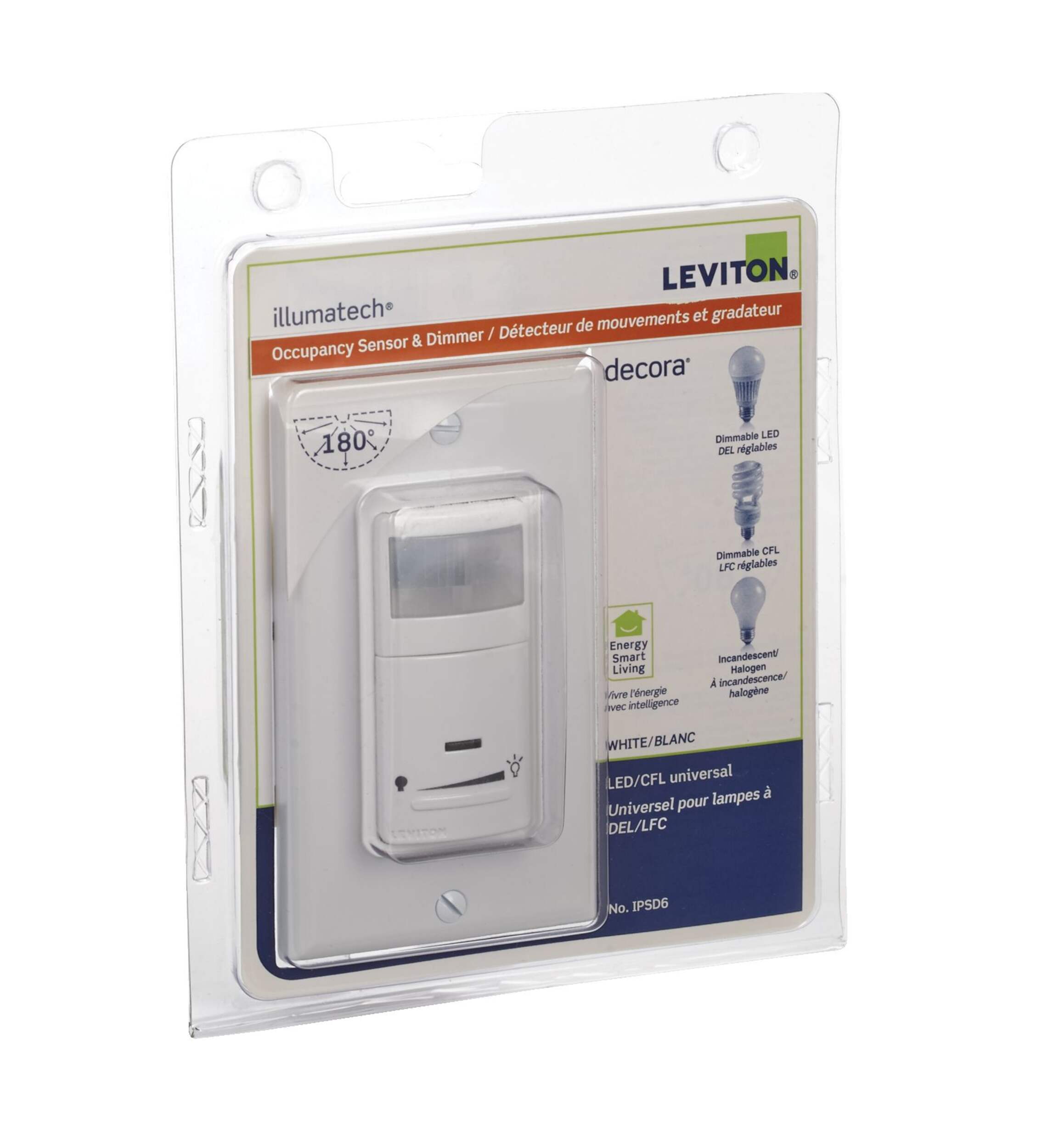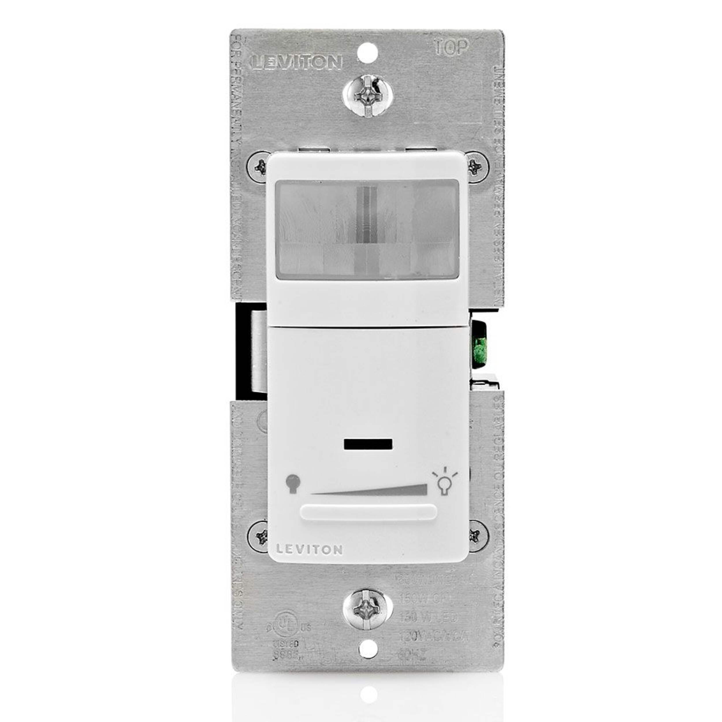 Détecteur de mouvement et gradateur universel Leviton contrôlant les ampoules à DEL, fluocompactes, incandescentes et halogènes à intensité variable
