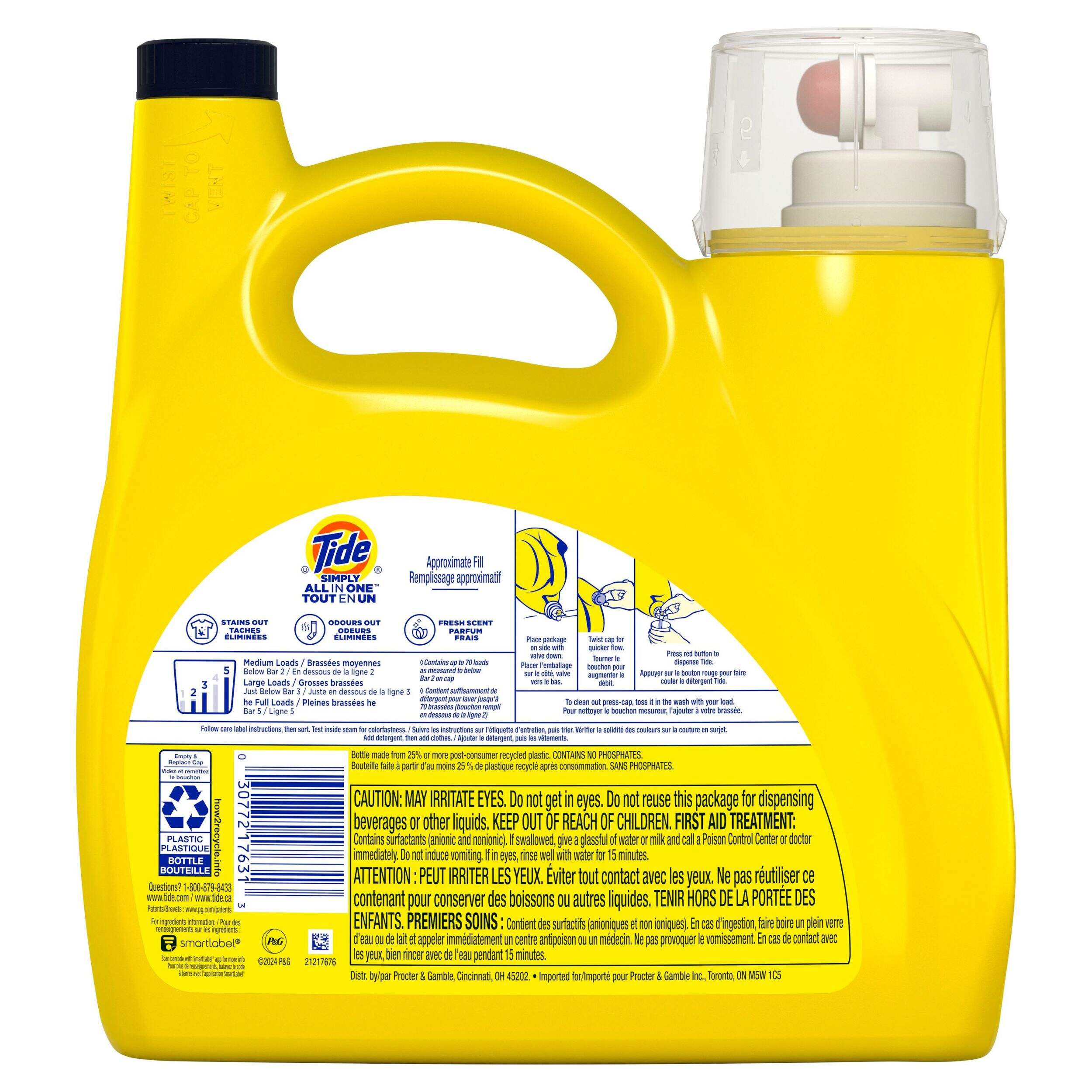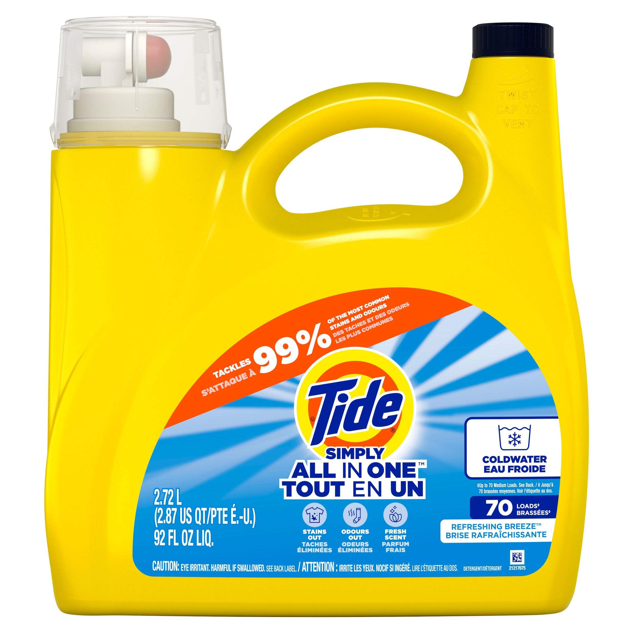 Le détergent à lessive liquide tout-en-un Tide Simply s'attaque à 99 % des taches et des odeurs les plus courantes. Ce détergent à lessive Tide s'attaque aux taches et aux odeurs, il a un parfum frais et il fonctionne dans l'eau froide. Il est maintenant plus concentré pour éliminer les taches et conserver la fraîcheur tout en réduisant la quantité d'eau utilisée.