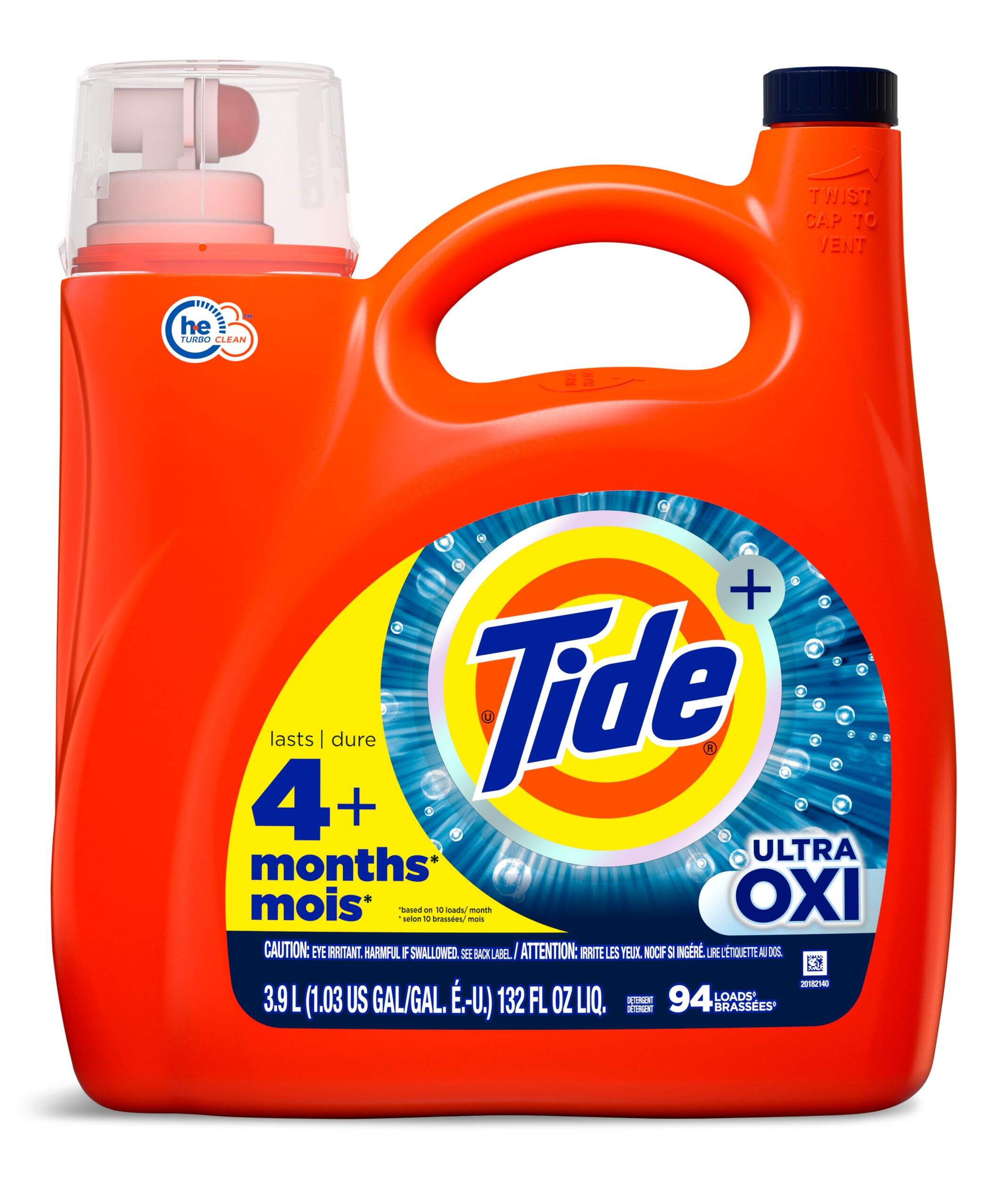 Le détergent à lessive liquide Tide Ultra OXI offre des pré-traiteurs intégrés pour éliminer même les taches les plus tenaces. Essayez aussi nos puissantes capsules de détergent à lessive Tide PODS. Mesurez vos brassées avec le bouchon. Pour les brassées moyennes, remplir jusqu'à la ligne 1. Pour les grosses brassées, remplir jusqu'à la ligne 3. Pour les pleines brassées haute efficacité, remplir jusqu'à la ligne 5. Ajoutez les vêtements, versez dans le distributeur, mettez la laveuse en marche.