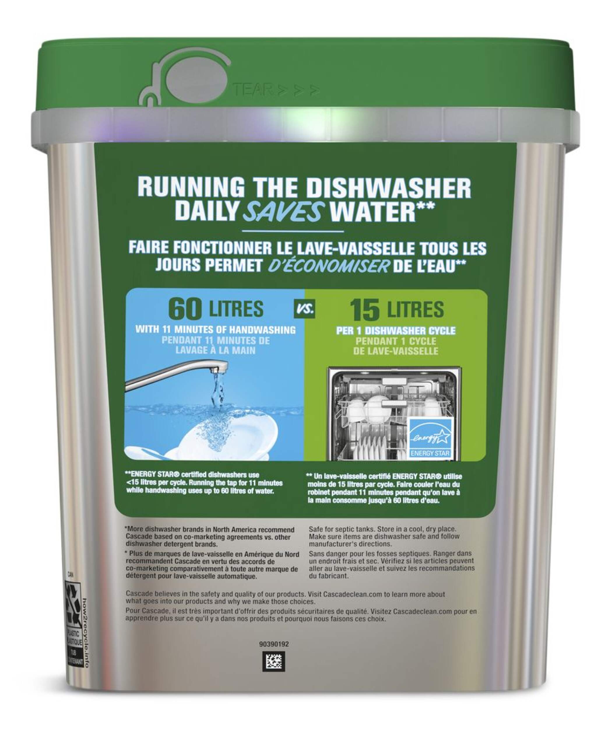Économisez jusqu'à 15 gallons d'eau par chargement lorsque vous sautez le prélavage et faites fonctionner votre lave-vaisselle avec Cascade Platinum