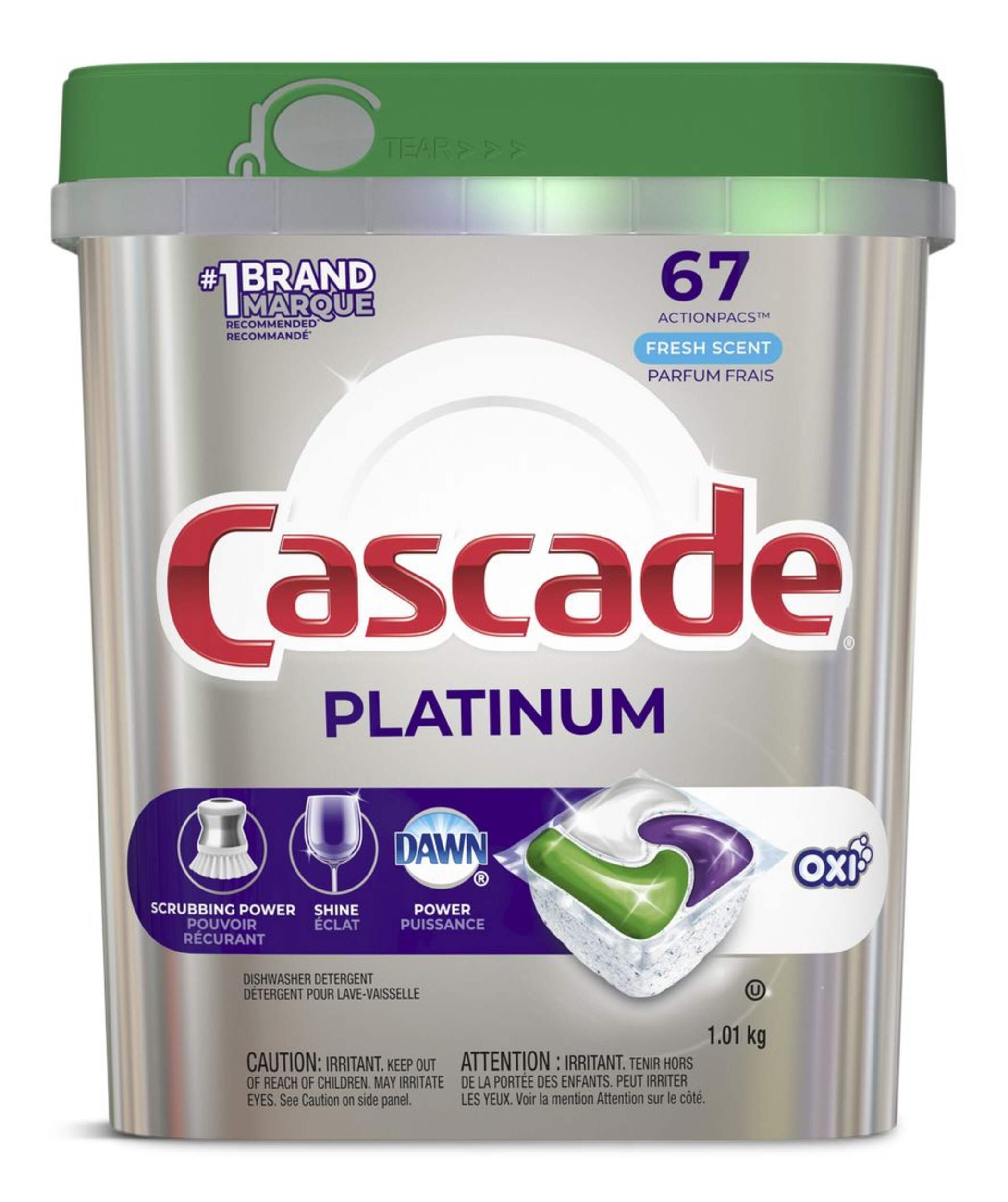 Le détergent pour lave-vaisselle Cascade Platinum + Oxi nettoie les taches brûlées en un seul lavage, sans prélavage. Il est formulé avec la puissance supérieure de lutte contre les taches d'Oxi Bleach Alternative pour éliminer les taches tenaces de nourriture et de boissons comme le thé et le café. La capsule se dissout rapidement pour commencer à nettoyer tout de suite, libérant le pouvoir dégraissant de Dawn, tandis que des enzymes s'accrochent aux aliments et les décomposent en petites particules qui peuvent s'écouler directement dans le drain. Ce produit est si puissant qu'il fonctionne même avec le cycle de lavage rapide. De plus, le détergent à vaisselle Cascade Platinum est formulé pour aider à prévenir le filmage de l'eau dure, gardant votre appareil propre et frais. Il suffit d'insérer une capsule pour révéler l'éclat Platinum. Faire fonctionner le lave-vaisselle tous les jours permet d'économiser de l'eau. * Économisez jusqu'à 45 L d'eau lorsque vous sautez le prélavage. * Les lave-vaisselle homologués ENERGY STAR utilisent 15 L par cycle. Laisser le robinet ouvert pendant 11 minutes pendant que le lavage à la main utilise jusqu'à 60 litres d'eau. Marque la plus recommandée en Amérique du Nord* *Plus de marques de lave-vaisselle en Amérique du Nord recommandent Cascade par rapport à toute autre marque de détergent à vaisselle automatique, recommandations dans le cadre des accords de commercialisation conjointe.