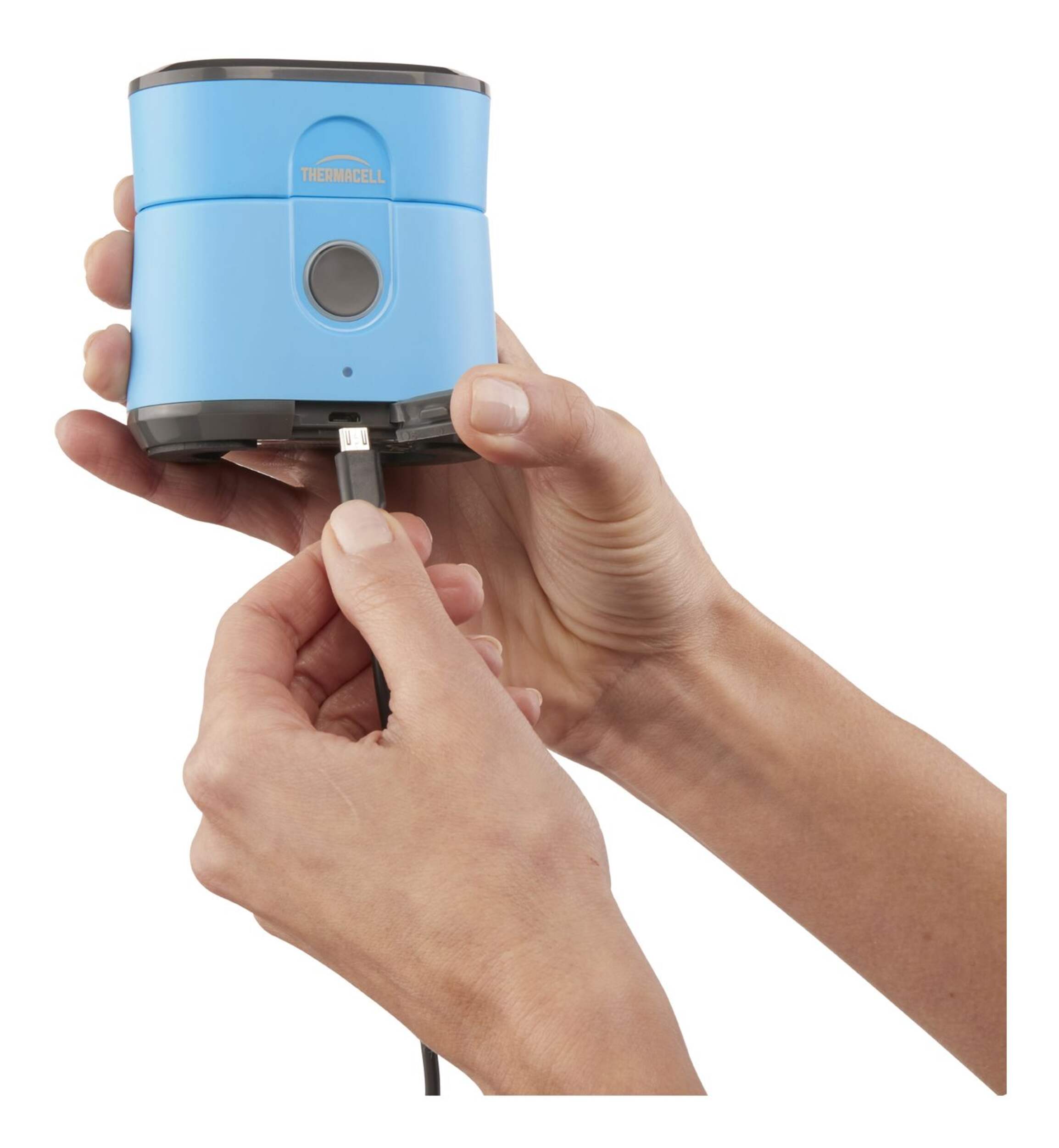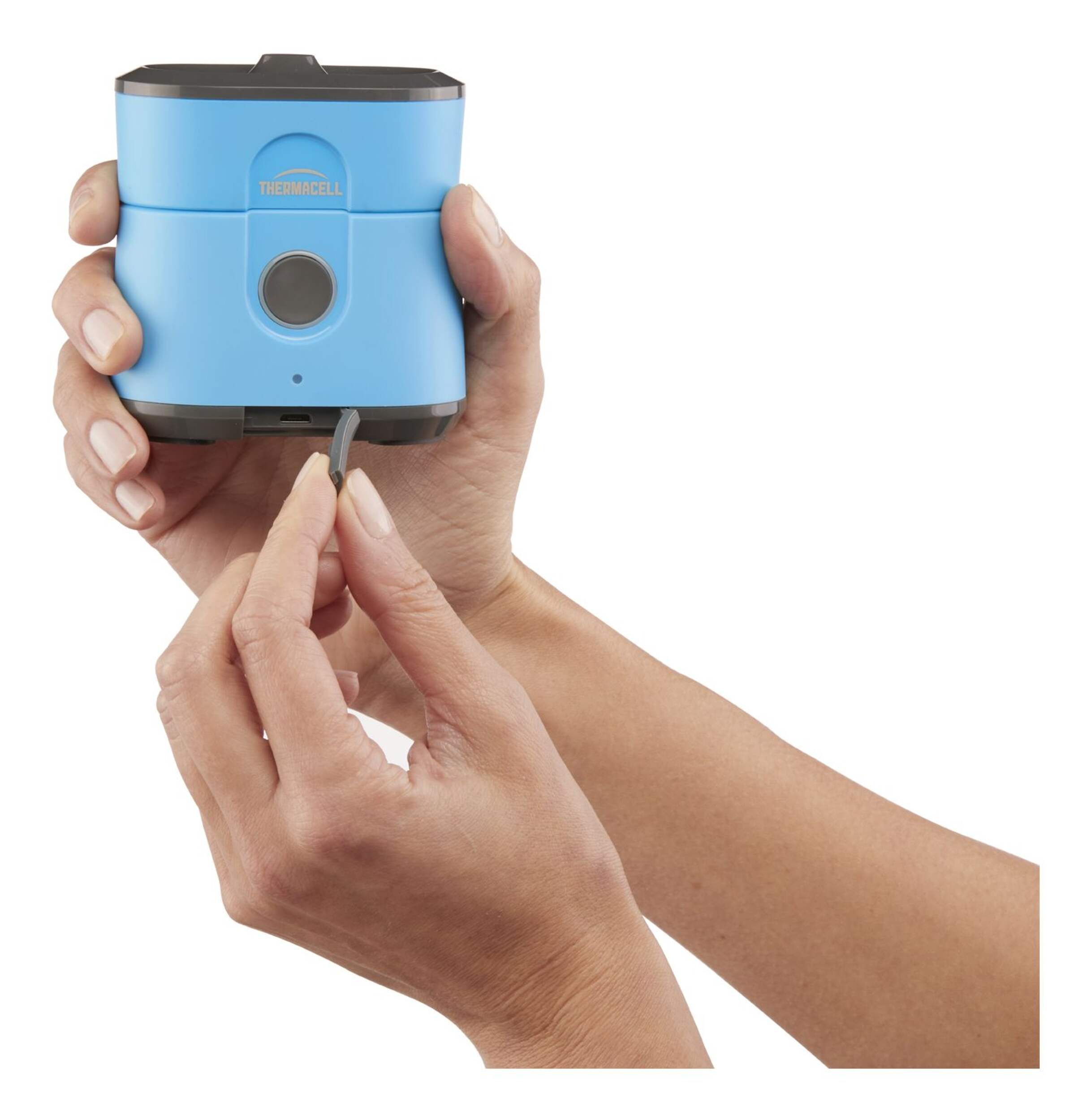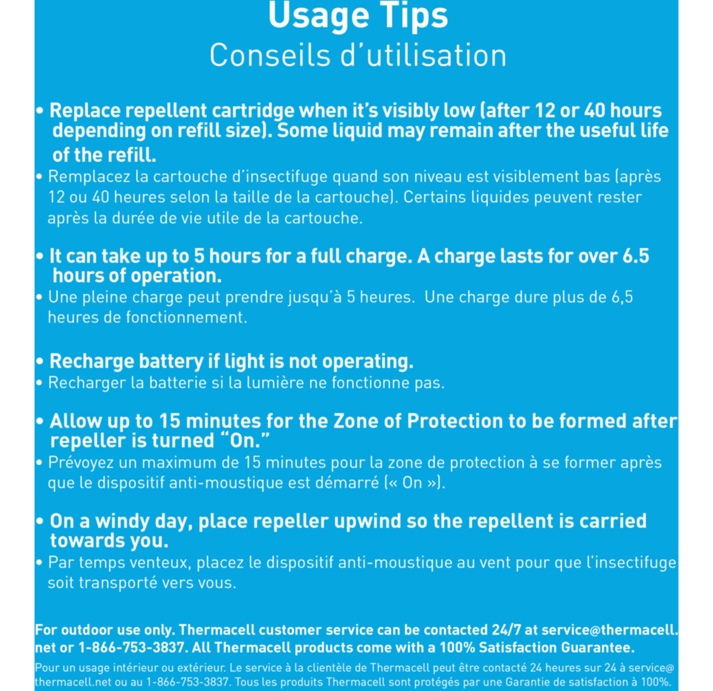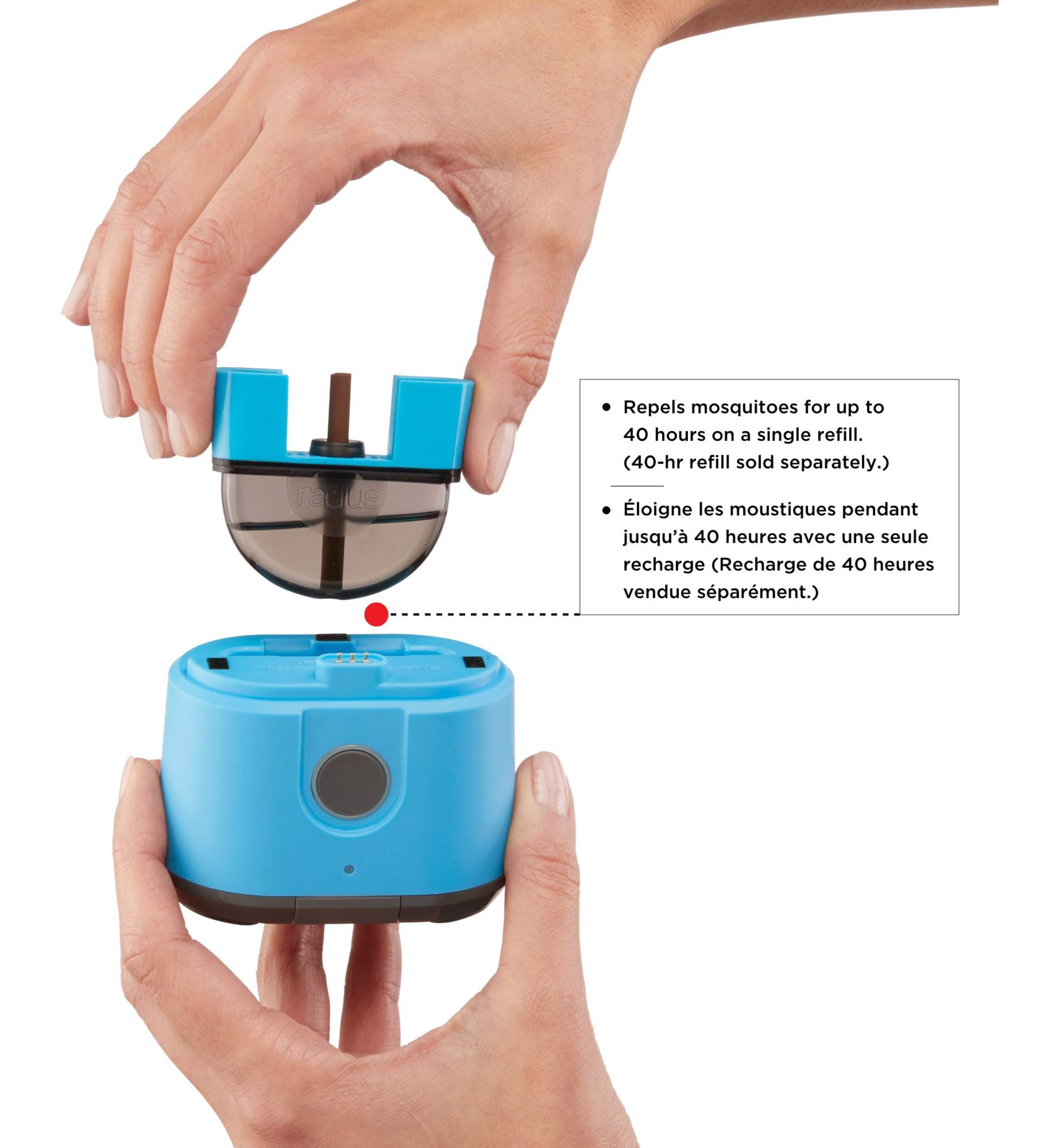Chasse-moustiques Thermacell comprenant 1 chasse-moustiques Radius Zone bleu, 1 chasse-moustiques Radius de 12 heures, 1 câble USB, 1 adaptateur d'alimentation USB et mode d'emploi