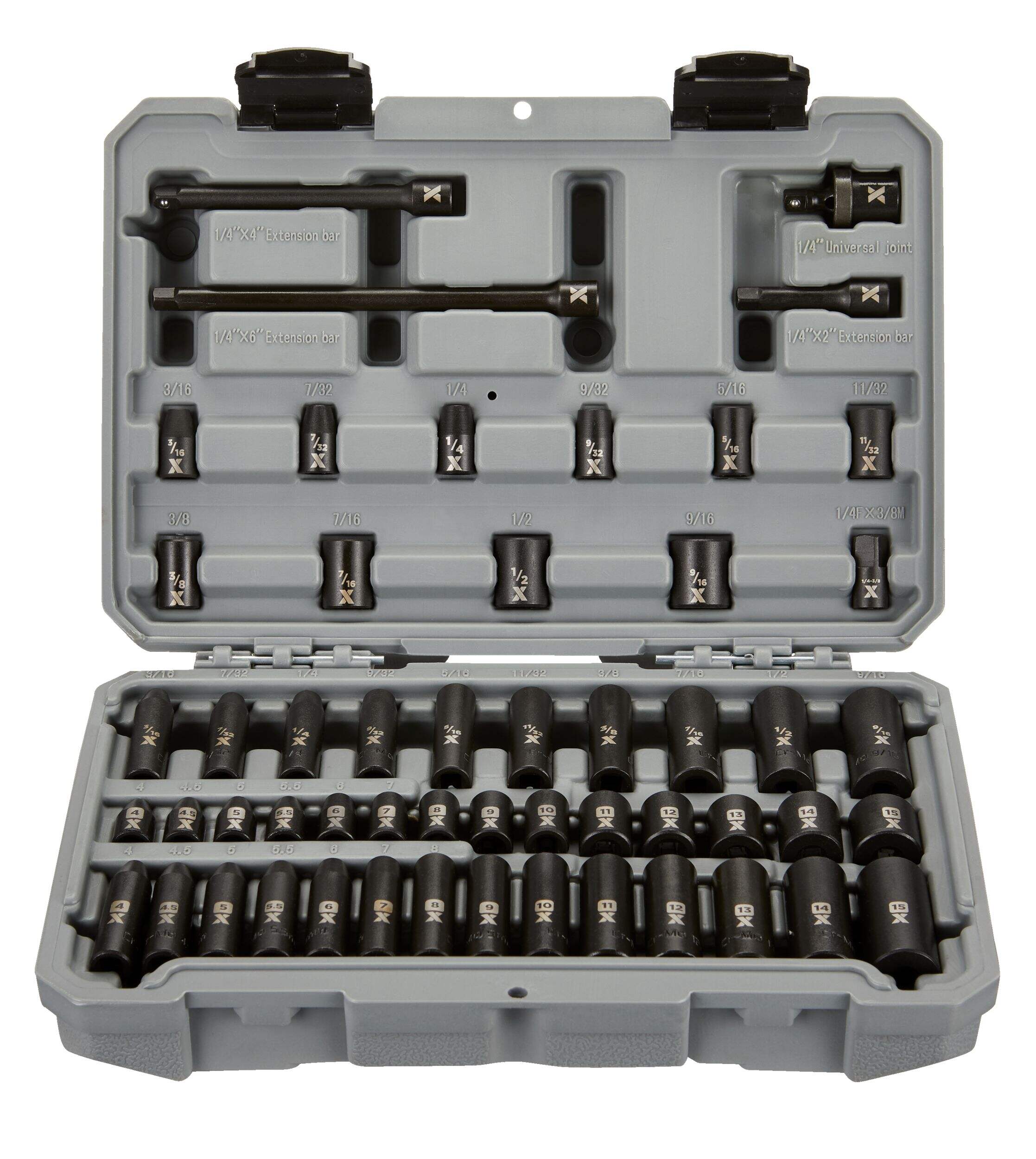 14 douilles à choc standards, métrique : 4, 4,5, 5, 5,5, 6, 7, 8, 9, 10, 11, 12, 13, 14 et 15 mm