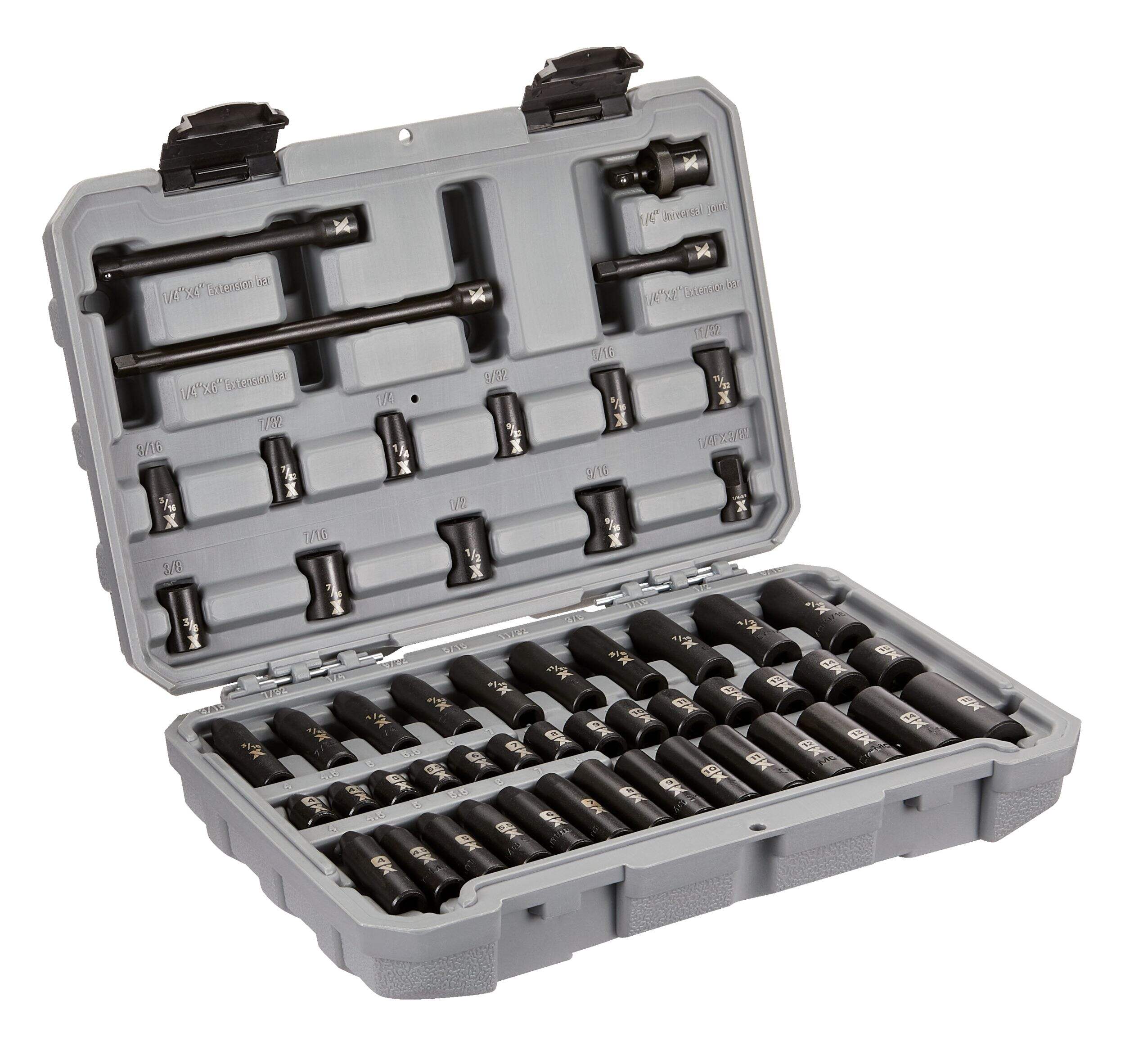 Douilles à chocs MAXIMUM à prise de 1/4 po polyvalentes conçues pour être utilisées avec les clés à chocs pneumatiques et électriques. Ces douilles sont fabriquées en acier au chrome-molybdène traité thermiquement de haute qualité pour une solidité accrue, les rendant idéales pour les applications nécessitant un couple élevé et une résistance aux chocs. Toutes les douilles de cet ensemble de douilles à chocs résistent à la corrosion et sont couvertes par une garantie d'échange à vie.