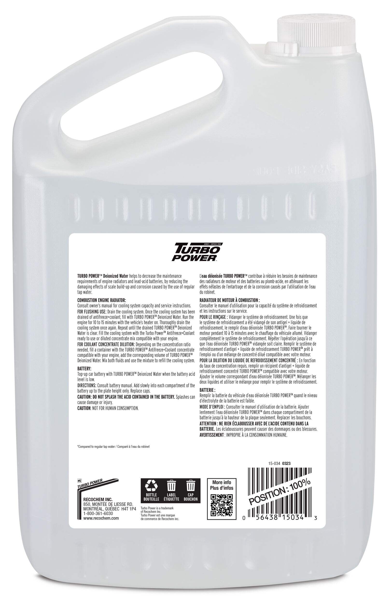 Eau désionisée Turbo Power aide à protéger contre les dommages de l'entartrage et de la corrosion souvent causés par l'utilisation d'eau potable. Eau déminéralisée idéale pour approvisionner les systèmes de refroidissement, approvisionner les batteries de voiture lorsque le niveau d'acide est bas et diluer le liquide de refroidissement et antigel concentré de radiateur.