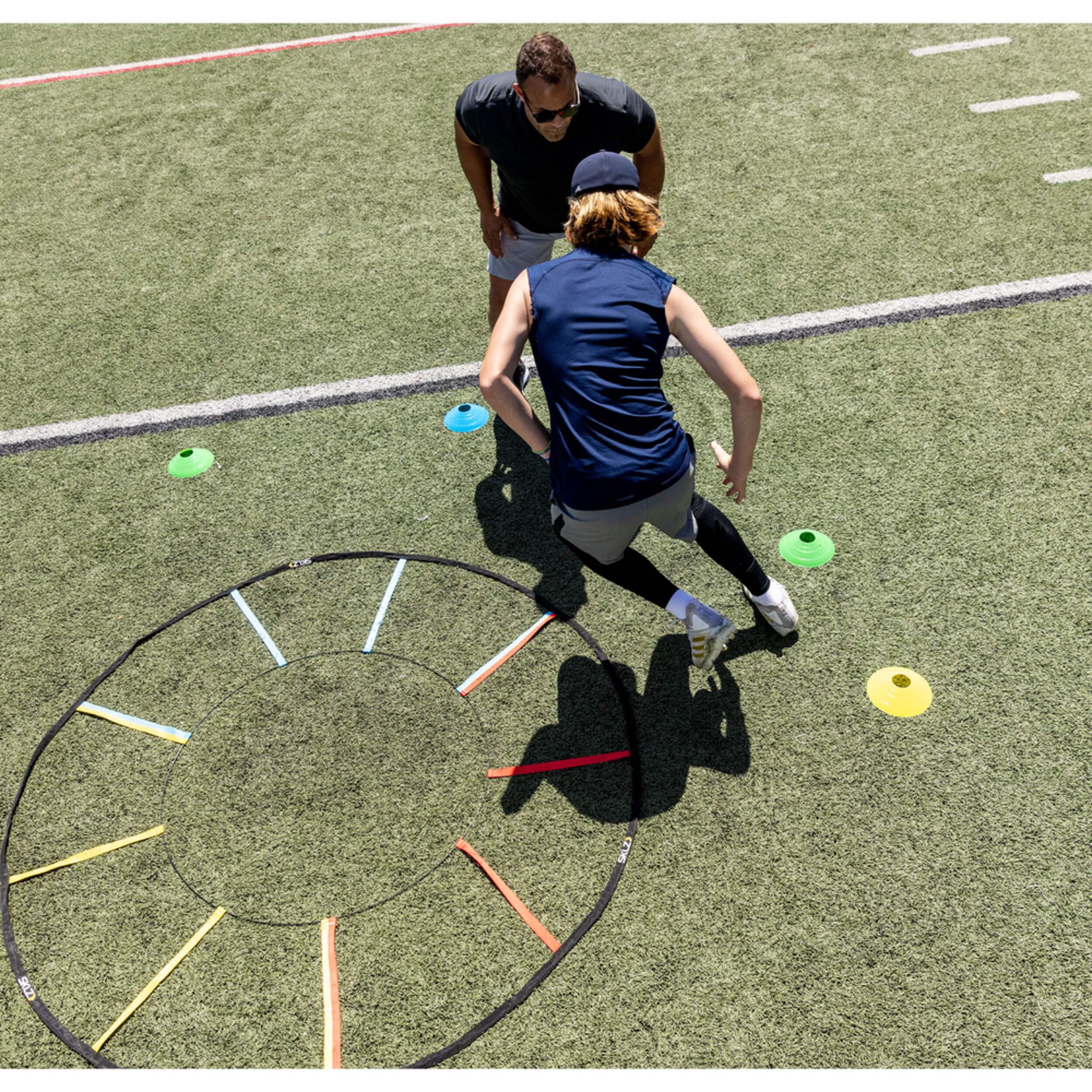 Échelle et cônes combinés peuvent être placés dans des séquences d'entraînement infinies, y compris les portes de vitesse ou les exercices d'entraînement au marquage
