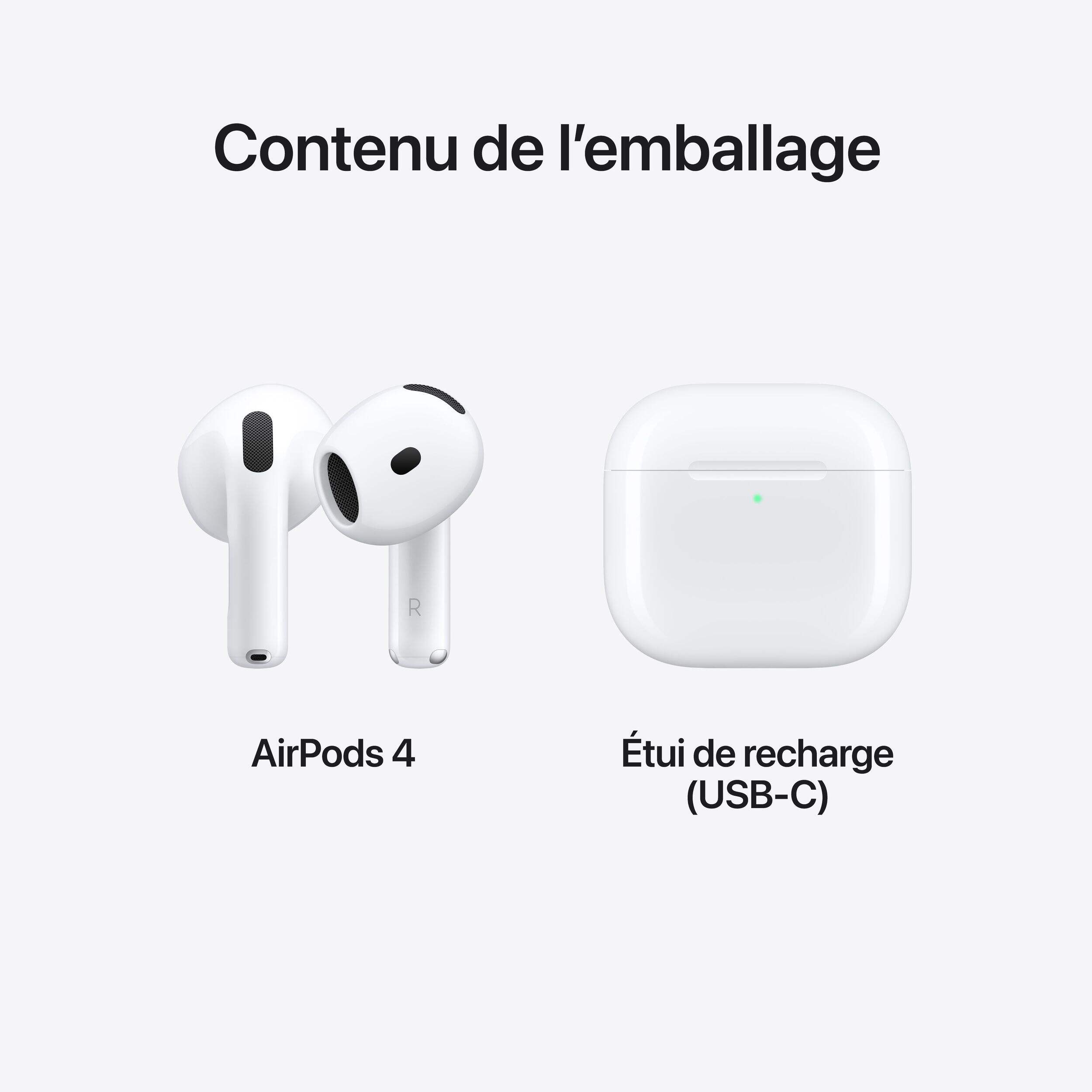 Reconstruit pour le confort : les AirPods 4 ont été redessinés pour offrir un confort exceptionnel toute la journée et une stabilité accrue avec un contour raffiné, une tige plus courte et des commandes à pression rapide pour la musique ou les appels