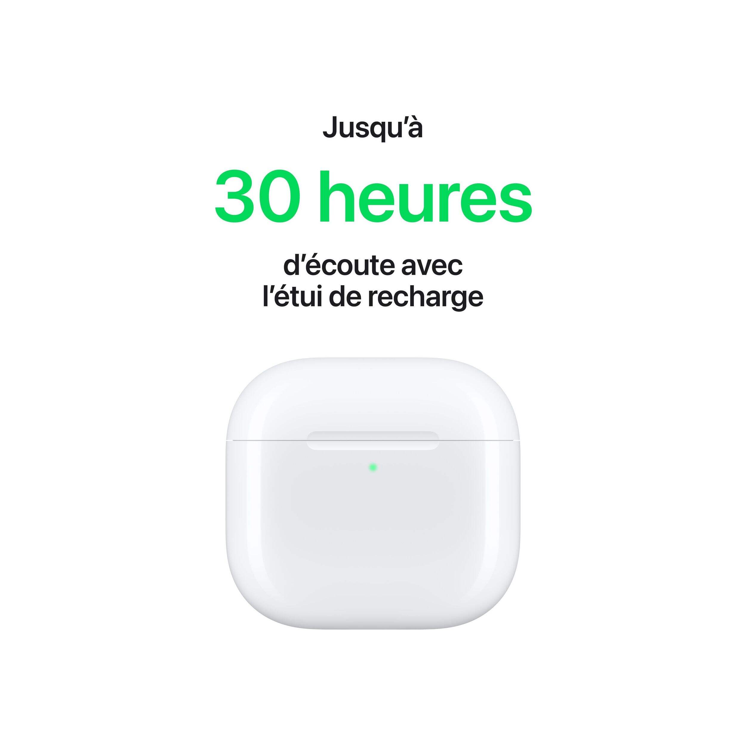 Autonomie prolongée : jusqu'à 5 heures d'écoute par charge et jusqu'à 30 heures de temps d'écoute total avec l'étui