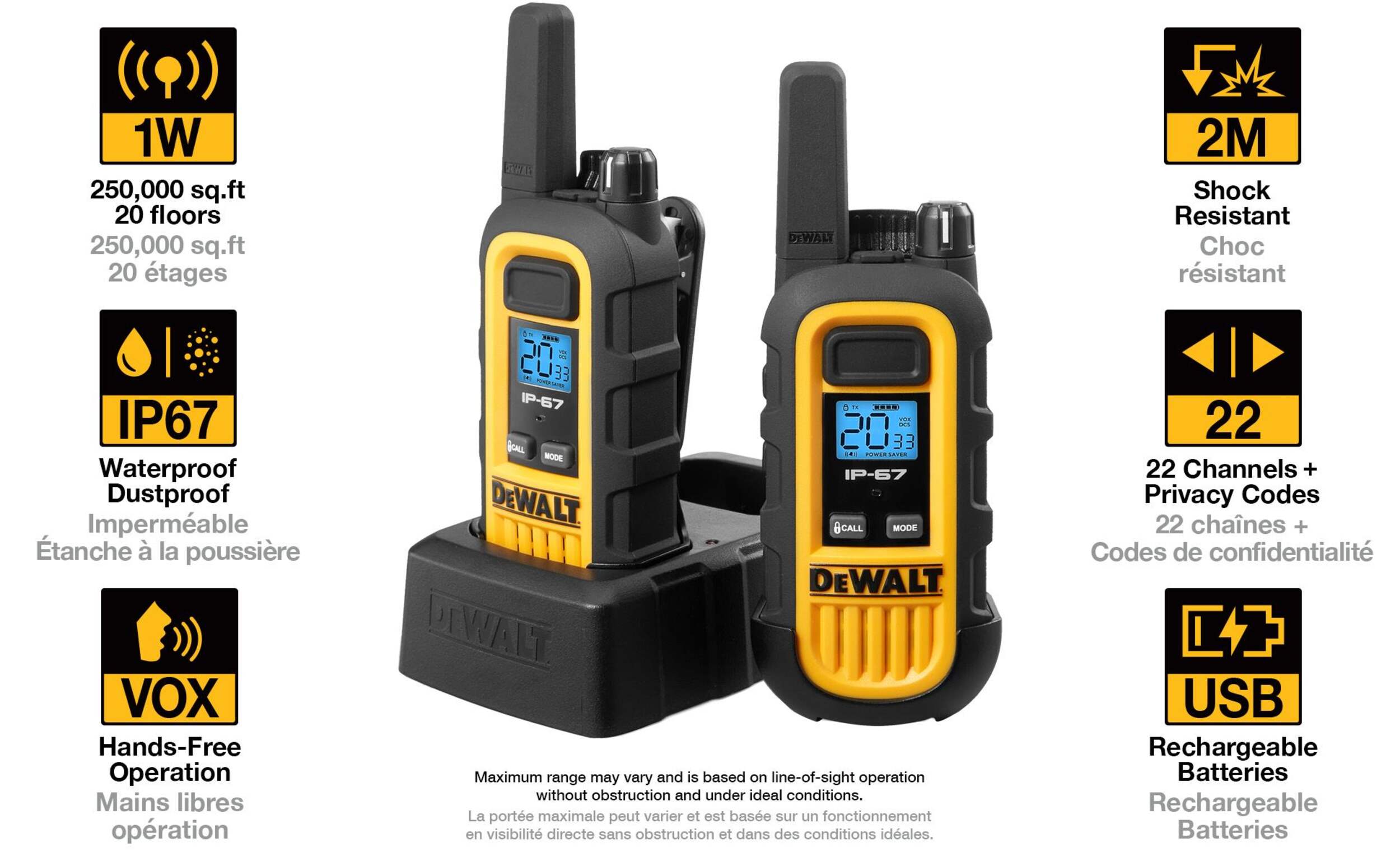 Faites l'expérience d'une communication fiable avec l'émetteur-récepteur SRMG pour service intense de DEWALT, modèle DXFRS800, idéal pour les professionnels qui recherchent une coordination efficace sur un grand territoire. Cet ensemble comprend 2 radios et 2 casques de surveillance, assurant une transmission claire sur jusqu'à 25 étages ou 300 000 pi2. Avec 22 canaux prédéfinis, chacun renforcé par 121 codes de confidentialité (38 CTCSS et 83 DCS), vos communications restent nettes, sans interférences et plus discrètes.