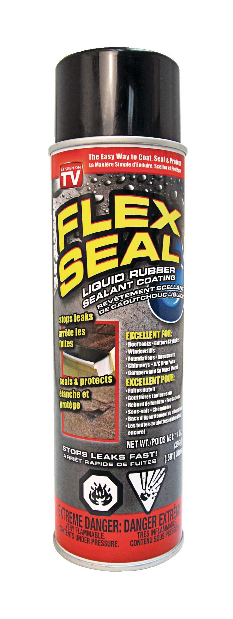 Le revêtement enduit de caoutchouc liquide Flex Seal est vaporisé sous forme de liquide épais, il s'infiltre dans les fissures et les trous et sèche pour former un revêtement étanche, flexible et caoutchouté qui arrêtera les fuites rapidement. Une fois sec, il peut être peint de n'importe quelle couleur. Il fonctionne sur le bois, le métal, la céramique, le béton, la maçonnerie, le tissu, le verre, le plastique, l'aluminium, la porcelaine, les cloisons sèches, le caoutchouc, le ciment, certains types de vinyle et plus encore. Ses applications comprennent les réparations de toitures et de gouttières, les réparations des VR et des autocaravanes, les réparations de voitures et de bateaux, les réparations de toilettes, les réparations de meubles et bien plus encore.
