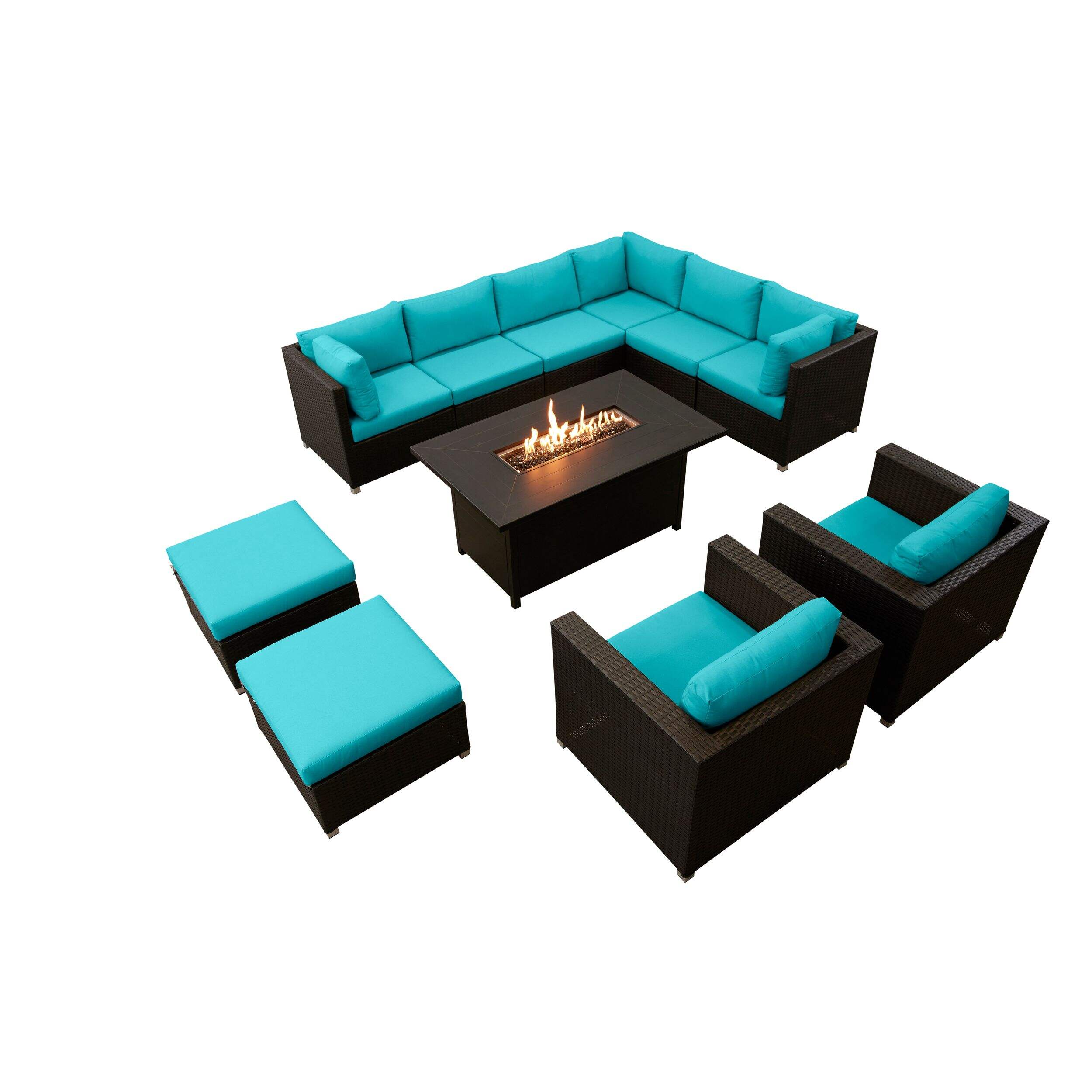 L'ensemble de détente extérieure avec foyer de table et coussins havane TCG Innesbrook est le complément idéal à n'importe quel ensemble de meubles de jardin d'extérieur. Doté d'un cadre en aluminium au fini antirouille peint par poudrage et d'osier en résine de polyéthylène de haute densité, cet ensemble modulaire peut être configuré pour s'adapter à n'importe quels espace et style. L'ensemble comprend des pinces de raccord qui se fixent en dessous pour s'assurer que le canapé reste fixé. Les coussins de 5 po d'épaisseur offrent un confort optimal et préviennent l'affaissement, ce qui les rend parfaits pour se détendre et recevoir des invités. Cet ensemble comprend un canapé modulaire pour 6 personnes, 2 fauteuils club, 2 poufs et un foyer de table au gaz propane pour plus d'ambiance et de chaleur.