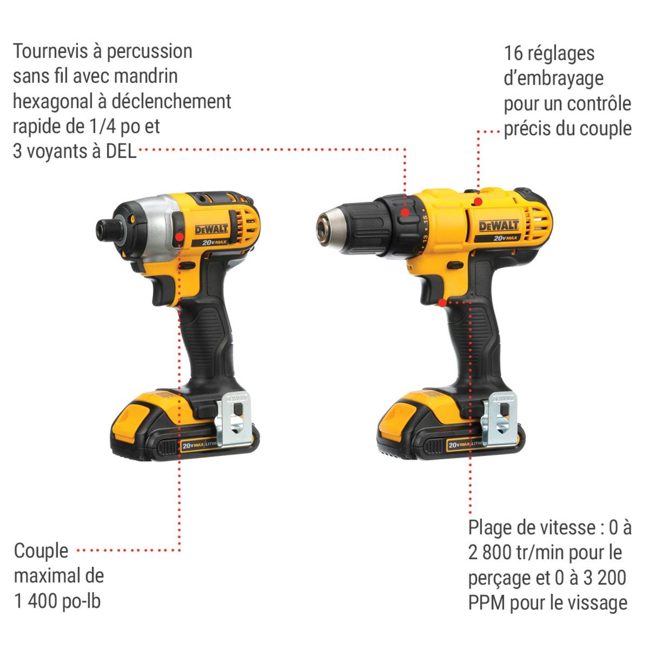 Le combiné de perceuse-tournevis et de tournevis à percussion DEWALT 20V MAX* offre un rendement exceptionnel pour une grande variété de tâches. Ces outils sans fil polyvalents sont conçus pour l'efficacité, permettant aux utilisateurs d'entreprendre n'importe quel projet avec facilité et précision. Parfaits pour le perçage et le vissage, ces outils améliorent la productivité tout en assurant confort et contrôle, ce qui en fait un ajout essentiel à n'importe quelle trousse d'outils professionnelle ou de bricolage. Conçus pour durer, ces outils résistent aux conditions de travail difficiles.