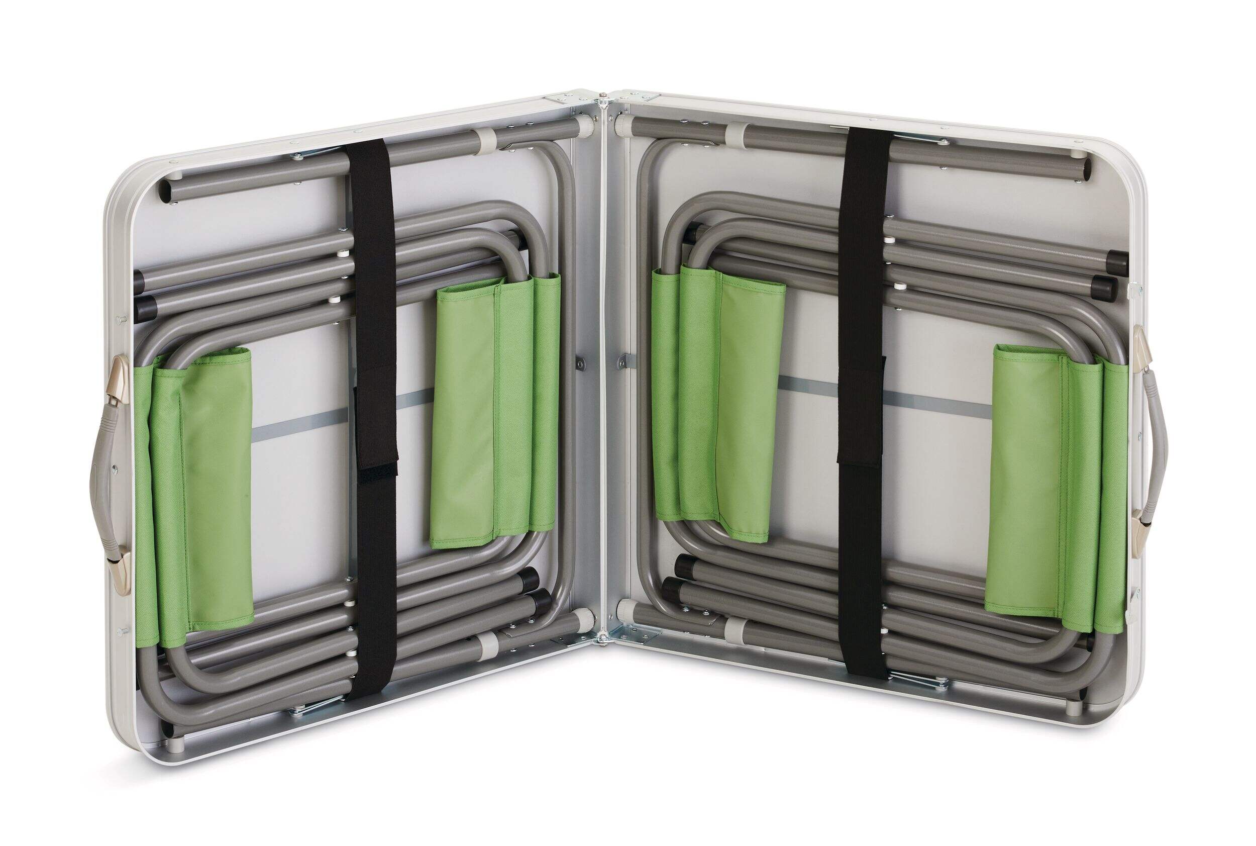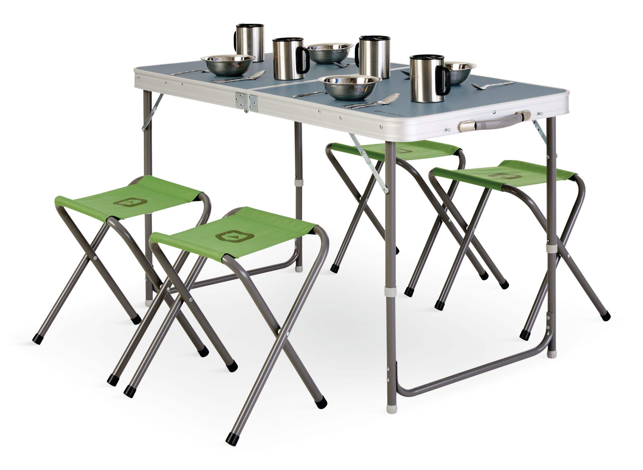 L'ensemble table et tabourets de camping Outbound est une table pliante compacte avec quatre tabourets, idéale pour le camping et les pique-niques.