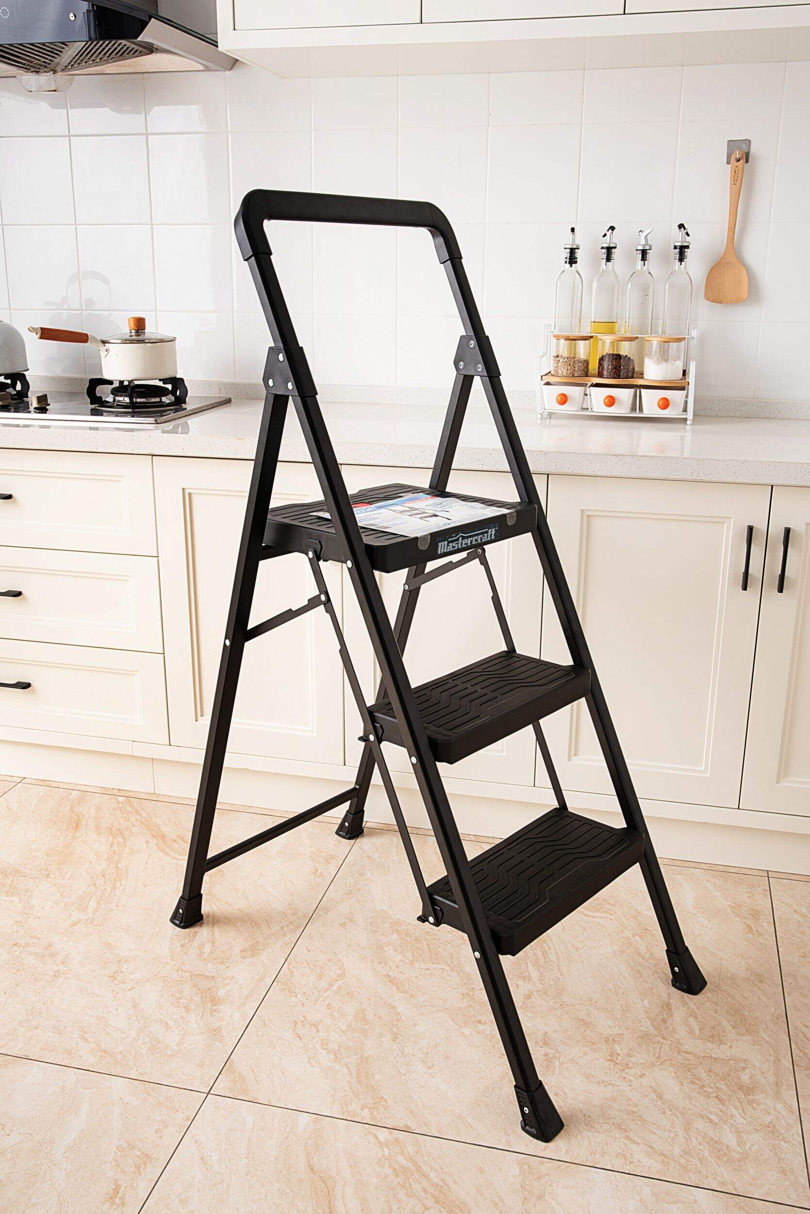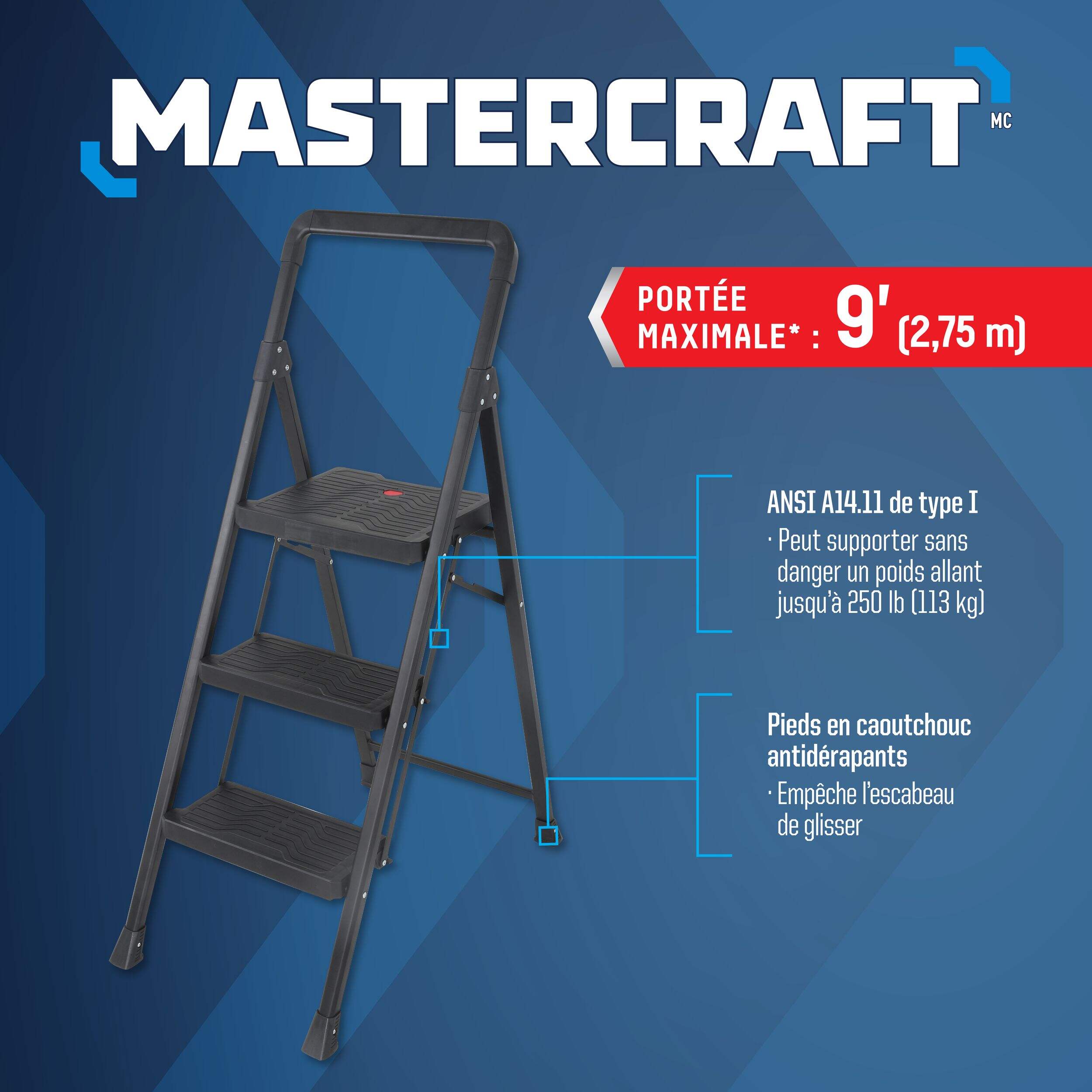 Le tabouret-escabeau pliant Mastercraft à 3 marches est un choix léger pour la maison, le garage ou l'entrepôt. Ce tabouret-escabeau pliant vous permet d'atteindre le sommet de la plupart des armoires ou étagères et la majorité des plafonds résidentiels. Robuste et repliable rapidement, cet escabeau 3 marches est un ajout essentiel à votre trousse d'outils lorsque vous avez besoin d'un peu plus de hauteur.