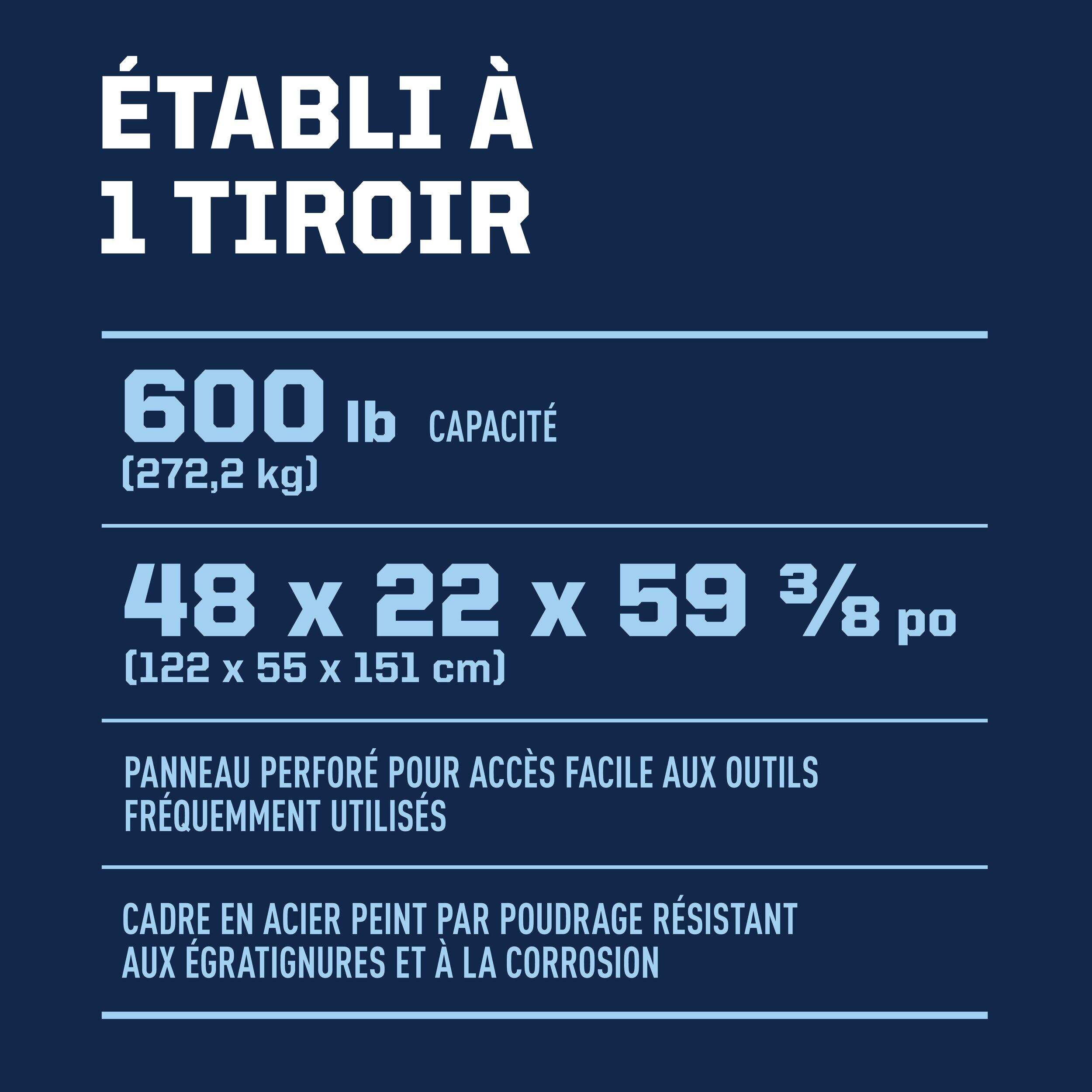 L'établi Mastercraft est conçu pour répondre aux besoins des entrepreneurs professionnels. Cet établi robuste est fabriqué en acier laminé à froid et est doté d'un revêtement en poudre de qualité industrielle pour une durabilité accrue et une résistance à l'usure. La grande surface de travail convient à diverses tâches de construction, tandis que le tiroir à roulement à billes assure un rangement fluide et fiable pour les outils, les manuels et la quincaillerie.