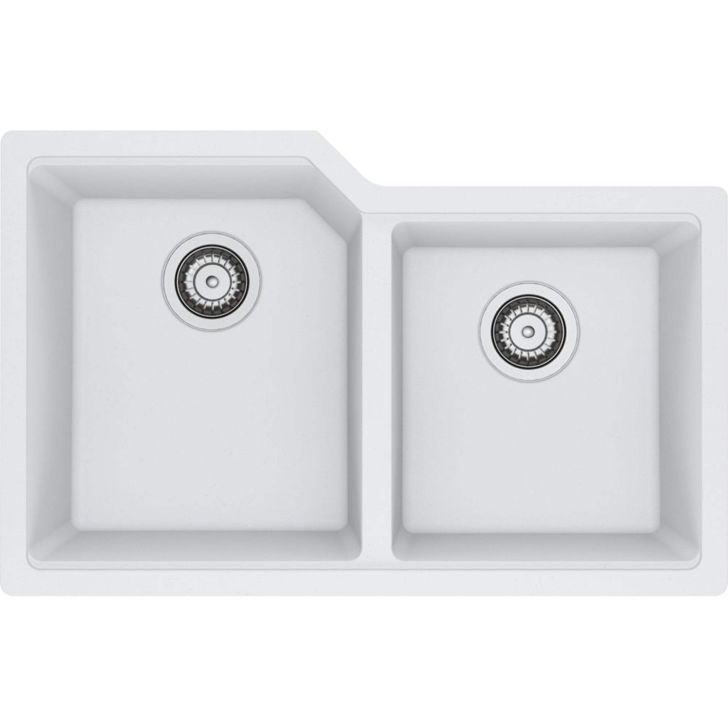 Évier de Cuisine en Granit sous Montée à Double Cuve de 31 pouces x 20 pouces de la Série Urbaine en Blanc Polaire. Fabriqués dans des tons naturels somptueux pour mettre en valeur votre intérieur, les éviers en granit sous plan de Kindred Urban repoussent les taches tenaces, y compris celles de vin, de café et de graisse. De l'eau savonneuse suffit pour nettoyer ces modèles, qui sont dotés d'une protection UV inaltérable pour conserver leur beauté terreuse pendant des années. La fonction d'hygiène Sanitized MD protège votre évier des bactéries responsables des mauvaises odeurs et réduit le temps de nettoyage. Un rail d'accessoires intégré vous permet de faire glisser des accessoires personnalisés sur l'évier pour une préparation des aliments et un nettoyage efficaces. Les accessoires personnalisés sont vendus séparément