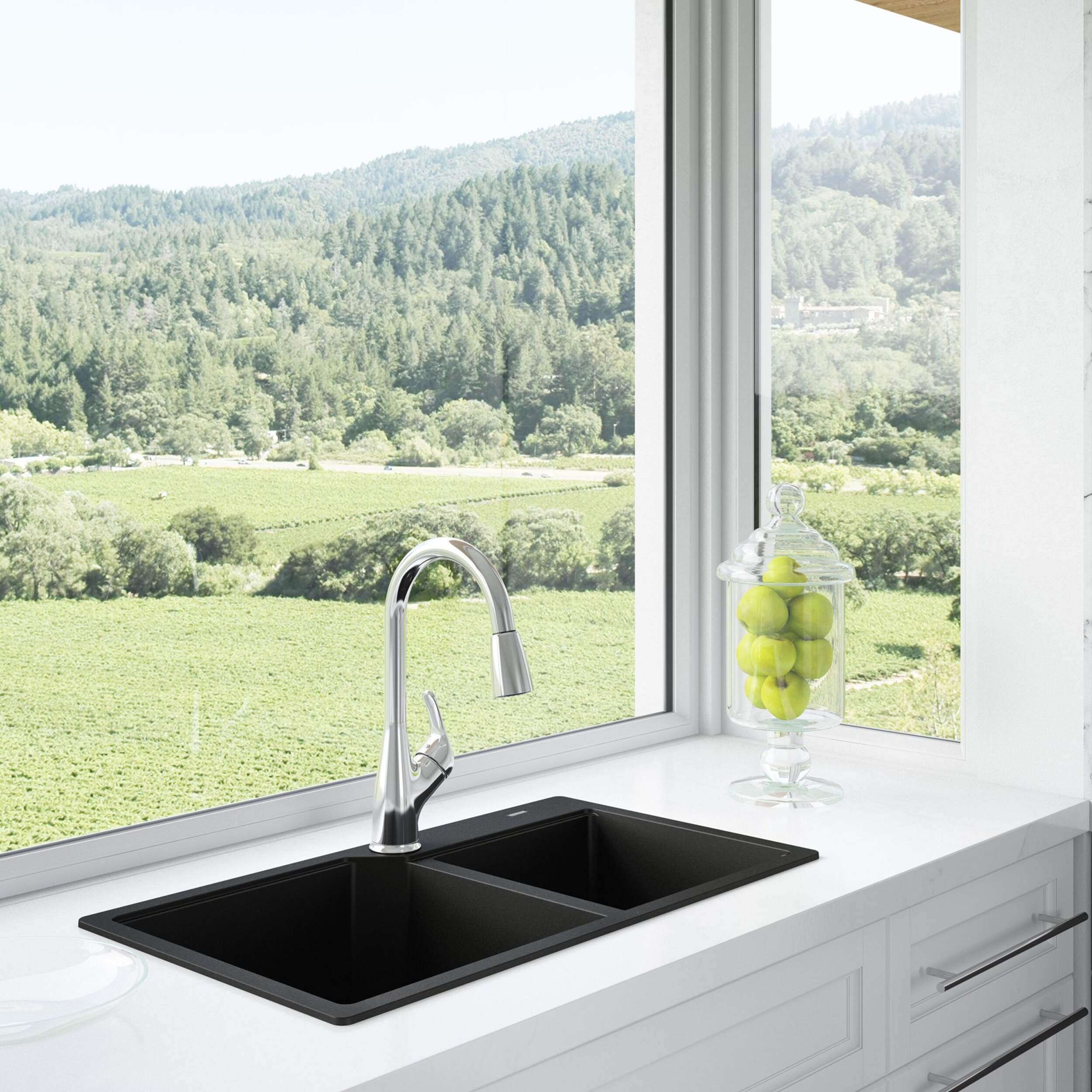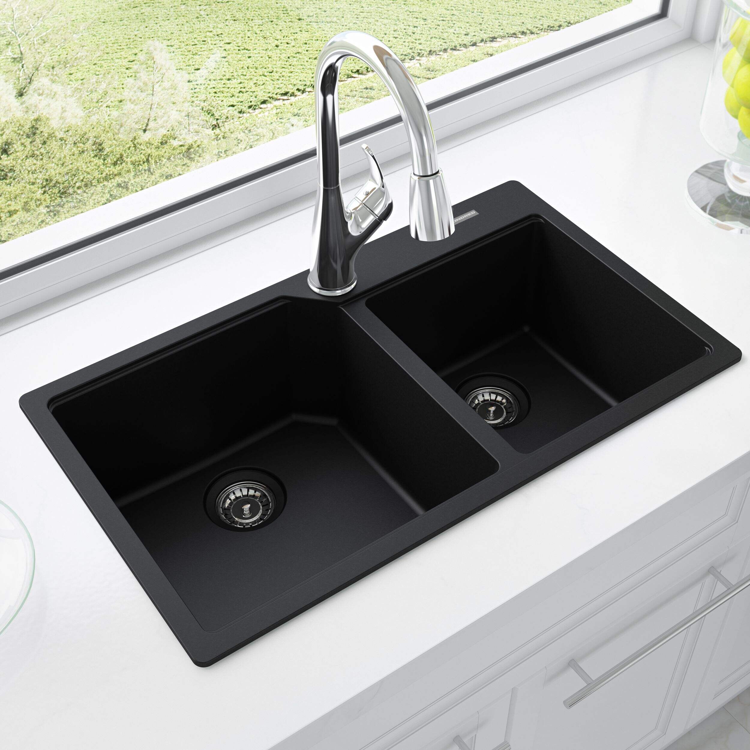 Évier de cuisine double à monture supérieure en granite Kindred Urban qui rehaussera votre cuisine pour qu'elle s'harmonise à n'importe quel style contemporain ou organique d'inspiration moderne