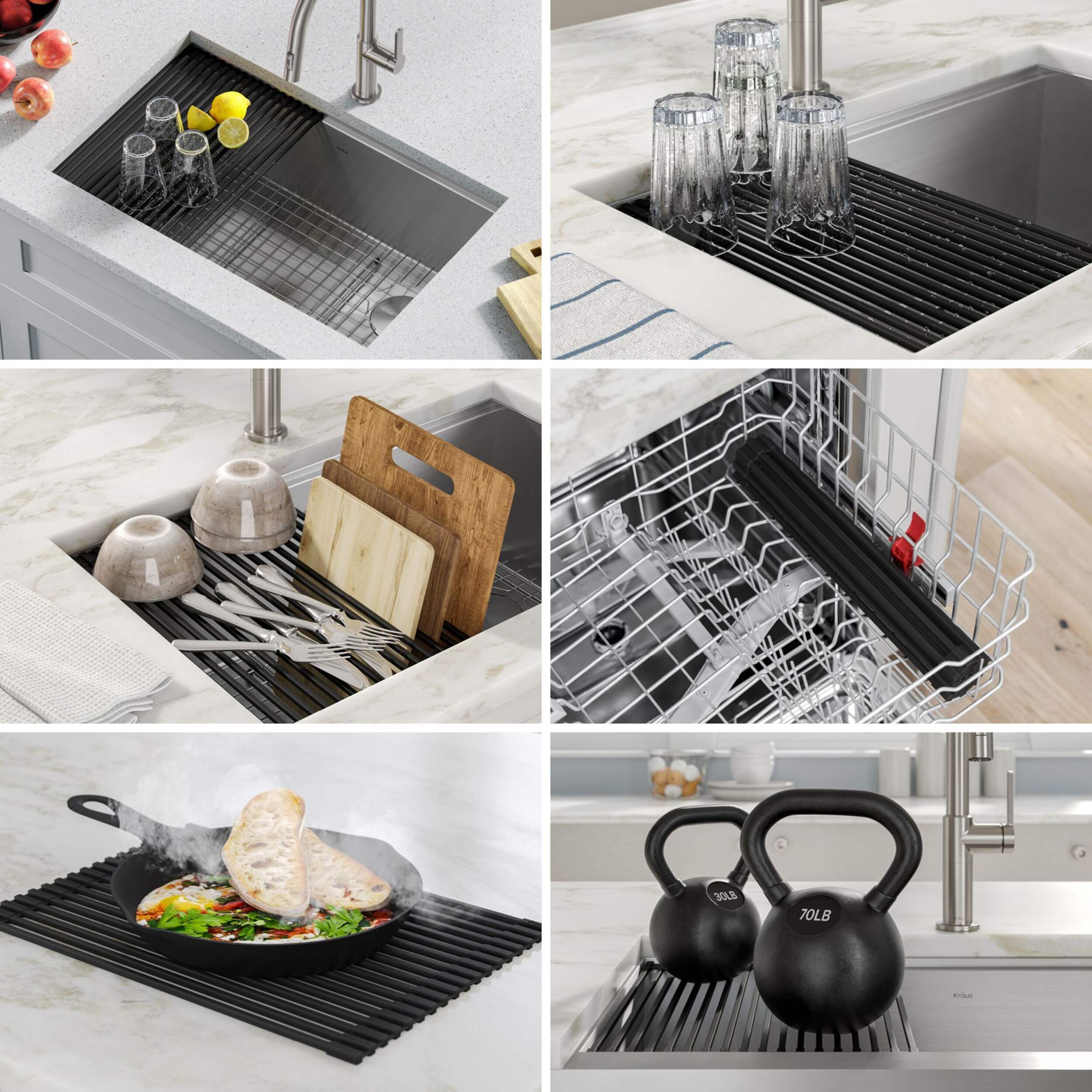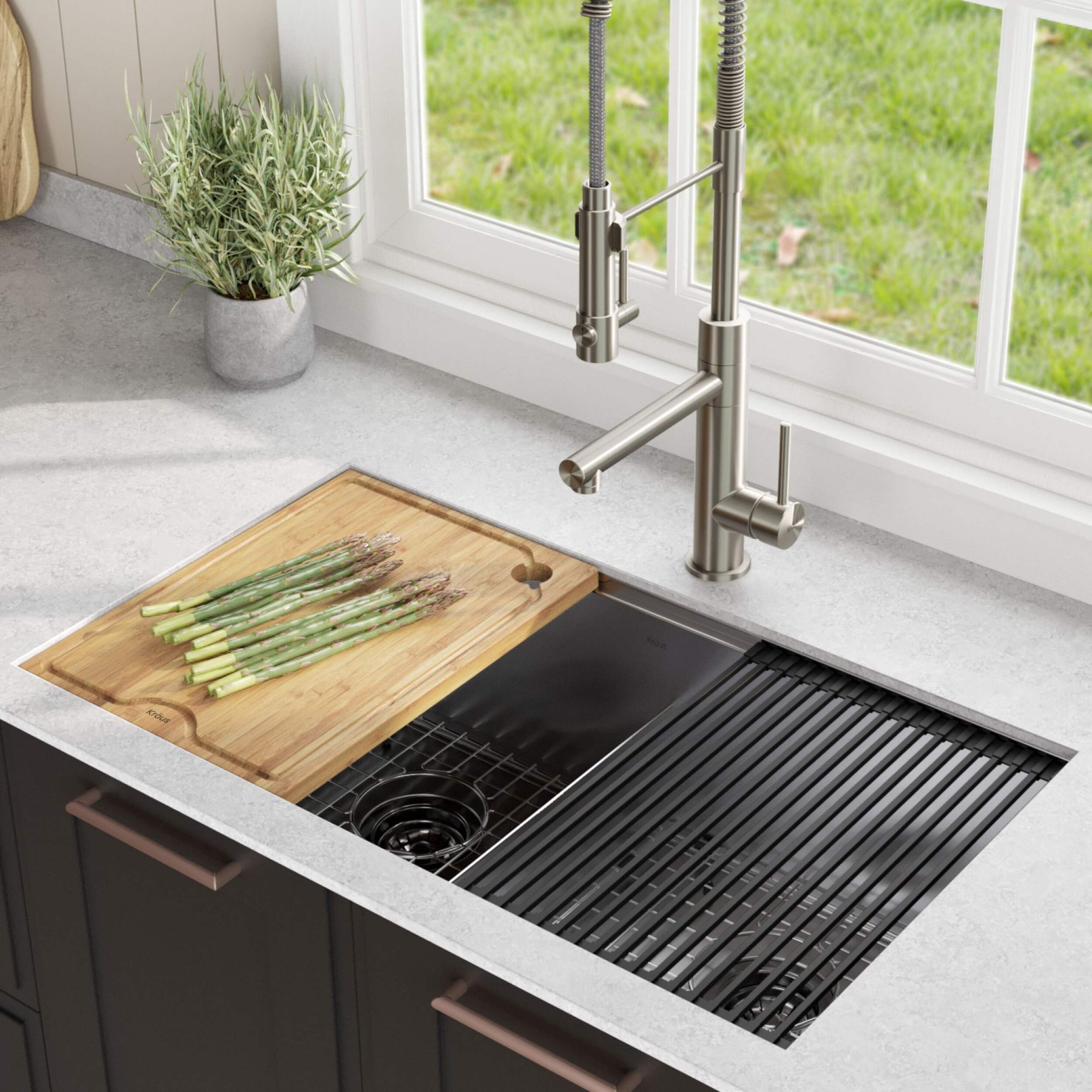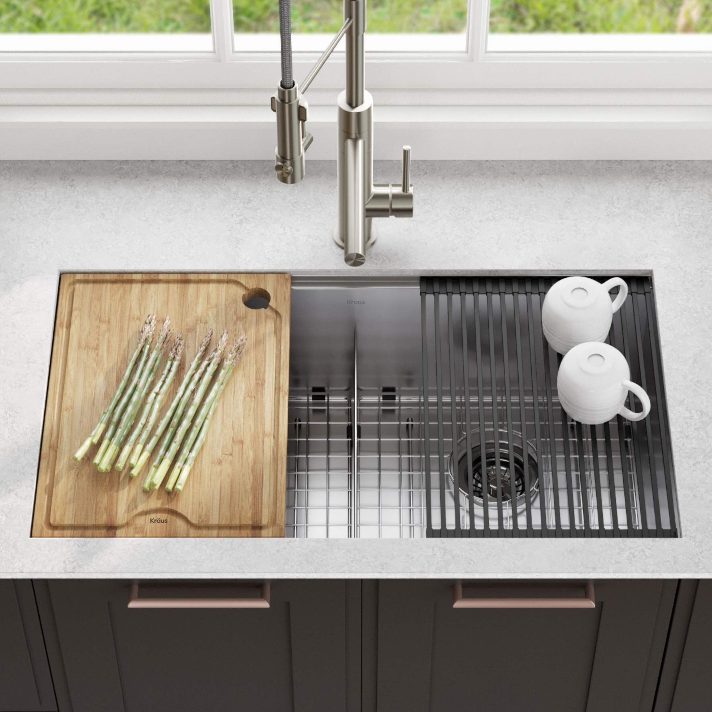 Évier unique Kraus KoreMC avec modules d'extension doté d'un rebord intégré qui vous permet de faire glisser des accessoires personnalisés dans l'évier pour simplifier la préparation et le nettoyage des repas