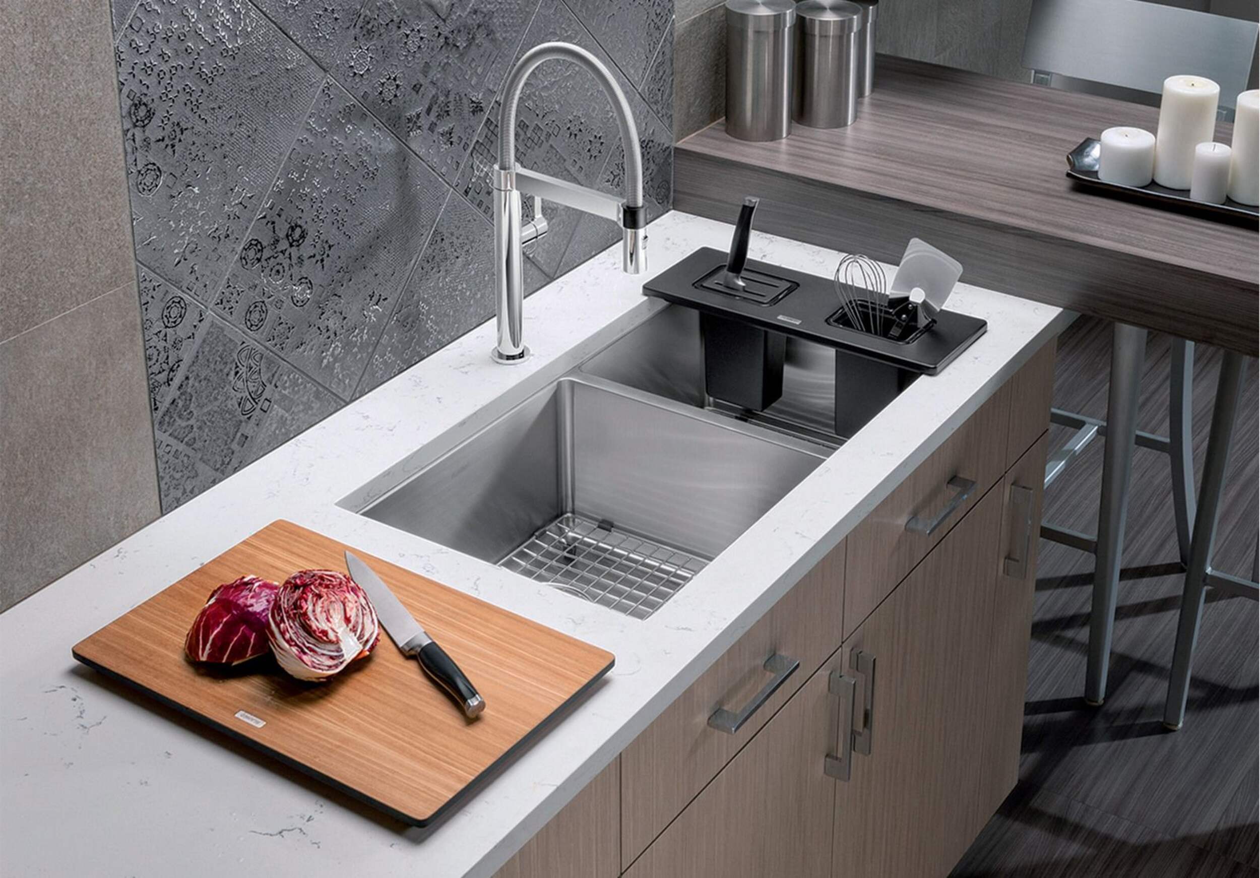 Accessoires facultatifs comprenant des grilles d'évier faites sur mesure (UCS 235971/ 235959), une planche à découper en frêne (UCS 406345) et un tapis de séchage pliable (UCS 238483)