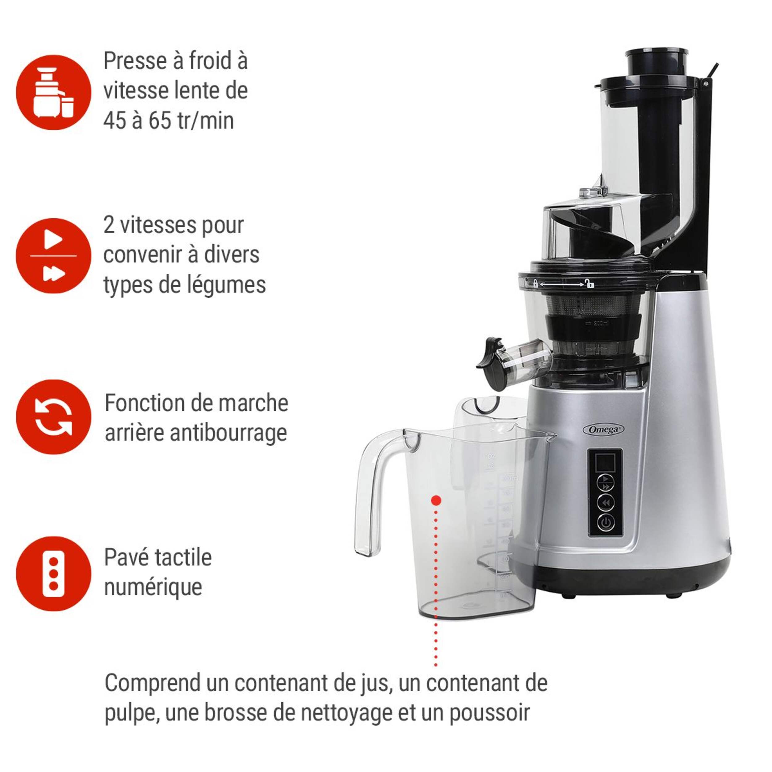 Comprend 1 contenant de jus, 1 contenant de pulpe, une brosse nettoyante et un poussoir