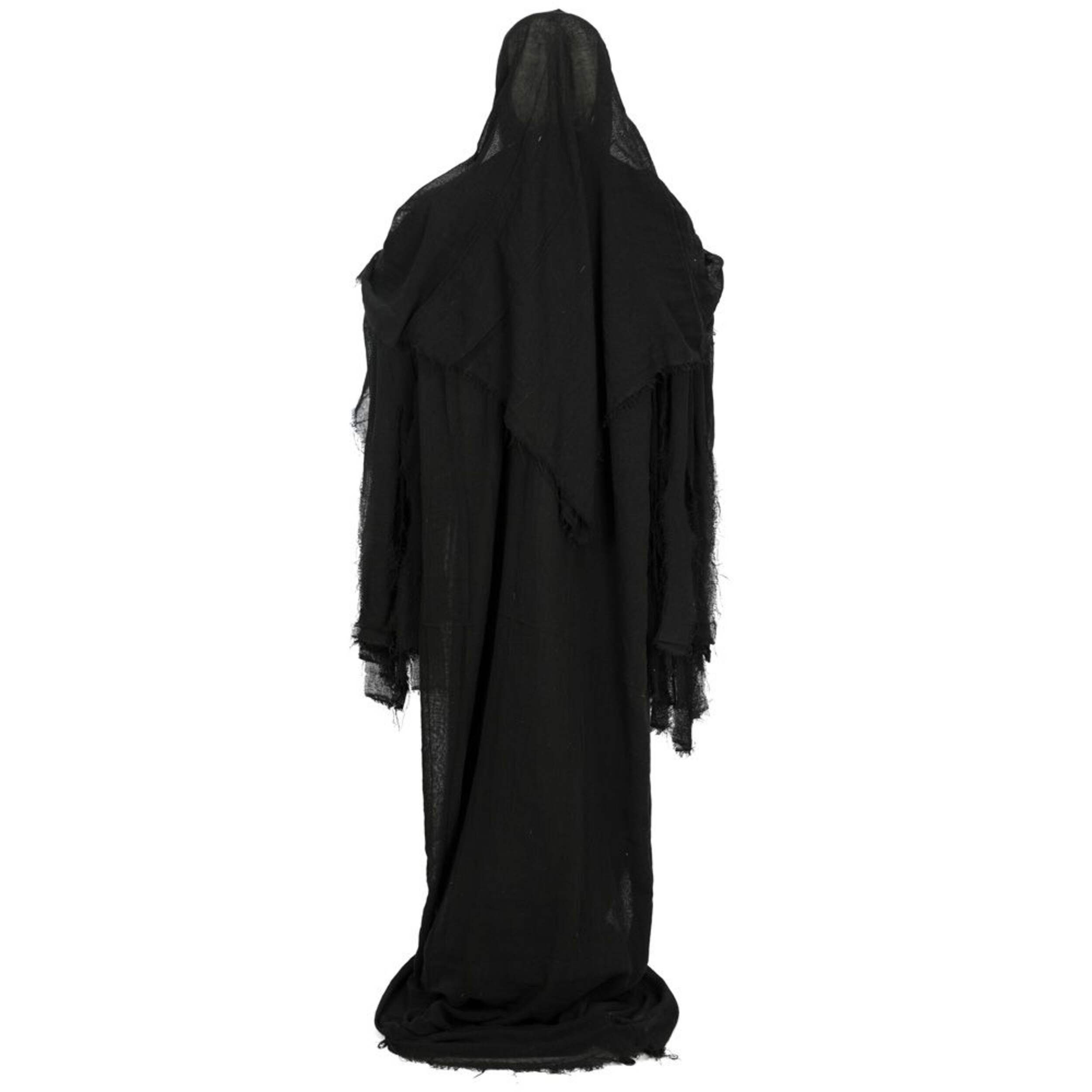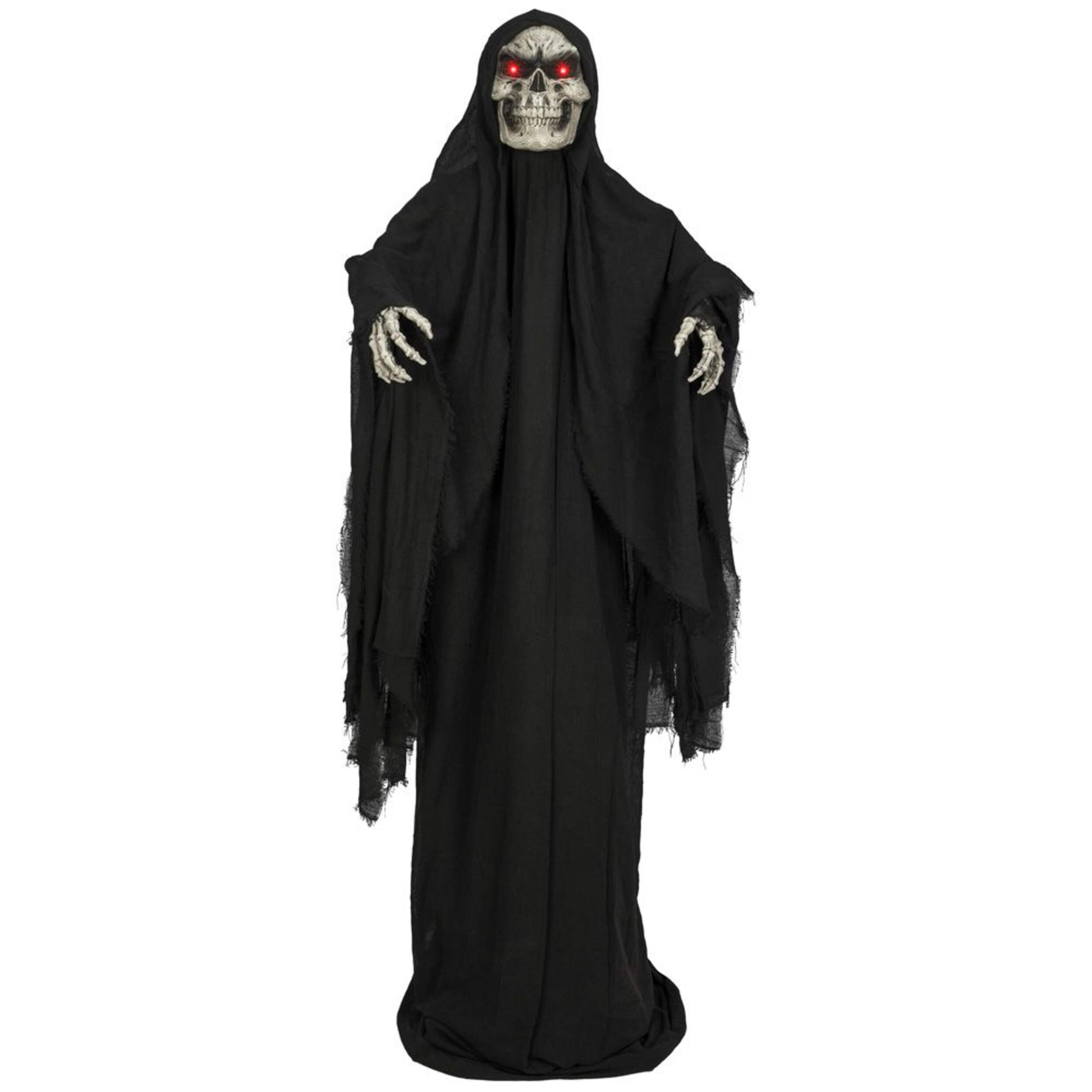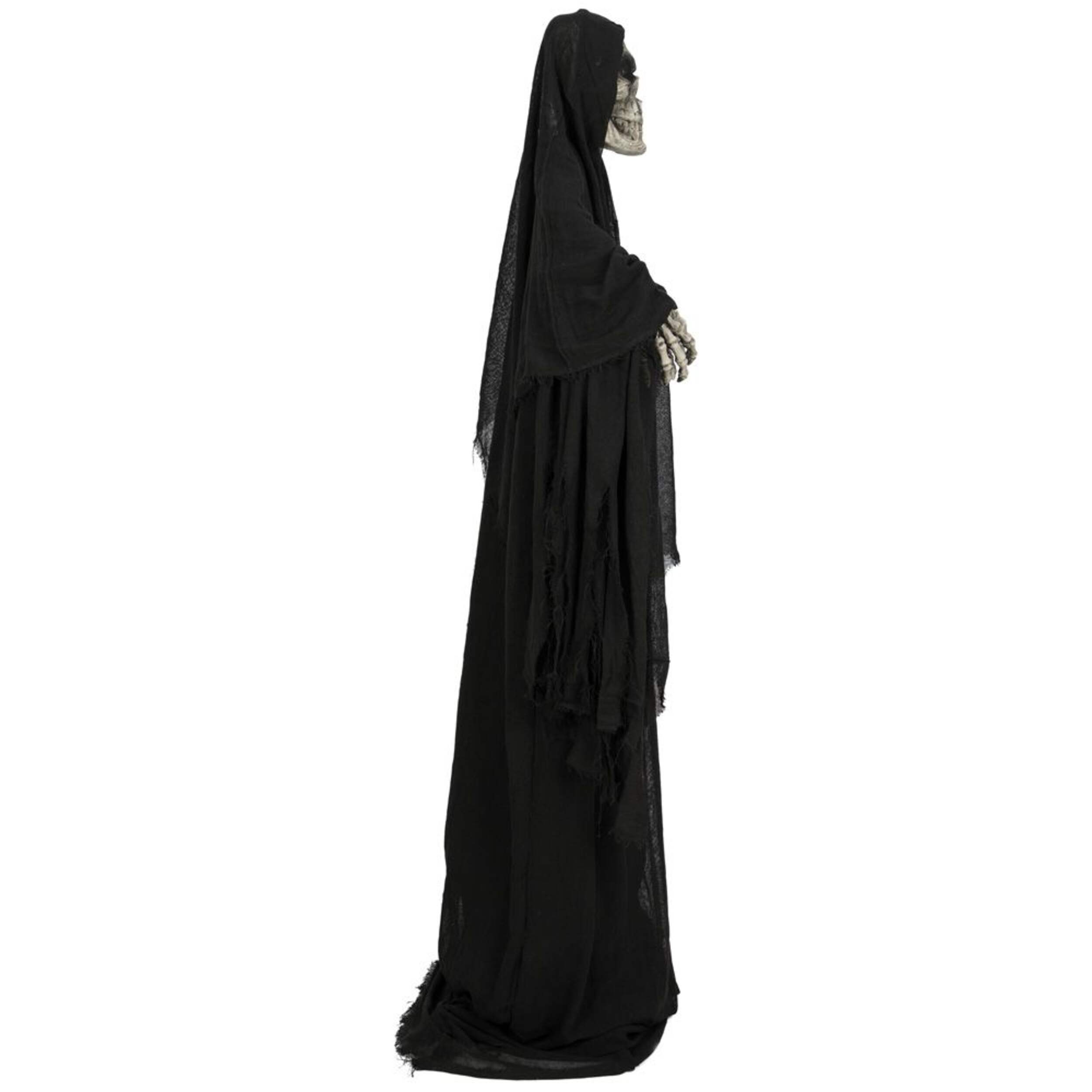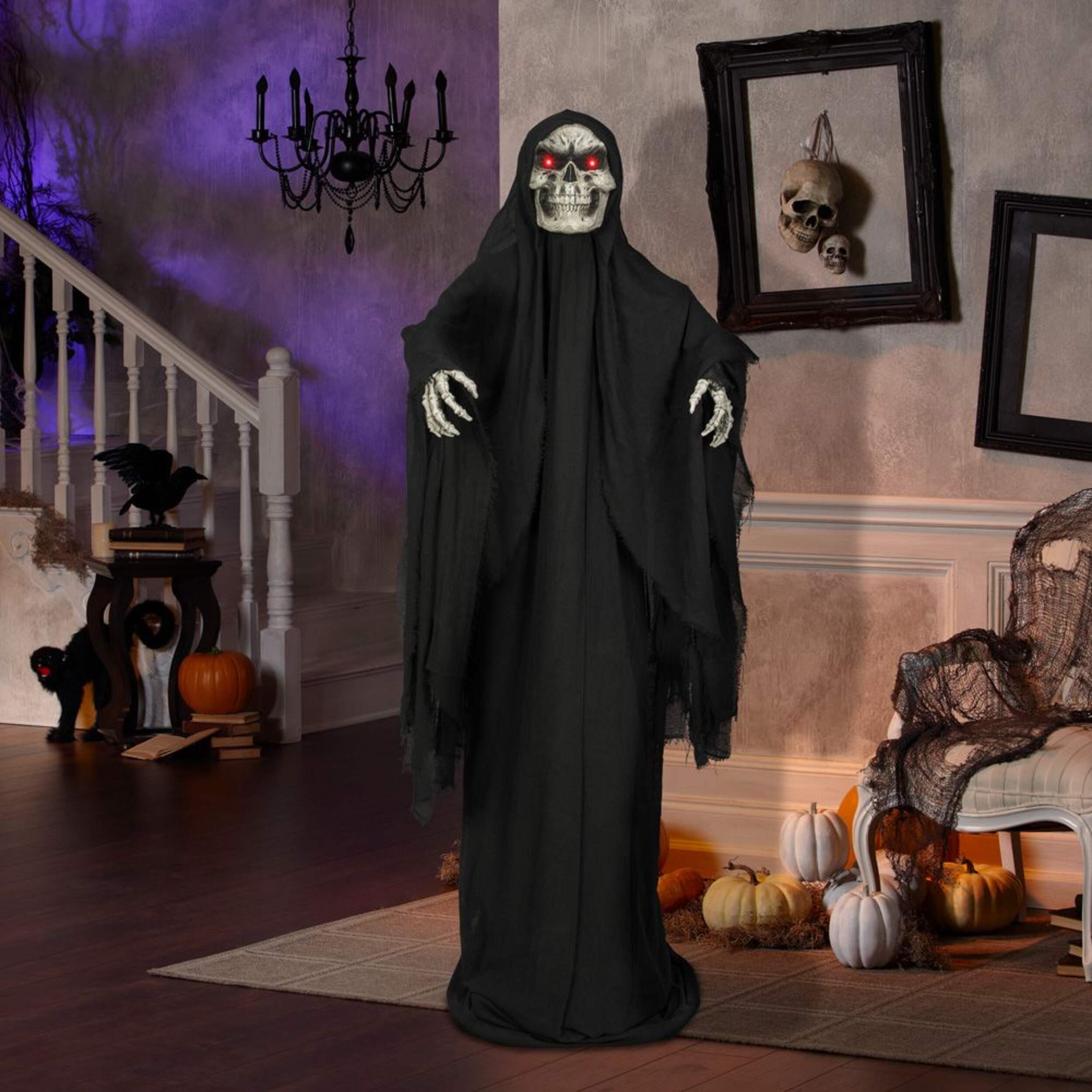 Faucheuse en squelette sinistre animée, grandeur nature, vêtue d'une longue robe noire à capuchon