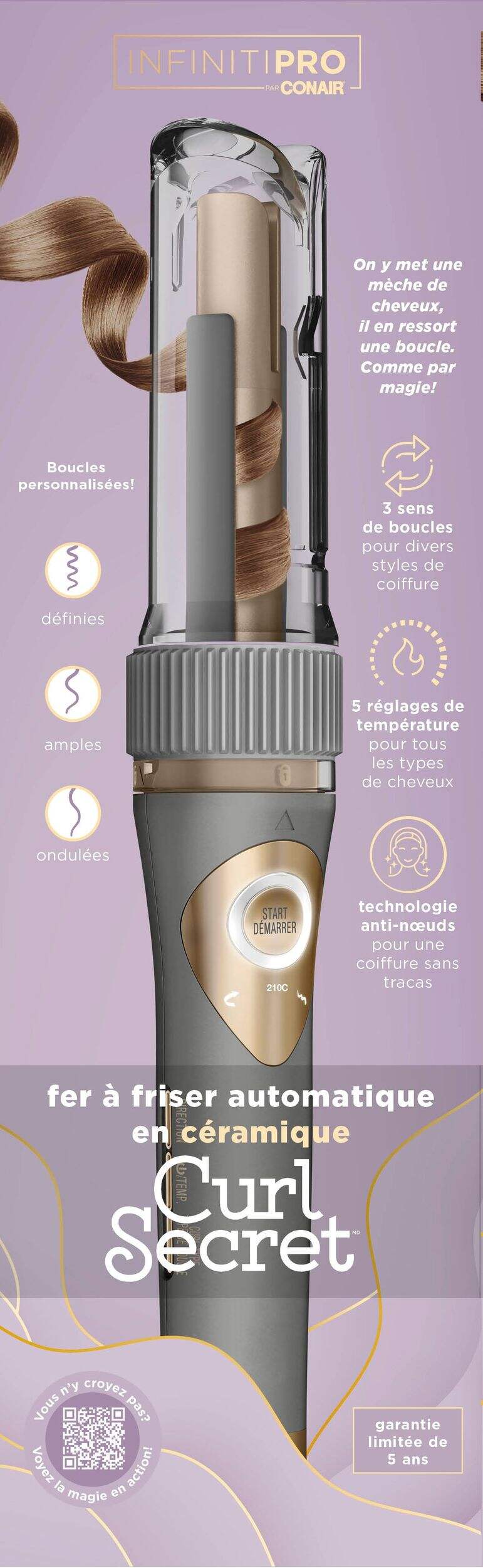 Avec le fer à friser en céramique Conair Curl Secret, obtenez des boucles lisses, brillantes et des vagues parfaites d'une simple pression sur un bouton. Que vous soyez débutante en coiffure ou que vous aimiez simplement essayer de nouveaux styles, le Curl Secret élimine les approximations et est l'outil idéal pour créer de magnifiques boucles sans effort. Offrant une chaleur élevée pour des résultats durables et professionnels, une action de bouclage multidirectionnelle, une chambre à boucle instantanée, plusieurs réglages personnalisables et un affichage numérique facile à lire, le Curl Secret simplifie plus que jamais la création de looks enchanteurs qui captiveront tous ceux que vous côtoyez.