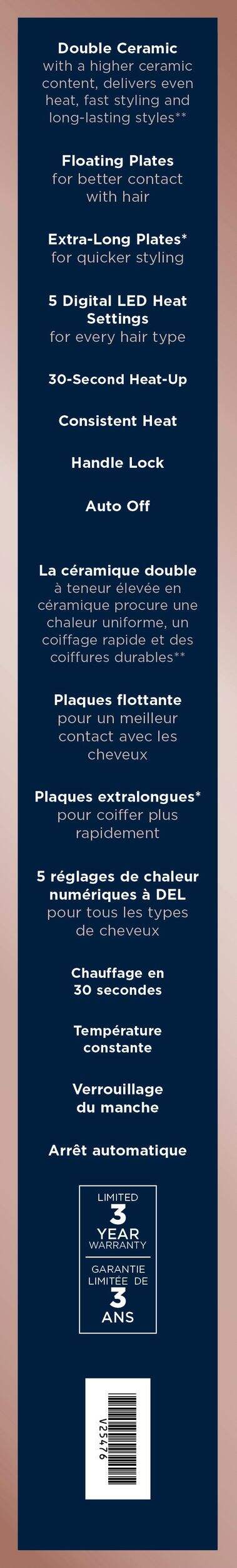• Technologie Double CeramicMC avec une plus grande teneur en céramique produisant une chaleur uniforme et un coiffage rapide pour une brillance sans frisottis