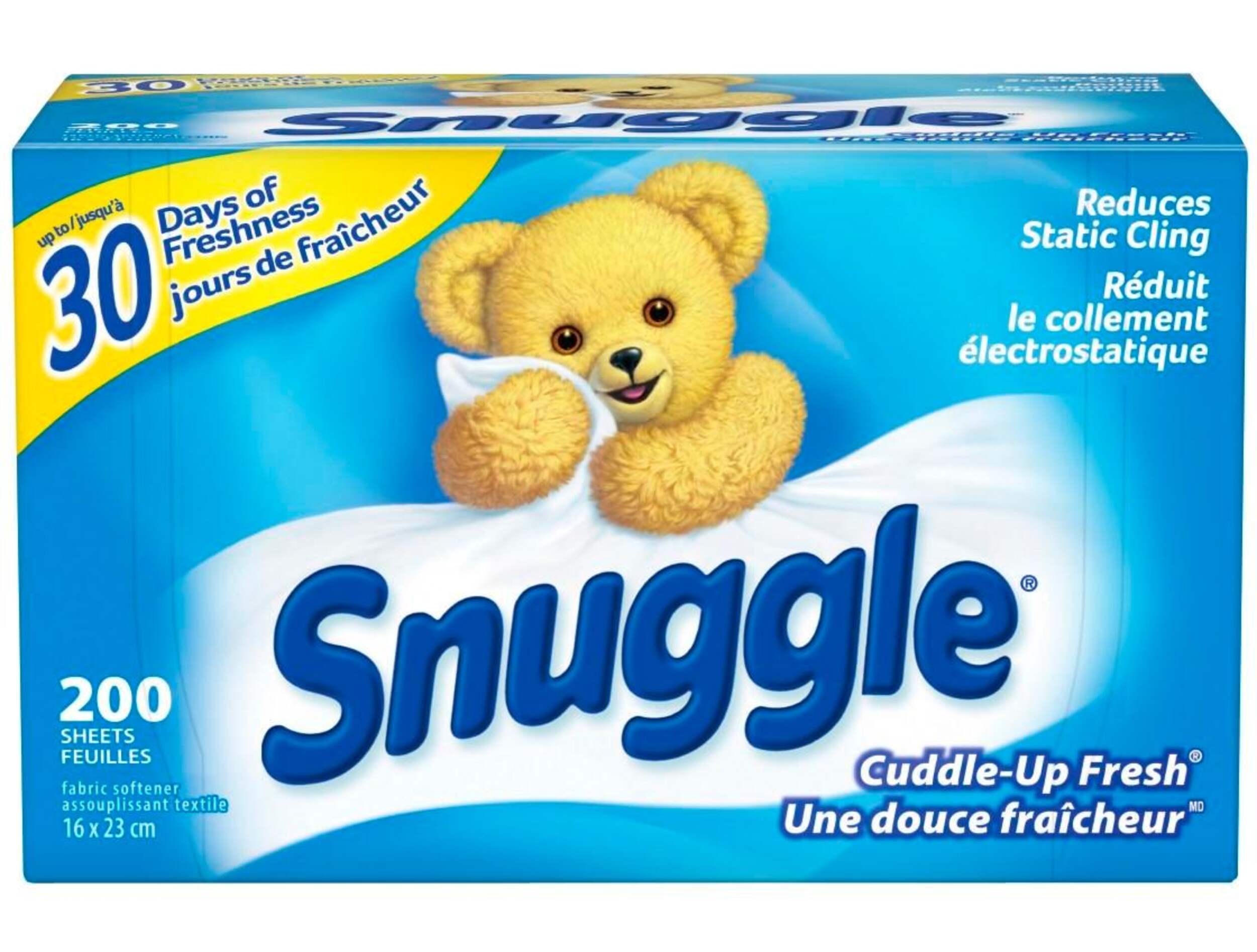 Les feuilles assouplissantes SnuggleMD Une douce fraîcheurMD donne au linge de votre famille la douceur Snuggly SoftnessMD qu'il mérite et une fraîcheur qui dure jusqu'à 30 jours. Les feuilles assouplissantes SnuggleMD Une douce fraîcheurMD rafraîchissent, adoucissent, contrôlent l'électricité statique et aident à réduire les plis! Notre parfum Cuddle-Up FreshMD est un mélange rafraîchissant et propre de notes de fleurs blanches et d'agrumes vert vif qui se blottissent contre des notes boisées chaudes et un musc doux pour une fraîcheur réconfortante et durable.